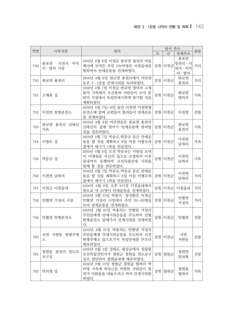 북한 3·1운동 사적지 현황 및 목록❙ 143 연번 사적지명 정의 당시 주소 종류 도 군 상세주소 749 용포면 식전리·비석 리·탑리 시장 1919년 4월 6일 이천군 용포면 창전리 마을 제사에 모여든 주민 100여명은 이천읍내를 향하여서 만세운동을 전개하였다. 강원 이천군 용포면 창전리·식 전리·비석 리·탑리 거리 750 판교면 용천리 1919년 4월 8일 판교면 용천리에서 이만권 등은 3·1운동 만세시위를 독려하였다. 강원 이천군 판교면 용천리 거리 751 고재룡 집 1919년 4월 7일 이천군 판교면 명덕리 고재 룡의 가옥에서 조건봉외 사람들이 모여 문 암리 시장에서 독립만세시위에 참가할 것을 계획하였다. 강원 이천군 판교면 명덕리 가옥 752 이천면 헌병분견소 1919년 4월 7일~8일 동안 이천면 이천헌병 분견소에 앞에 군중들이 몰려들어 만세운동 을 전개하였다. 강원 이천군 이천면 건물 753 판교면 용천리 김태선 가옥 1919년 4월 8일 이만권등은 판교면 용천리 김태선의 집에 찾아가 만세운동에 참여할 것을 권유하였다. 강원 이천군 판교면 용천리 가옥 754 이형모 집 1919년 4월 7일 박송규,박응규 등은 만세운 동을 할 것을 계획하고 8일 아침 이형모의 집에서 태극기 1폭을 만들었다. 강원 이천군 이천면 남좌리 가옥 755 박응규 집 1919년 4월 8일 오전 박응규는 사람을 보내 서 이계원을 자신의 집으로 초청하여 이천 읍내까지 동행하여 조선독립만세 시위를 함께 할 것을 권유하였다. 강원 이천군 이천면 남좌리 가옥 756 이천면 남좌리 1919년 4월 7일 박송규,박응규 등은 만세운 동을 할 것을 계획하고 8일 아침 이형모의 집에서 태극기 1폭을 만들었다. 강원 이천군 이천면 남좌리 거리 757 이천군 이천읍내 1919년 4월 8일 오후 8시경 이천읍내에서 천도교 약 20명이 만세운동을 전개하였다. 강원 이천군 이천읍내 거리 758 안협면 거성리 시장 1919년 4월 10일 박용의·장강환은 이천군 안협면 거성리 시장에서 주민 20~30명을 모아 만세운동을 전개하였다. 강원 이천군 안협면 거성리 거리 759 안협면 헌병분견소 1919년 4월 21일 박용의는 안협면 거성리 주민들에게 만세시위운동을 주도하며 안협 헌병분견소 앞에가서 만세시위를 전개하였 다. 강원 이천군 안협면 건물 760 서면 사현동 헌병주재 소 1919년 4월 21일 박용의는 안협면 거성리 주민들에게 만세시위운동을 주도하며 사견 헌병주재소 앞으로가서 독립만세를 부르다 체포되었다. 강원 이천군 서면 사현동 건물 761 철원읍 관전리 천도교 교구실 1919년 3월 1일 강원도 평강군에서 전달된 조선독립선언서가 철원군 철원읍 천도교구 실로 전달되어 철원읍내에 배포되었다. 강원 철원군 철원면 官田里 건물 762 박의병 집 1919년 3월 10일 철원군 철원읍 월하리 박 의병 가옥에 곽진근을 비롯한 사람들이 몰 려가 이완용을 내놓으라고 하며 만세시위를 하였다. 강원 철원군 철원읍 월하리 가옥
