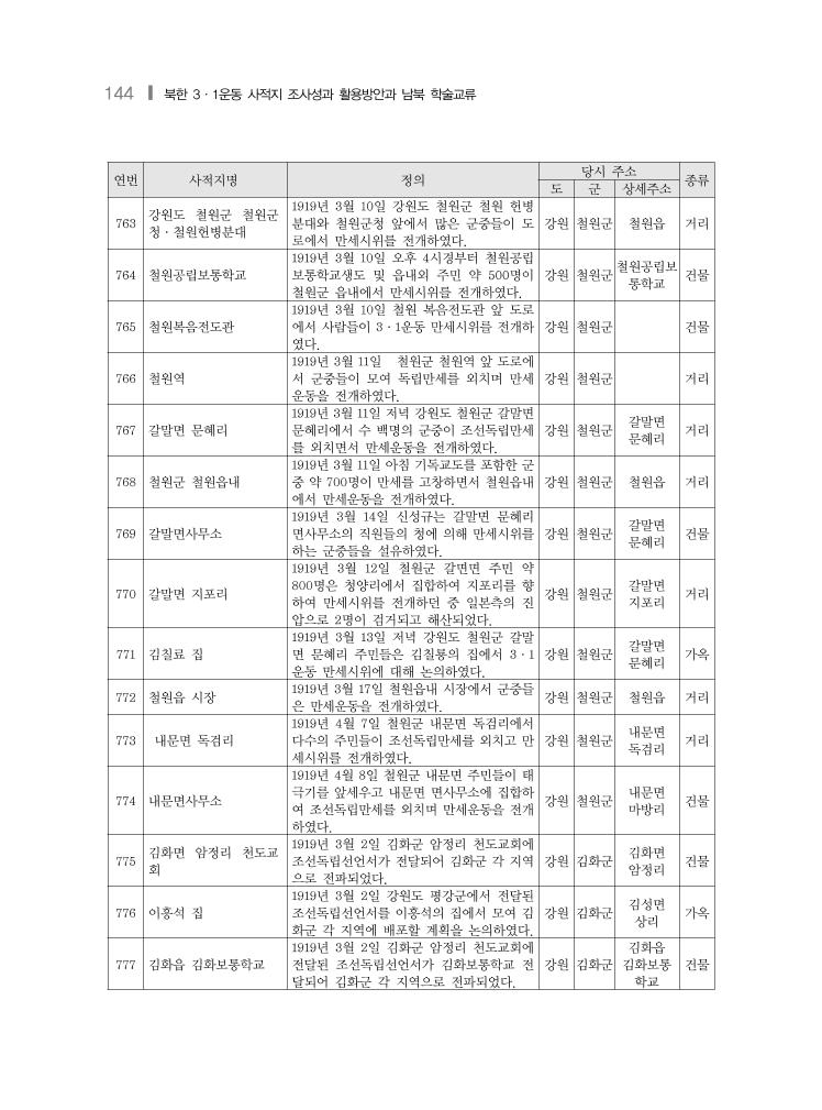 144 ❙ 북한 3·1운동 사적지 조사성과 활용방안과 남북 학술교류 연번 사적지명 정의 당시 주소 종류 도 군 상세주소 763 강원도 철원군 철원군 청·철원헌병분대 1919년 3월 10일 강원도 철원군 철원 헌병 분대와 철원군청 앞에서 많은 군중들이 도 로에서 만세시위를 전개하였다. 강원 철원군 철원읍 거리 764 철원공립보통학교 1919년 3월 10일 오후 4시경부터 철원공립 보통학교생도 및 읍내외 주민 약 500명이 철원군 읍내에서 만세시위를 전개하였다. 강원 철원군 철원공립보 통학교 건물 765 철원복음전도관 1919년 3월 10일 철원 복음전도관 앞 도로 에서 사람들이 3·1운동 만세시위를 전개하 였다. 강원 철원군 건물 766 철원역 1919년 3월 11일 철원군 철원역 앞 도로에 서 군중들이 모여 독립만세를 외치며 만세 운동을 전개하였다. 강원 철원군 거리 767 갈말면 문혜리 1919년 3월 11일 저녁 강원도 철원군 갈말면 문혜리에서 수 백명의 군중이 조선독립만세 를 외치면서 만세운동을 전개하였다. 강원 철원군 갈말면 문혜리 거리 768 철원군 철원읍내 1919년 3월 11일 아침 기독교도를 포함한 군 중 약 700명이 만세를 고창하면서 철원읍내 에서 만세운동을 전개하였다. 강원 철원군 철원읍 거리 769 갈말면사무소 1919년 3월 14일 신성규는 갈말면 문혜리 면사무소의 직원들의 청에 의해 만세시위를 하는 군중들을 설유하였다. 강원 철원군 갈말면 문혜리 건물 770 갈말면 지포리 1919년 3월 12일 철원군 갈면면 주민 약 800명은 청양리에서 집합하여 지포리를 향 하여 만세시위를 전개하던 중 일본측의 진 압으로 2명이 검거되고 해산되었다. 강원 철원군 갈말면 지포리 거리 771 김칠료 집 1919년 3월 13일 저녁 강원도 철원군 갈말 면 문혜리 주민들은 김칠룡의 집에서 3·1 운동 만세시위에 대해 논의하였다. 강원 철원군 갈말면 문혜리 가옥 772 철원읍 시장 1919년 3월 17일 철원읍내 시장에서 군중들 은 만세운동을 전개하였다. 강원 철원군 철원읍 거리 773 내문면 독검리 1919년 4월 7일 철원군 내문면 독검리에서 다수의 주민들이 조선독립만세를 외치고 만 세시위를 전개하였다. 강원 철원군 내문면 독검리 거리 774 내문면사무소 1919년 4월 8일 철원군 내문면 주민들이 태 극기를 앞세우고 내문면 면사무소에 집합하 여 조선독립만세를 외치며 만세운동을 전개 하였다. 강원 철원군 내문면 마방리 건물 775 김화면 암정리 천도교 회 1919년 3월 2일 김화군 암정리 천도교회에 조선독립선언서가 전달되어 김화군 각 지역 으로 전파되었다. 강원 김화군 김화면 암정리 건물 776 이흥석 집 1919년 3월 2일 강원도 평강군에서 전달된 조선독립선언서를 이흥석의 집에서 모여 김 화군 각 지역에 배포할 계획을 논의하였다. 강원 김화군 김성면 상리 가옥 777 김화읍 김화보통학교 1919년 3월 2일 김화군 암정리 천도교회에 전달된 조선독립선언서가 김화보통학교 전 달되어 김화군 각 지역으로 전파되었다. 강원 김화군 김화읍 김화보통 학교 건물