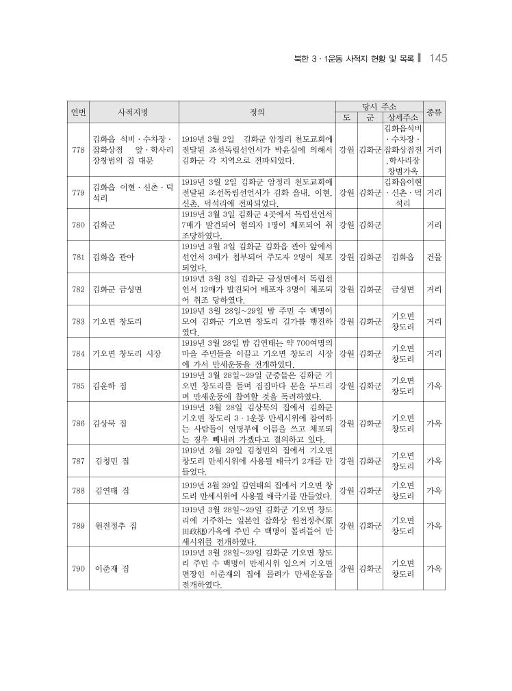 북한 3·1운동 사적지 현황 및 목록❙ 145 연번 사적지명 정의 당시 주소 종류 도 군 상세주소 778 김화읍 석비·수차장· 잡화상점 앞·학사리 장창범의 집 대문 1919년 3월 2일 김화군 암정리 천도교회에 전달된 조선독립선언서가 박윤실에 의해서 김화군 각 지역으로 전파되었다. 강원 김화군 김화읍석비 ·수차장· 잡화상점전 ,학사리장 창범가옥 거리 779 김화읍 이현·신촌·덕 석리 1919년 3월 2일 김화군 암정리 천도교회에 전달된 조선독립선언서가 김화 읍내, 이현, 신촌, 덕석리에 전파되었다. 강원 김화군 김화읍이현 ·신촌·덕 석리 거리 780 김화군 1919년 3월 3일 김화군 4곳에서 독립선언서 7매가 발견되어 혐의자 1명이 체포되어 취 조당하였다. 강원 김화군 거리 781 김화읍 관아 1919년 3월 3일 김화군 김화읍 관아 앞에서 선언서 3매가 첩부되어 주도자 2명이 체포 되었다. 강원 김화군 김화읍 건물 782 김화군 금성면 1919년 3월 3일 김화군 금성면에서 독립선 언서 12매가 발견되어 배포자 3명이 체포되 어 취조 당하였다. 강원 김화군 금성면 거리 783 기오면 창도리 1919년 3월 28일~29일 밤 주민 수 백명이 모여 김화군 기오면 창도리 길가를 행진하 였다. 강원 김화군 기오면 창도리 거리 784 기오면 창도리 시장 1919년 3월 28일 밤 김연태는 약 700여명의 마을 주민들을 이끌고 기오면 창도리 시장 에 가서 만세운동을 전개하였다. 강원 김화군 기오면 창도리 거리 785 김운하 집 1919년 3월 28일~29일 군중들은 김화군 기 오면 창도리를 돌며 집집마다 문을 두드리 며 만세운동에 참여할 것을 독려하였다. 강원 김화군 기오면 창도리 가옥 786 김상묵 집 1919년 3월 28일 김상묵의 집에서 김화군 기오면 창도리 3·1운동 만세시위에 참여하 는 사람들이 연명부에 이름을 쓰고 체포되 는 경우 빼내러 가겠다고 결의하고 있다. 강원 김화군 기오면 창도리 가옥 787 김청민 집 1919년 3월 29일 김청민의 집에서 기오면 창도리 만세시위에 사용될 태극기 2개를 만 들었다. 강원 김화군 기오면 창도리 가옥 788 김연태 집 1919년 3월 29일 김연태의 집에서 기오면 창 도리 만세시위에 사용될 태극기를 만들었다. 강원 김화군 기오면 창도리 가옥 789 원전정추 집 1919년 3월 28일~29일 김화군 기오면 창도 리에 거주하는 일본인 잡화상 원전정추(原 田政槌)가옥에 주민 수 백명이 몰려들어 만 세시위를 전개하였다. 강원 김화군 기오면 창도리 가옥 790 이준재 집 1919년 3월 28일~29일 김화군 기오면 창도 리 주민 수 백명이 만세시위 일으켜 기오면 면장인 이준재의 집에 몰려가 만세운동을 전개하였다. 강원 김화군 기오면 창도리 가옥
