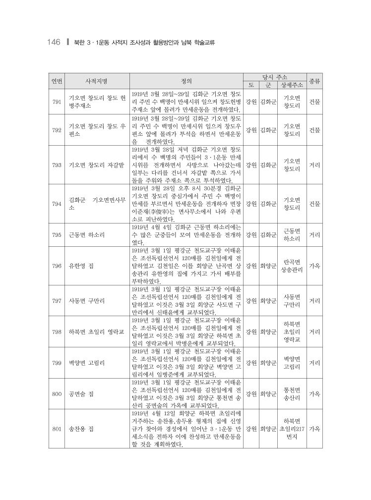 146 ❙ 북한 3·1운동 사적지 조사성과 활용방안과 남북 학술교류 연번 사적지명 정의 당시 주소 종류 도 군 상세주소 791 기오면 창도리 창도 헌 병주재소 1919년 3월 28일~29일 김화군 기오면 창도 리 주민 수 백명이 만세시위 일으켜 창도헌병 주재소 앞에 몰려가 만세운동을 전개하였다. 강원 김화군 기오면 창도리 건물 792 기오면 창도리 창도 우 편소 1919년 3월 28일~29일 김화군 기오면 창도 리 주민 수 백명이 만세시위 일으켜 창도우 편소 앞에 몰려가 투석을 하면서 만세운동 을 전개하였다. 강원 김화군 기오면 창도리 건물 793 기오면 창도리 자갈밭 1919년 3월 28일 저녁 김화군 기오면 창도 리에서 수 백명의 주민들이 3·1운동 만세 시위를 전개하면서 사방으로 나아갔는데 일부는 다리를 건너서 자갈밭 쪽으로 가서 돌을 주워와 주재소 쪽으로 투석하였다. 강원 김화군 기오면 창도리 거리 794 김화군 기오면면사무 소 1919년 3월 28일 오후 8시 30분경 김화군 기오면 창도리 중심가에서 주민 수 백명이 만세를 부르면서 만세운동을 전개하자 면장 이준재(李俊宰)는 면사무소에서 나와 우편 소로 피난하였다. 강원 김화군 기오면 창도리 건물 795 근동면 하소리 1919년 4월 4일 김화군 근동면 하소리에는 수 많은 군중들이 모여 만세운동을 전개하 였다. 강원 김화군 근동면 하소리 거리 796 유한영 집 1919년 3월 1일 평강군 천도교구장 이태윤 은 조선독립선언서 120매를 김천일에게 전 달하였고 김천일은 이를 회양군 난곡면 상 송관리 유한영의 집에 가지고 가서 배부를 부탁하였다. 강원 회양군 란곡면 상송관리 가옥 797 사동면 구만리 1919년 3월 1일 평강군 천도교구장 이태윤 은 조선독립선언서 120매를 김천일에게 전 달하였고 이것은 3월 3일 회양군 사도면 구 만리에서 신태윤에게 교부되었다. 강원 회양군 사동면 구만리 거리 798 하북면 초일리 영락교 1919년 3월 1일 평강군 천도교구장 이태윤 은 조선독립선언서 120매를 김천일에게 전 달하였고 이것은 3월 3일 회양군 하북면 초 일리 영락교에서 박병운에게 교부되었다. 강원 회양군 하북면 초일리 영락교 거리 799 벽양면 고림리 1919년 3월 1일 평강군 천도교구장 이태윤 은 조선독립선언서 120매를 김천일에게 전 달하였고 이것은 3월 3일 회양군 벽양면 고 림리에서 임병준에게 교부되었다. 강원 회양군 벽양면 고림리 거리 800 공면술 집 1919년 3월 1일 평강군 천도교구장 이태윤 은 조선독립선언서 120매를 김천일에게 전 달하였고 이것은 3월 3일 회양군 통천면 송 산리 공면술의 가옥에 교부되었다. 강원 회양군 통천면 송산리 가옥 801 송찬용 집 1919년 4월 12일 회양군 하북면 초일리에 거주하는 송찬용,송두용 형제의 집에 신영 규가 찾아와 경성에서 일어난 3·1운동 만 세소식을 전하자 이에 찬성하고 만세운동을 할 것을 계획하였다. 강원 회양군 하북면 초일리217 번지 가옥