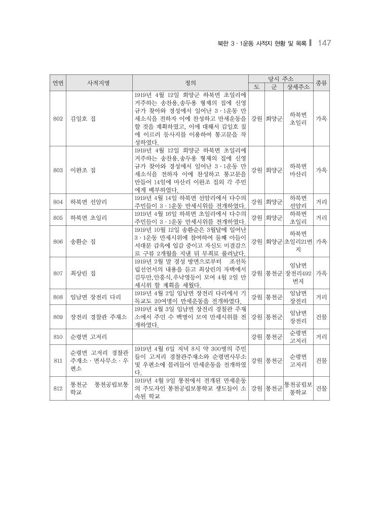 북한 3·1운동 사적지 현황 및 목록❙ 147 연번 사적지명 정의 당시 주소 종류 도 군 상세주소 802 김일호 집 1919년 4월 12일 회양군 하북면 초일리에 거주하는 송찬용,송두용 형제의 집에 신영 규가 찾아와 경성에서 일어난 3·1운동 만 세소식을 전하자 이에 찬성하고 만세운동을 할 것을 계획하였고, 이에 대해서 김일호 집 에 이르러 등사지를 이용하여 통고문을 작 성하였다. 강원 회양군 하북면 초일리 가옥 803 이완조 집 1919년 4월 12일 회양군 하북면 초일리에 거주하는 송찬용,송두용 형제의 집에 신영 규가 찾아와 경성에서 일어난 3·1운동 만 세소식을 전하자 이에 찬성하고 통고문을 만들어 14일에 마산리 이완조 집외 각 주민 에게 배부하였다. 강원 회양군 하북면 마산리 가옥 804 하북면 선암리 1919년 4월 14일 하북면 선암리에서 다수의 주민들이 3·1운동 만세시위를 전개하였다. 강원 회양군 하북면 선암리 거리 805 하북면 초일리 1919년 4월 16일 하북면 초일리에서 다수의 주민들이 3·1운동 만세시위를 전개하였다. 강원 회양군 하북면 초일리 거리 806 송환순 집 1919년 10월 12일 송환순은 3월달에 일어난 3·1운동 만세시위에 참여하여 둘째 아들이 서대문 감옥에 입감 중이고 자신도 미결감으 로 구류 2개월을 지낸 뒤 무죄로 풀려났다. 강원 회양군 하북면 초일리21번 지 가옥 807 최상린 집 1919년 2월 말 경성 방면으로부터 조선독 립선언서의 내용을 듣고 최상린의 자택에서 김두만,안흥식,우낙영등이 모여 4월 2일 만 세시위 할 계획을 세웠다. 강원 통천군 임남면 장전리492 번지 가옥 808 임남면 장전리 다리 1919년 4월 2일 임남면 장전리 다리에서 기 독교도 20여명이 만세운동을 전개하였다. 강원 통천군 임남면 장전리 거리 809 장전리 경찰관 주재소 1919년 4월 3일 임남면 장전리 경찰관 주재 소에서 주민 수 백명이 모여 만세시위를 전 개하였다. 강원 통천군 임남면 장전리 건물 810 순령면 고저리 강원 통천군 순령면 고저리 거리 811 순령면 고저리 경찰관 주재소·면사무소·우 편소 1919년 4월 6일 저녁 8시 약 300명의 주민 들이 고저리 경찰관주재소와 순령면사무소 및 우편소에 몰려들어 만세운동을 전개하였 다. 강원 통천군 순령면 고저리 건물 812 통천군 통천공립보통 학교 1919년 4월 9일 통천에서 전개된 만세운동 의 주도자인 통천공립보통학교 생도들이 소 속된 학교 강원 통천군 통천공립보 통학교 건물