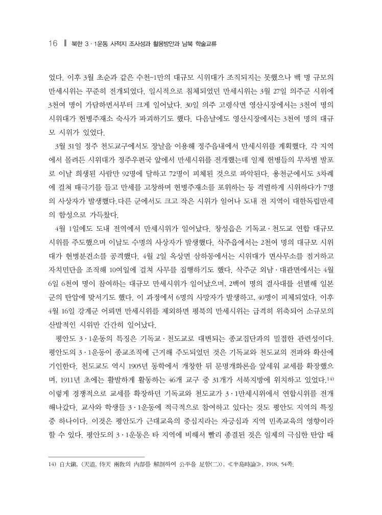 16 ❙ 북한 3·1운동 사적지 조사성과 활용방안과 남북 학술교류 었다. 이후 3월 초순과 같은 수천~1만의 대규모 시위대가 조직되지는 못했으나 백 명 규모의 만세시위는 꾸준히 전개되었다. 일시적으로 침체되었던 만세시위는 3월 27일 의주군 시위에 3천여 명이 가담하면서부터 크게 일어났다. 30일 의주 고령삭면 영산시장에서는 3천여 명의 시위대가 헌병주재소 숙사가 파괴하기도 했다. 다음날에도 영산시장에서는 3천여 명의 대규 모 시위가 있었다. 3월 31일 정주 천도교구에서도 장날을 이용해 정주읍내에서 만세시위를 계획했다. 각 지역 에서 몰려든 시위대가 정주우편국 앞에서 만세시위를 전개했는데 일제 헌병들의 무차별 발포 로 이날 희생된 사람만 92명에 달하고 72명이 피체된 것으로 파악된다. 용천군에서도 3차례 에 걸쳐 태극기를 들고 만세를 고창하며 헌병주재소를 포위하는 등 격렬하게 시위하다가 7명 의 사상자가 발생했다.다른 군에서도 크고 작은 시위가 일어나 도내 전 지역이 대한독립만세 의 함성으로 가득찼다. 4월 1일에도 도내 전역에서 만세시위가 일어났다. 창성읍은 기독교·천도교 연합 대규모 시위를 주도했으며 이날도 수명의 사상자가 발생했다. 삭주읍에서는 2천여 명의 대규모 시위 대가 헌병분견소를 공격했다. 4월 2일 옥상면 삼하동에서는 시위대가 면사무소를 점거하고 자치민단을 조직해 10여일에 걸쳐 사무를 집행하기도 했다. 삭주군 외남·대관면에서는 4월 6일 6천여 명이 참여하는 대규모 만세시위가 일어났으며, 2백여 명의 결사대를 선별해 일본 군의 탄압에 맞서기도 했다. 이 과정에서 6명의 사망자가 발생하고, 40명이 피체되었다. 이후 4월 16일 강계군 어뢰면 만세시위를 제외하면 평북의 만세시위는 급격히 위축되어 소규모의 산발적인 시위만 간간히 일어났다. 평안도 3·1운동의 특징은 기독교·천도교로 대변되는 종교집단과의 밀접한 관련성이다. 평안도의 3·1운동이 종교조직에 근거해 주도되었던 것은 기독교와 천도교의 전파와 확산에 기인한다. 천도교도 역시 1905년 동학에서 개창한 뒤 문명개화론을 앞세워 교세를 확장했으 며, 1911년 초에는 활발하게 활동하는 46개 교구 중 31개가 서북지방에 위치하고 있었다.14) 이렇게 경쟁적으로 교세를 확장하던 기독교와 천도교가 3·1만세시위에서 연합시위를 전개 해나갔다. 교사와 학생들 3·1운동에 적극적으로 참여하고 있다는 것도 평안도 지역의 특징 중 하나이다. 이것은 평안도가 근대교육의 중심지라는 자긍심과 지역 민족교육의 영향이라 할 수 있다. 평안도의 3·1운동은 타 지역에 비해서 빨리 종결된 것은 일제의 극심한 탄압 때 14) 白大鎭, <天道, 侍天 兩敎의 內部를 解剖하여 公平을 足함(二)>, ≪半島時論≫, 1918, 54쪽.