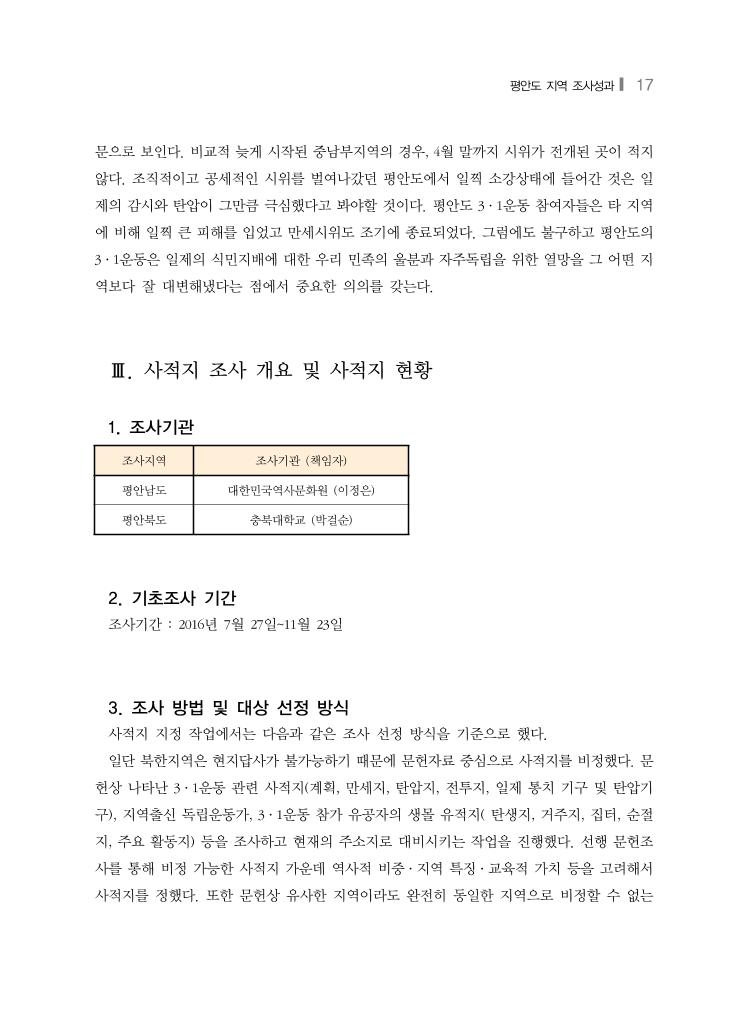 평안도 지역 조사성과❙ 17 조사지역 조사기관 (책임자) 평안남도 대한민국역사문화원 (이정은) 평안북도 충북대학교 (박걸순) 문으로 보인다. 비교적 늦게 시작된 중남부지역의 경우, 4월 말까지 시위가 전개된 곳이 적지 않다. 조직적이고 공세적인 시위를 벌여나갔던 평안도에서 일찍 소강상태에 들어간 것은 일 제의 감시와 탄압이 그만큼 극심했다고 봐야할 것이다. 평안도 3·1운동 참여자들은 타 지역 에 비해 일찍 큰 피해를 입었고 만세시위도 조기에 종료되었다. 그럼에도 불구하고 평안도의 3·1운동은 일제의 식민지배에 대한 우리 민족의 울분과 자주독립을 위한 열망을 그 어떤 지 역보다 잘 대변해냈다는 점에서 중요한 의의를 갖는다. Ⅲ. 사적지 조사 개요 및 사적지 현황 1. 조사기관 2. 기초조사 기간 조사기간 : 2016년 7월 27일~11월 23일 3. 조사 방법 및 대상 선정 방식 사적지 지정 작업에서는 다음과 같은 조사 선정 방식을 기준으로 했다. 일단 북한지역은 현지답사가 불가능하기 때문에 문헌자료 중심으로 사적지를 비정했다. 문 헌상 나타난 3·1운동 관련 사적지(계획, 만세지, 탄압지, 전투지, 일제 통치 기구 및 탄압기 구), 지역출신 독립운동가, 3·1운동 참가 유공자의 생몰 유적지( 탄생지, 거주지, 집터, 순절 지, 주요 활동지) 등을 조사하고 현재의 주소지로 대비시키는 작업을 진행했다. 선행 문헌조 사를 통해 비정 가능한 사적지 가운데 역사적 비중·지역 특징·교육적 가치 등을 고려해서 사적지를 정했다. 또한 문헌상 유사한 지역이라도 완전히 동일한 지역으로 비정할 수 없는