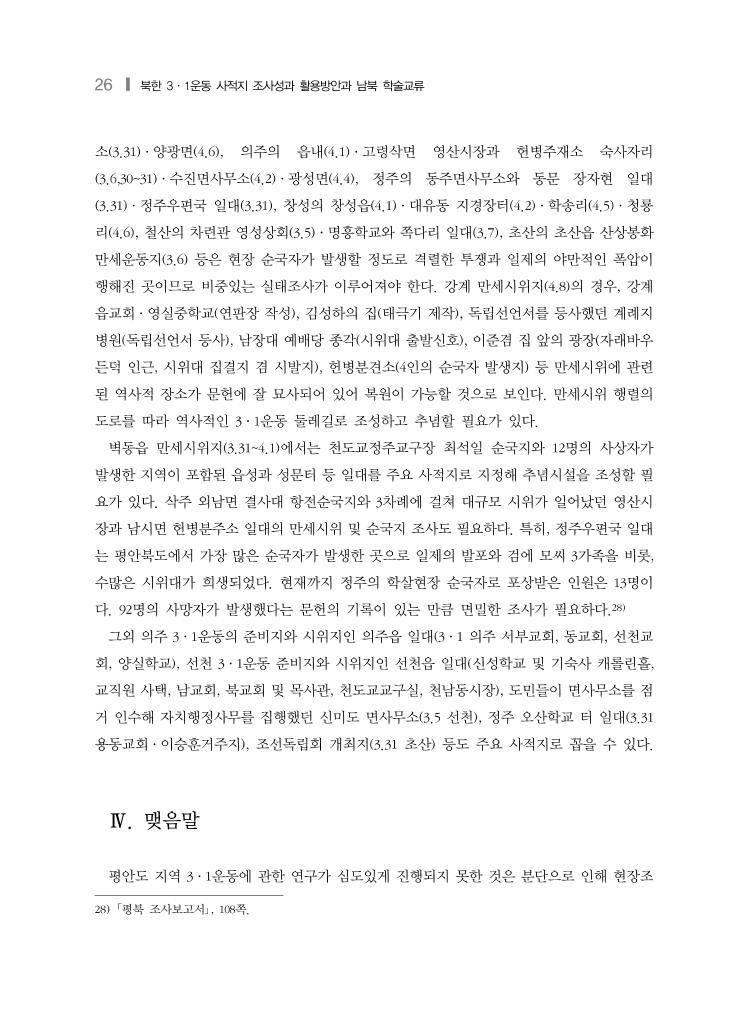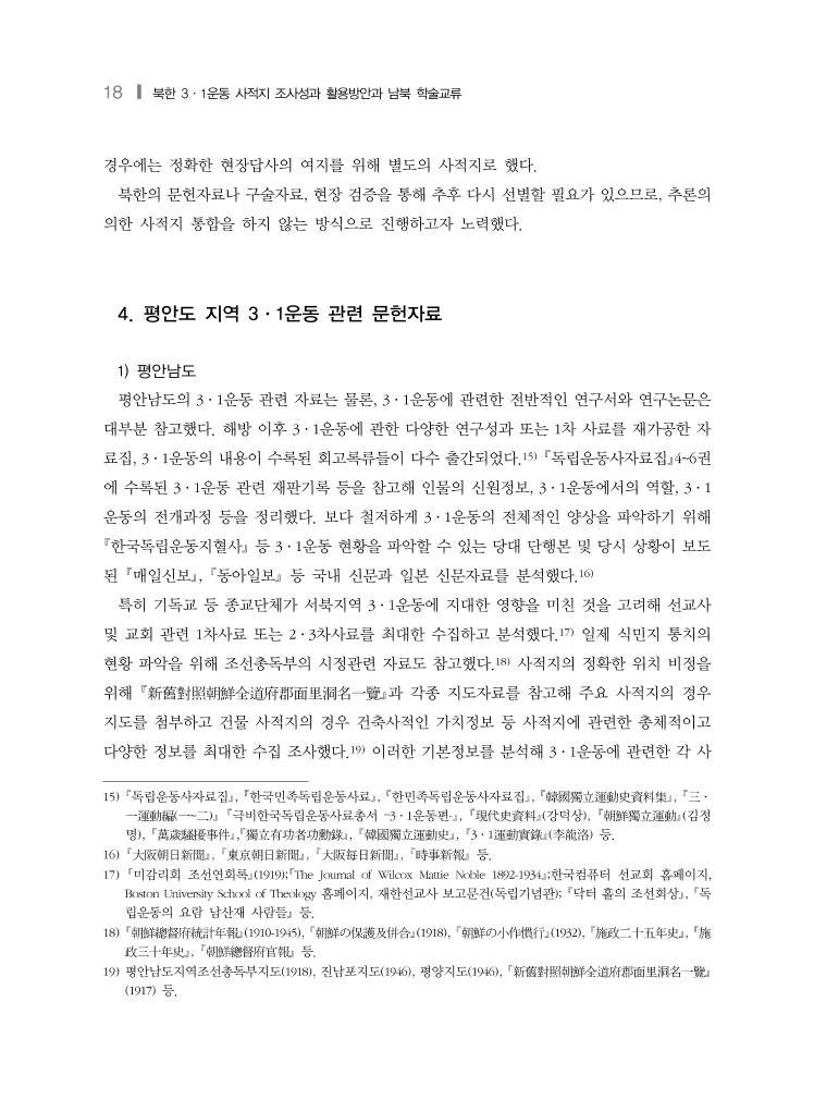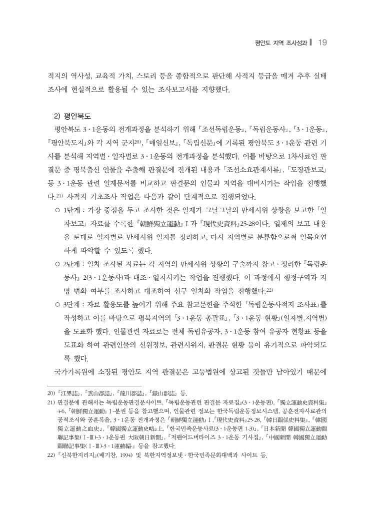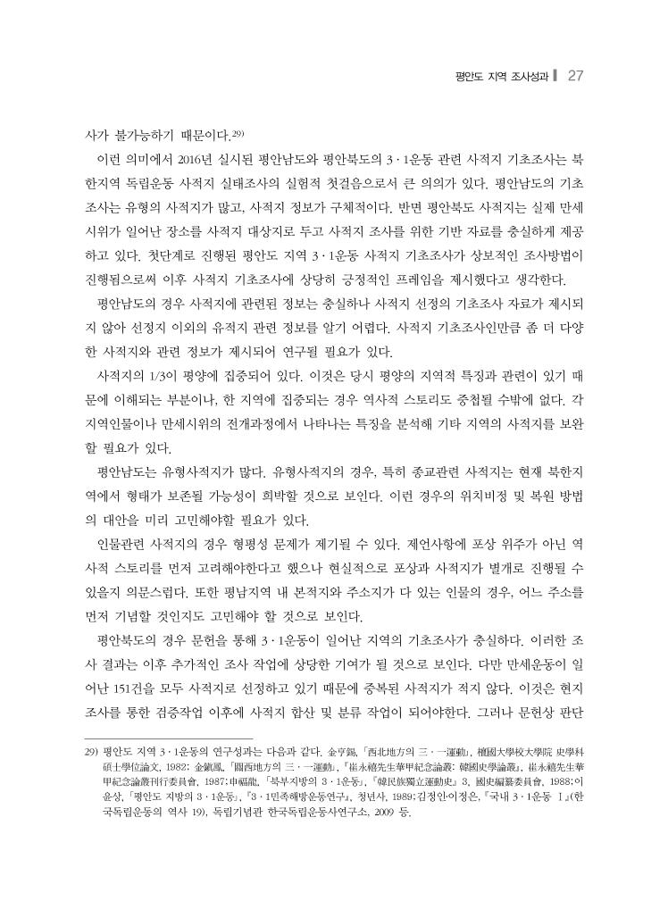 평안도 지역 조사성과❙ 27 사가 불가능하기 때문이다.29) 이런 의미에서 2016년 실시된 평안남도와 평안북도의 3·1운동 관련 사적지 기초조사는 북 한지역 독립운동 사적지 실태조사의 실험적 첫걸음으로서 큰 의의가 있다. 평안남도의 기초 조사는 유형의 사적지가 많고, 사적지 정보가 구체적이다. 반면 평안북도 사적지는 실제 만세 시위가 일어난 장소를 사적지 대상지로 두고 사적지 조사를 위한 기반 자료를 충실하게 제공 하고 있다. 첫단계로 진행된 평안도 지역 3·1운동 사적지 기초조사가 상보적인 조사방법이 진행됨으로써 이후 사적지 기초조사에 상당히 긍정적인 프레임을 제시했다고 생각한다. 평안남도의 경우 사적지에 관련된 정보는 충실하나 사적지 선정의 기초조사 자료가 제시되 지 않아 선정지 이외의 유적지 관련 정보를 알기 어렵다. 사적지 기초조사인만큼 좀 더 다양 한 사적지와 관련 정보가 제시되어 연구될 필요가 있다. 사적지의 1/3이 평양에 집중되어 있다. 이것은 당시 평양의 지역적 특징과 관련이 있기 때 문에 이해되는 부분이나, 한 지역에 집중되는 경우 역사적 스토리도 중첩될 수밖에 없다. 각 지역인물이나 만세시위의 전개과정에서 나타나는 특징을 분석해 기타 지역의 사적지를 보완 할 필요가 있다. 평안남도는 유형사적지가 많다. 유형사적지의 경우, 특히 종교관련 사적지는 현재 북한지 역에서 형태가 보존될 가능성이 희박할 것으로 보인다. 이런 경우의 위치비정 및 복원 방법 의 대안을 미리 고민해야할 필요가 있다. 인물관련 사적지의 경우 형평성 문제가 제기될 수 있다. 제언사항에 포상 위주가 아닌 역 사적 스토리를 먼저 고려해야한다고 했으나 현실적으로 포상과 사적지가 별개로 진행될 수 있을지 의문스럽다. 또한 평남지역 내 본적지와 주소지가 다 있는 인물의 경우, 어느 주소를 먼저 기념할 것인지도 고민해야 할 것으로 보인다. 평안북도의 경우 문헌을 통해 3·1운동이 일어난 지역의 기초조사가 충실하다. 이러한 조 사 결과는 이후 추가적인 조사 작업에 상당한 기여가 될 것으로 보인다. 다만 만세운동이 일 어난 151건을 모두 사적지로 선정하고 있기 때문에 중복된 사적지가 적지 않다. 이것은 현지 조사를 통한 검증작업 이후에 사적지 합산 및 분류 작업이 되어야한다. 그러나 문헌상 판단 29) 평안도 지역 3·1운동의 연구성과는 다음과 같다. 金亨錫, 「西北地方의 三·一運動」, 檀國大學校大學院 史學科 碩士學位論文, 1982; 金鎭鳳, 「關西地方의 三·一運動」, 崔永禧先生華甲紀念論叢: 韓國史學論叢, 崔永禧先生華 甲紀念論叢刊行委員會, 1987;申福龍, 「북부지방의 3·1운동」, 韓民族獨立運動史 3, 國史編纂委員會, 1988;이 윤상, 「평안도 지방의 3·1운동」, 3·1민족해방운동연구, 청년사, 1989;김정인․이정은, 국내 3·1운동 Ⅰ(한 국독립운동의 역사 19), 독립기념관 한국독립운동사연구소, 2009 등.