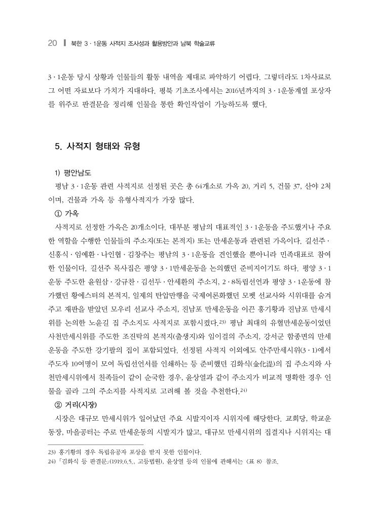 20 ❙ 북한 3·1운동 사적지 조사성과 활용방안과 남북 학술교류 3·1운동 당시 상황과 인물들의 활동 내역을 제대로 파악하기 어렵다. 그렇더라도 1차사료로 그 어떤 자료보다 가치가 지대하다. 평북 기초조사에서는 2016년까지의 3·1운동계열 포상자 를 위주로 판결문을 정리해 인물을 통한 확인작업이 가능하도록 했다. 5. 사적지 형태와 유형 1) 평안남도 평남 3·1운동 관련 사적지로 선정된 곳은 총 64개소로 가옥 20, 거리 5, 건물 37, 산야 2처 이며, 건물과 가옥 등 유형사적지가 가장 많다. ① 가옥 사적지로 선정한 가옥은 20개소이다. 대부분 평남의 대표적인 3·1운동을 주도했거나 주요 한 역할을 수행한 인물들의 주소지(또는 본적지) 또는 만세운동과 관련된 가옥이다. 길선주· 신홍식·임예환·나인협·김창주는 평남의 3·1운동을 견인했을 뿐아니라 민족대표로 참여 한 인물이다. 길선주 목사집은 평양 3·1만세운동을 논의했던 준비지이기도 하다. 평양 3·1 운동 주도한 윤원삼·강규찬·김선두·안세환의 주소지, 2·8독립선언과 평양 3·1운동에 참 가했던 황에스터의 본적지, 일제의 탄압만행을 국제여론화했던 모펫 선교사와 시위대를 숨겨 주고 재판을 받았던 모우리 선교사 주소지, 진남포 만세운동을 이끈 홍기황과 진남포 만세시 위를 논의한 노윤길 집 주소지도 사적지로 포함시켰다.23) 평남 최대의 유혈만세운동이었던 사천만세시위를 주도한 조진탁의 본적지(출생지)와 임이걸의 주소지, 강서군 함종면의 만세 운동을 주도한 강기팔의 집이 포함되었다. 선정된 사적지 이외에도 안주만세시위(3·1)에서 주도자 10여명이 모여 독립선언서를 인쇄하는 등 준비했던 김화식(金化湜)의 집 주소지와 사 천만세시위에서 친족들이 같이 순국한 경우, 윤상열과 같이 주소지가 비교적 명확한 경우 인 물을 골라 그의 주소지를 사적지로 고려해 볼 것을 추천한다.24) ② 거리(시장) 시장은 대규모 만세시위가 일어났던 주요 시발지이자 시위지에 해당한다. 교회당, 학교운 동장, 마을공터는 주로 만세운동의 시발지가 많고, 대규모 만세시위의 집결지나 시위지는 대 23) 홍기황의 경우 독립유공자 포상을 받지 못한 인물이다. 24) 「김화식 등 판결문」(1919.6.5., 고등법원), 윤상열 등의 인물에 관해서는 <표 8> 참조.