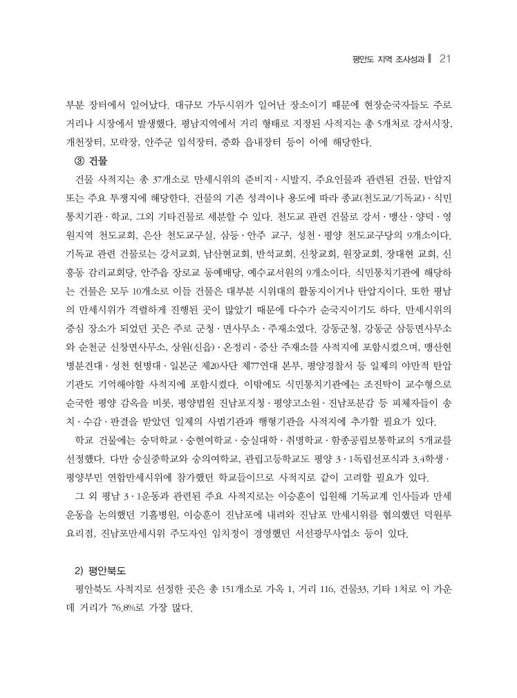 평안도 지역 조사성과❙ 21 부분 장터에서 일어났다. 대규모 가두시위가 일어난 장소이기 때문에 현장순국자들도 주로 거리나 시장에서 발생했다. 평남지역에서 거리 형태로 지정된 사적지는 총 5개처로 강서시장, 개천장터, 모락장, 안주군 입석장터, 중화 읍내장터 등이 이에 해당한다. ③ 건물 건물 사적지는 총 37개소로 만세시위의 준비지·시발지, 주요인물과 관련된 건물, 탄압지 또는 주요 투쟁지에 해당한다. 건물의 기존 성격이나 용도에 따라 종교(천도교/기독교)·식민 통치기관·학교, 그외 기타건물로 세분할 수 있다. 천도교 관련 건물로 강서·맹산·양덕·영 원지역 천도교회, 은산 천도교구실, 삼등·안주 교구, 성천·평양 천도교구당의 9개소이다. 기독교 관련 건물로는 강서교회, 남산현교회, 반석교회, 신창교회, 원장교회, 장대현 교회, 신 흥동 감리교회당, 안주읍 장로교 동예배당, 예수교서원의 9개소이다. 식민통치기관에 해당하 는 건물은 모두 10개소로 이들 건물은 대부분 시위대의 활동지이거나 탄압지이다. 또한 평남 의 만세시위가 격렬하게 진행된 곳이 많았기 때문에 다수가 순국지이기도 하다. 만세시위의 중심 장소가 되었던 곳은 주로 군청·면사무소·주재소였다. 강동군청, 강동군 삼등면사무소 와 순천군 신창면사무소, 상원(신읍)·온정리·증산 주재소를 사적지에 포함시켰으며, 맹산헌 병분견대·성천 헌병대·일본군 제20사단 제77연대 본부, 평양경찰서 등 일제의 야만적 탄압 기관도 기억해야할 사적지에 포함시켰다. 이밖에도 식민통치기관에는 조진탁이 교수형으로 순국한 평양 감옥을 비롯, 평양법원 진남포지청·평양고소원·진남포분감 등 피체자들이 송 치·수감·판결을 받았던 일제의 사법기관과 행형기관을 사적지에 추가할 필요가 있다. 학교 건물에는 숭덕학교·숭현여학교·숭실대학·취명학교·함종공립보통학교의 5개교를 선정했다. 다만 숭실중학교와 숭의여학교, 관립고등학교도 평양 3·1독립선포식과 3.4학생· 평양부민 연합만세시위에 참가했던 학교들이므로 사적지로 같이 고려할 필요가 있다. 그 외 평남 3·1운동과 관련된 주요 사적지로는 이승훈이 입원해 기독교계 인사들과 만세 운동을 논의했던 기홀병원, 이승훈이 진남포에 내려와 진남포 만세시위를 협의했던 덕원루 요리점, 진남포만세시위 주도자인 임치정이 경영했던 서선광무사업소 등이 있다. 2) 평안북도 평안북도 사적지로 선정한 곳은 총 151개소로 가옥 1, 거리 116, 건물33, 기타 1처로 이 가운 데 거리가 76.8%로 가장 많다.