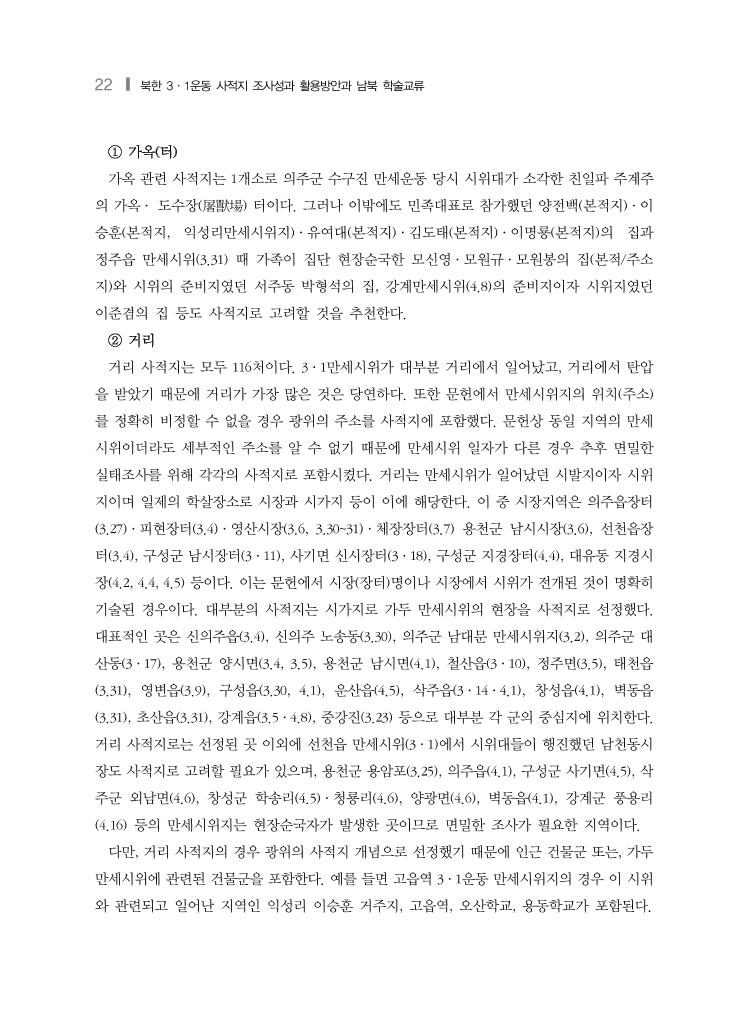 22 ❙ 북한 3·1운동 사적지 조사성과 활용방안과 남북 학술교류 ① 가옥(터) 가옥 관련 사적지는 1개소로 의주군 수구진 만세운동 당시 시위대가 소각한 친일파 주계주 의 가옥· 도수장(屠獸場) 터이다. 그러나 이밖에도 민족대표로 참가했던 양전백(본적지)·이 승훈(본적지, 익성리만세시위지)·유여대(본적지)·김도태(본적지)·이명룡(본적지)의 집과 정주읍 만세시위(3.31) 때 가족이 집단 현장순국한 모신영·모원규·모원봉의 집(본적/주소 지)와 시위의 준비지였던 서주동 박형석의 집, 강계만세시위(4.8)의 준비지이자 시위지였던 이준겸의 집 등도 사적지로 고려할 것을 추천한다. ② 거리 거리 사적지는 모두 116처이다. 3·1만세시위가 대부분 거리에서 일어났고, 거리에서 탄압 을 받았기 때문에 거리가 가장 많은 것은 당연하다. 또한 문헌에서 만세시위지의 위치(주소) 를 정확히 비정할 수 없을 경우 광위의 주소를 사적지에 포함했다. 문헌상 동일 지역의 만세 시위이더라도 세부적인 주소를 알 수 없기 때문에 만세시위 일자가 다른 경우 추후 면밀한 실태조사를 위해 각각의 사적지로 포함시켰다. 거리는 만세시위가 일어났던 시발지이자 시위 지이며 일제의 학살장소로 시장과 시가지 등이 이에 해당한다. 이 중 시장지역은 의주읍장터 (3.27)·피현장터(3.4)·영산시장(3.6, 3.30~31)·체장장터(3.7) 용천군 남시시장(3.6), 선천읍장 터(3.4), 구성군 남시장터(3·11), 사기면 신시장터(3·18), 구성군 지경장터(4.4), 대유동 지경시 장(4.2, 4.4, 4.5) 등이다. 이는 문헌에서 시장(장터)명이나 시장에서 시위가 전개된 것이 명확히 기술된 경우이다. 대부분의 사적지는 시가지로 가두 만세시위의 현장을 사적지로 선정했다. 대표적인 곳은 신의주읍(3.4), 신의주 노송동(3.30), 의주군 남대문 만세시위지(3.2), 의주군 대 산동(3·17), 용천군 양시면(3.4, 3.5), 용천군 남시면(4.1), 철산읍(3·10), 정주면(3.5), 태천읍 (3.31), 영변읍(3.9), 구성읍(3.30, 4.1), 운산읍(4.5), 삭주읍(3·14·4.1), 창성읍(4.1), 벽동읍 (3.31), 초산읍(3.31), 강계읍(3.5·4.8), 중강진(3.23) 등으로 대부분 각 군의 중심지에 위치한다. 거리 사적지로는 선정된 곳 이외에 선천읍 만세시위(3·1)에서 시위대들이 행진했던 남천동시 장도 사적지로 고려할 필요가 있으며, 용천군 용암포(3.25), 의주읍(4.1), 구성군 사기면(4.5), 삭 주군 외남면(4.6), 창성군 학송리(4.5)·청룡리(4.6), 양광면(4.6), 벽동읍(4.1), 강계군 풍용리 (4.16) 등의 만세시위지는 현장순국자가 발생한 곳이므로 면밀한 조사가 필요한 지역이다. 다만, 거리 사적지의 경우 광위의 사적지 개념으로 선정했기 때문에 인근 건물군 또는, 가두 만세시위에 관련된 건물군을 포함한다. 예를 들면 고읍역 3·1운동 만세시위지의 경우 이 시위 와 관련되고 일어난 지역인 익성리 이승훈 거주지, 고읍역, 오산학교, 용동학교가 포함된다.