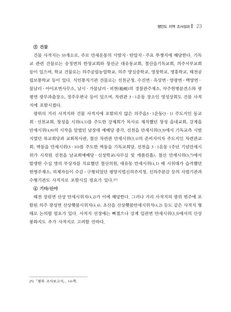 평안도 지역 조사성과❙ 23 ③ 건물 건물 사적지는 33개소로, 주로 만세운동의 시발지·탄압지·주요 투쟁지에 해당한다. 기독 교 관련 건물로는 숭정면의 한장교회와 창선군 대유동교회, 철산읍기독교회, 의주서부교회 등이 있으며, 학교 건물로는 의주공립농업학교, 의주 양실중학교, 영창학교, 명흥학교, 태천공 립보통학교 등이 있다. 식민통치기관 건물로는 선천군청, 수진면·옥상면·양광면·백양면· 물남리·아이포면사무소, 남시·가물남리·피현(枇峴)의 경찰관주재소, 삭주헌병분견소와 광 평면 광무과출장소, 정주우편국 등이 있으며, 차련관 3·1운동 장소인 영성상회도 건물 사적 지에 포함시켰다. 광위의 거리 사적지와 건물 사적지에 포함되지 않은 의주읍3·1운동(3·1) 주도지인 동교 회·선천교회, 창성읍 시위(4.1)를 주도한 강제희가 목사로 재직했던 창성 읍내교회, 강계읍 만세시위(4.8)의 시작을 알렸던 남장대 예배당 종각, 선천읍 만세시위(3.3)에서 기독교측 시발 지였던 북교회당과 교회목사관, 철산 차련관 만세시위(3.4)의 준비지이자 주도지인 차련관교 회, 벽동읍 만세시위(3·10)를 주도한 벽동읍 기독교회당, 선천읍 3·1운동 1주년 기념만세시 위가 시작된 선천읍 남교회예배당·신성학교(사무실 및 캐롤린홀), 철산 만세시위(3.7)에서 발생한 수십 명의 부상자를 치료했던 철산의원, 대유동 만세시위(4.1) 때 시위대가 습격했던 헌병주재소, 피체자들이 수감·구형되었던 평양지법신의주지청, 신의주분감 등의 사법기관과 수형기관도 사적지로 포함시킬 필요가 있다.25) ④ 기타/산야 태천 장림면 산상 만세시위지(4.2)가 이에 해당한다. 그러나 거리 사적지의 광위 범주에 포 함된 의주 광성면 산상횃불시위지(4.4), 초산읍 산상횃불만세시위지(4.2) 등도 같은 사적지 형 태로 논의될 필요가 있다. 사적지 선정에는 빠졌으나 강계 입관면 만세시위(3.3)에서의 산상 봉화지도 추가 사적지로 고려할 만하다. 25) 「평북 조사보고서」, 141쪽.