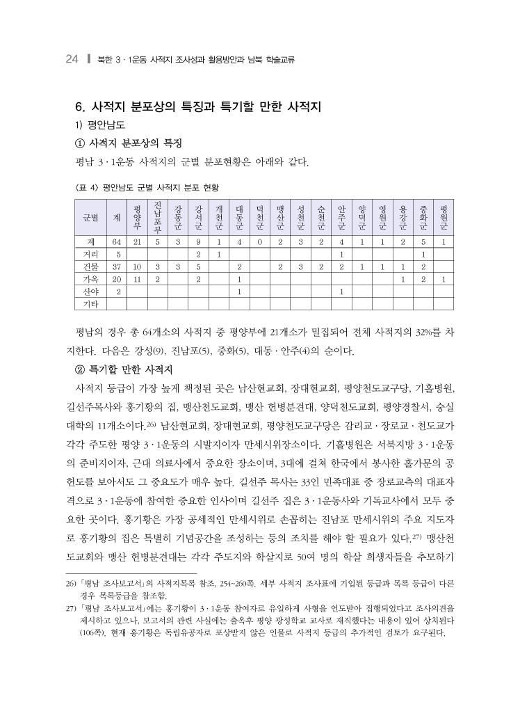 24 ❙ 북한 3·1운동 사적지 조사성과 활용방안과 남북 학술교류 6. 사적지 분포상의 특징과 특기할 만한 사적지 1) 평안남도 ① 사적지 분포상의 특징 평남 3·1운동 사적지의 군별 분포현황은 아래와 같다. 군별 계 평 양 부 진 남 포 부 강 동 군 강 서 군 개 천 군 대 동 군 덕 천 군 맹 산 군 성 천 군 순 천 군 안 주 군 양 덕 군 영 원 군 용 강 군 중 화 군 평 원 군 계 64 21 5 3 9 1 4 0 2 3 2 4 1 1 2 5 1 거리 5 2 1 1 1 건물 37 10 3 3 5 2 2 3 2 2 1 1 1 2 가옥 20 11 2 2 1 1 2 1 산야 2 1 1 기타 <표 4> 평안남도 군별 사적지 분포 현황 평남의 경우 총 64개소의 사적지 중 평양부에 21개소가 밀집되어 전체 사적지의 32%를 차 지한다. 다음은 강성(9), 진남포(5), 중화(5), 대동·안주(4)의 순이다. ② 특기할 만한 사적지 사적지 등급이 가장 높게 책정된 곳은 남산현교회, 장대현교회, 평양천도교구당, 기홀병원, 길선주목사와 홍기황의 집, 맹산천도교회, 맹산 헌병분견대, 양덕천도교회, 평양경찰서, 숭실 대학의 11개소이다.26) 남산현교회, 장대현교회, 평양천도교구당은 감리교·장로교·천도교가 각각 주도한 평양 3·1운동의 시발지이자 만세시위장소이다. 기홀병원은 서북지방 3·1운동 의 준비지이자, 근대 의료사에서 중요한 장소이며, 3대에 걸쳐 한국에서 봉사한 홀가문의 공 헌도를 보아서도 그 중요도가 매우 높다. 길선주 목사는 33인 민족대표 중 장로교측의 대표자 격으로 3·1운동에 참여한 중요한 인사이며 길선주 집은 3·1운동사와 기독교사에서 모두 중 요한 곳이다. 홍기황은 가장 공세적인 만세시위로 손꼽히는 진남포 만세시위의 주요 지도자 로 홍기황의 집은 특별히 기념공간을 조성하는 등의 조치를 해야 할 필요가 있다.27) 맹산천 도교회와 맹산 헌병분견대는 각각 주도지와 학살지로 50여 명의 학살 희생자들을 추모하기 26) 「평남 조사보고서」의 사적지목록 참조, 254~260쪽. 세부 사적지 조사표에 기입된 등급과 목록 등급이 다른 경우 목록등급을 참조함. 27) 「평남 조사보고서」에는 홍기황이 3·1운동 참여자로 유일하게 사형을 언도받아 집행되었다고 조사의견을 제시하고 있으나, 보고서의 관련 사실에는 출옥후 평양 광성학교 교사로 재직했다는 내용이 있어 상치된다 (106쪽). 현재 홍기황은 독립유공자로 포상받지 않은 인물로 사적지 등급의 추가적인 검토가 요구된다.