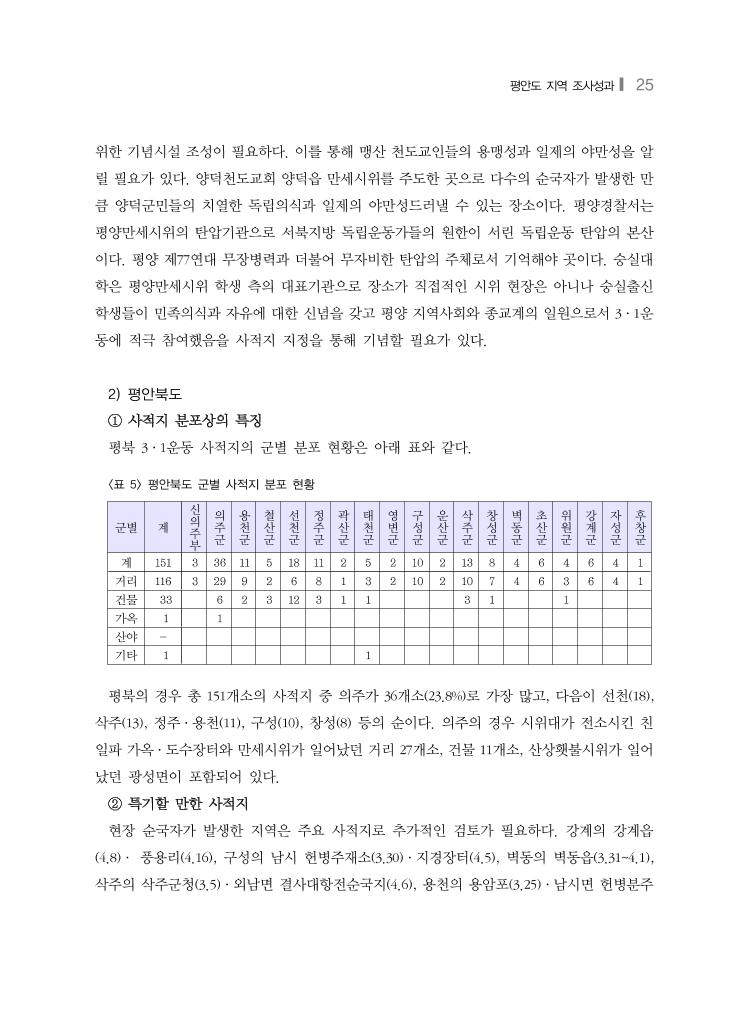 평안도 지역 조사성과❙ 25 위한 기념시설 조성이 필요하다. 이를 통해 맹산 천도교인들의 용맹성과 일제의 야만성을 알 릴 필요가 있다. 양덕천도교회 양덕읍 만세시위를 주도한 곳으로 다수의 순국자가 발생한 만 큼 양덕군민들의 치열한 독립의식과 일제의 야만성드러낼 수 있는 장소이다. 평양경찰서는 평양만세시위의 탄압기관으로 서북지방 독립운동가들의 원한이 서린 독립운동 탄압의 본산 이다. 평양 제77연대 무장병력과 더불어 무자비한 탄압의 주체로서 기억해야 곳이다. 숭실대 학은 평양만세시위 학생 측의 대표기관으로 장소가 직접적인 시위 현장은 아니나 숭실출신 학생들이 민족의식과 자유에 대한 신념을 갖고 평양 지역사회와 종교계의 일원으로서 3·1운 동에 적극 참여했음을 사적지 지정을 통해 기념할 필요가 있다. 2) 평안북도 ① 사적지 분포상의 특징 평북 3·1운동 사적지의 군별 분포 현황은 아래 표와 같다. 군별 계 신 의 주 부 의 주 군 용 천 군 철 산 군 선 천 군 정 주 군 곽 산 군 태 천 군 영 변 군 구 성 군 운 산 군 삭 주 군 창 성 군 벽 동 군 초 산 군 위 원 군 강 계 군 자 성 군 후 창 군 계 151 3 36 11 5 18 11 2 5 2 10 2 13 8 4 6 4 6 4 1 거리 116 3 29 9 2 6 8 1 3 2 10 2 10 7 4 6 3 6 4 1 건물 33 6 2 3 12 3 1 1 3 1 1 가옥 1 1 산야 - 기타 1 1 <표 5> 평안북도 군별 사적지 분포 현황 평북의 경우 총 151개소의 사적지 중 의주가 36개소(23.8%)로 가장 많고, 다음이 선천(18), 삭주(13), 정주·용천(11), 구성(10), 창성(8) 등의 순이다. 의주의 경우 시위대가 전소시킨 친 일파 가옥·도수장터와 만세시위가 일어났던 거리 27개소, 건물 11개소, 산상횃불시위가 일어 났던 광성면이 포함되어 있다. ② 특기할 만한 사적지 현장 순국자가 발생한 지역은 주요 사적지로 추가적인 검토가 필요하다. 강계의 강계읍 (4.8)· 풍용리(4.16), 구성의 남시 헌병주재소(3.30)·지경장터(4.5), 벽동의 벽동읍(3.31~4.1), 삭주의 삭주군청(3.5)·외남면 결사대항전순국지(4.6), 용천의 용암포(3.25)·남시면 헌병분주