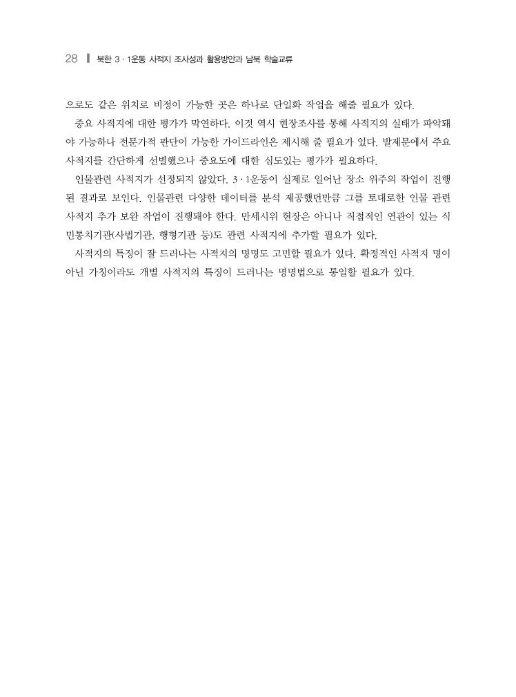 28 ❙ 북한 3·1운동 사적지 조사성과 활용방안과 남북 학술교류 으로도 같은 위치로 비정이 가능한 곳은 하나로 단일화 작업을 해줄 필요가 있다. 중요 사적지에 대한 평가가 막연하다. 이것 역시 현장조사를 통해 사적지의 실태가 파악돼 야 가능하나 전문가적 판단이 가능한 가이드라인은 제시해 줄 필요가 있다. 발제문에서 주요 사적지를 간단하게 선별했으나 중요도에 대한 심도있는 평가가 필요하다. 인물관련 사적지가 선정되지 않았다. 3·1운동이 실제로 일어난 장소 위주의 작업이 진행 된 결과로 보인다. 인물관련 다양한 데이터를 분석 제공했던만큼 그를 토대로한 인물 관련 사적지 추가 보완 작업이 진행돼야 한다. 만세시위 현장은 아니나 직접적인 연관이 있는 식 민통치기관(사법기관, 행형기관 등)도 관련 사적지에 추가할 필요가 있다. 사적지의 특징이 잘 드러나는 사적지의 명명도 고민할 필요가 있다. 확정적인 사적지 명이 아닌 가칭이라도 개별 사적지의 특징이 드러나는 명명법으로 통일할 필요가 있다.
