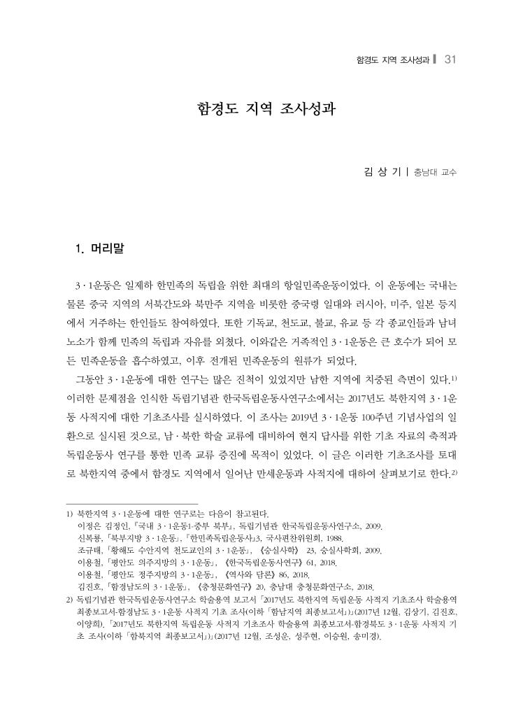 함경도 지역 조사성과❙ 31 함경도 지역 조사성과 김 상 기 | 충남대 교수 1. 머리말 3·1운동은 일제하 한민족의 독립을 위한 최대의 항일민족운동이었다. 이 운동에는 국내는 물론 중국 지역의 서북간도와 북만주 지역을 비롯한 중국령 일대와 러시아, 미주, 일본 등지 에서 거주하는 한인들도 참여하였다. 또한 기독교, 천도교, 불교, 유교 등 각 종교인들과 남녀 노소가 함께 민족의 독립과 자유를 외쳤다. 이와같은 거족적인 3·1운동은 큰 호수가 되어 모 든 민족운동을 흡수하였고, 이후 전개된 민족운동의 원류가 되었다. 그동안 3·1운동에 대한 연구는 많은 진척이 있었지만 남한 지역에 치중된 측면이 있다.1) 이러한 문제점을 인식한 독립기념관 한국독립운동사연구소에서는 2017년도 북한지역 3·1운 동 사적지에 대한 기초조사를 실시하였다. 이 조사는 2019년 3·1운동 100주년 기념사업의 일 환으로 실시된 것으로, 남·북한 학술 교류에 대비하여 현지 답사를 위한 기초 자료의 축적과 독립운동사 연구를 통한 민족 교류 증진에 목적이 있었다. 이 글은 이러한 기초조사를 토대 로 북한지역 중에서 함경도 지역에서 일어난 만세운동과 사적지에 대하여 살펴보기로 한다.2) 1) 북한지역 3·1운동에 대한 연구로는 다음이 참고된다. 이정은 김정인, 국내 3·1운동1-중부 북부, 독립기념관 한국독립운동사연구소, 2009. 신복룡, 「북부지방 3·1운동」, 한민족독립운동사3, 국사편찬위원회, 1988. 조규태, 「황해도 수안지역 천도교인의 3·1운동」, 《숭실사학》 23, 숭실사학회, 2009. 이용철, 「평안도 의주지방의 3·1운동」, 《한국독립운동사연구》61, 2018. 이용철, 「평안도 정주지방의 3·1운동」, 《역사와 담론》86, 2018. 김진호, 「함경남도의 3·1운동」, 《충청문화연구》20, 충남대 충청문화연구소, 2018. 2) 독립기념관 한국독립운동사연구소 학술용역 보고서 「2017년도 북한지역 독립운동 사적지 기초조사 학술용역 최종보고서-함경남도 3·1운동 사적지 기초 조사(이하 「함남지역 최종보고서」)」(2017년 12월, 김상기, 김진호, 이양희). 「2017년도 북한지역 독립운동 사적지 기초조사 학술용역 최종보고서-함경북도 3·1운동 사적지 기 초 조사(이하 「함북지역 최종보고서」)」(2017년 12월, 조성운, 성주현, 이승원, 송미경).
