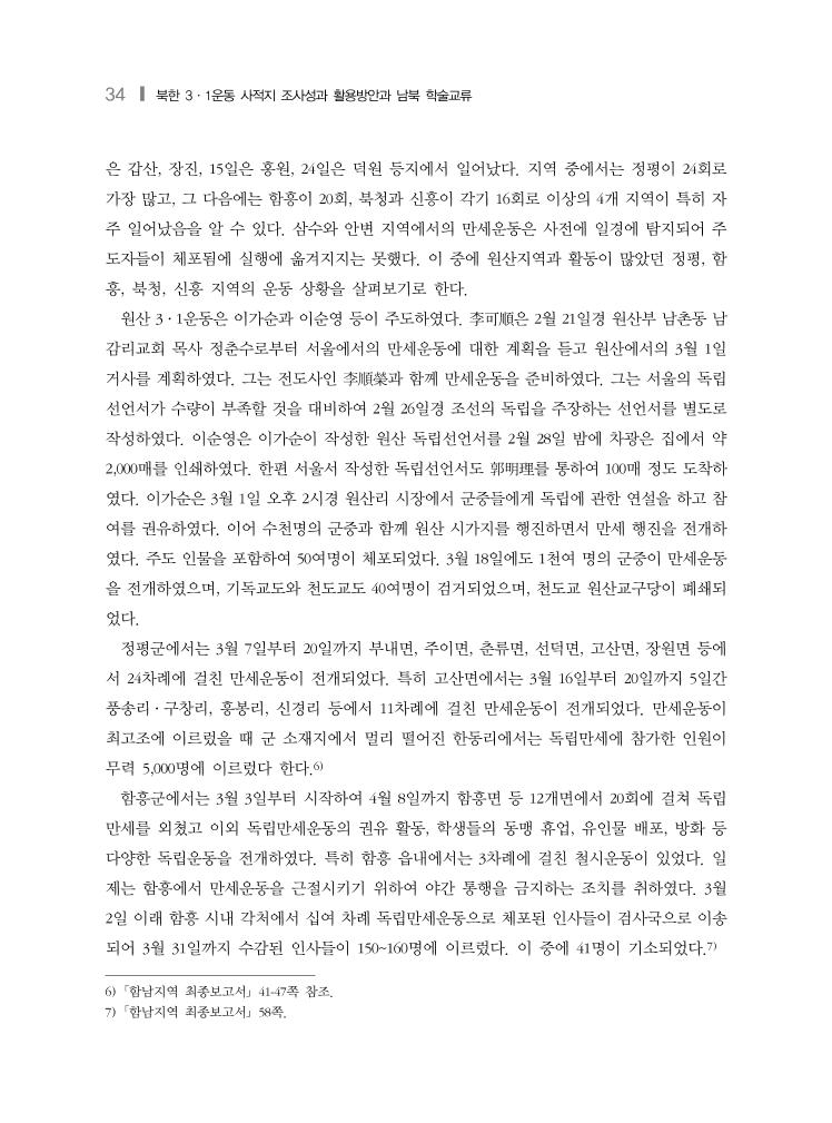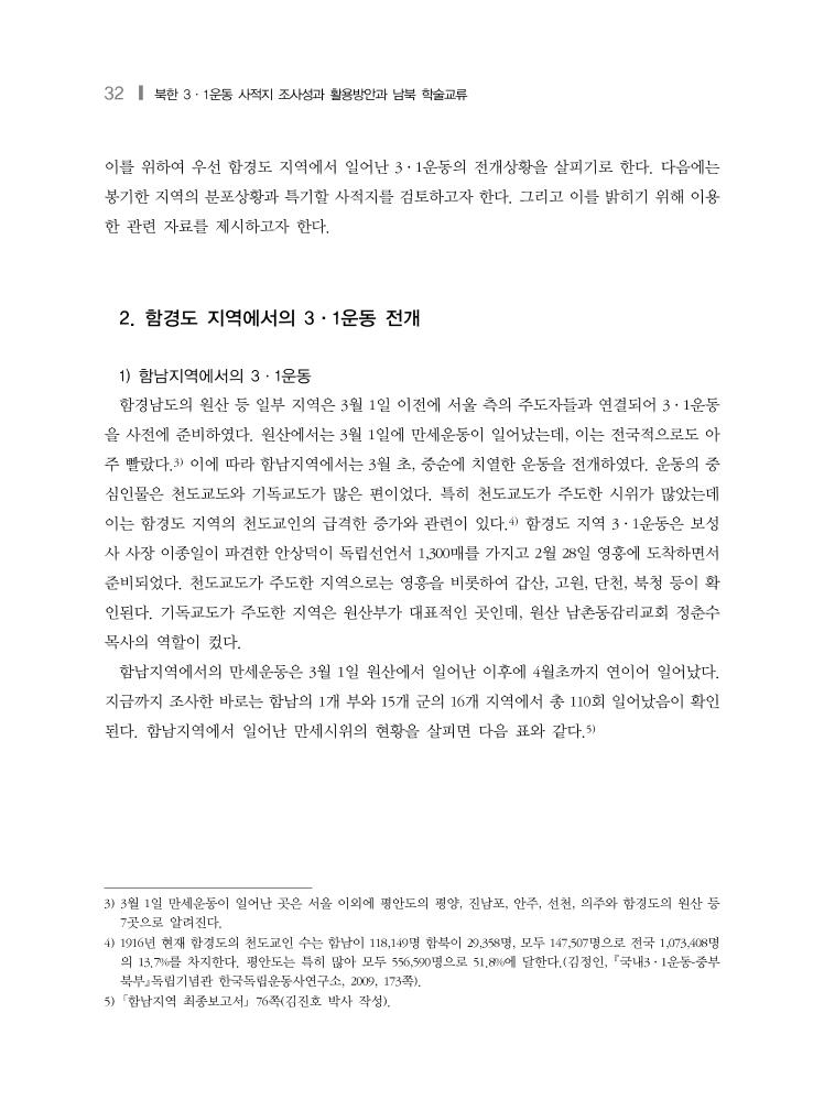 32 ❙ 북한 3·1운동 사적지 조사성과 활용방안과 남북 학술교류 이를 위하여 우선 함경도 지역에서 일어난 3·1운동의 전개상황을 살피기로 한다. 다음에는 봉기한 지역의 분포상황과 특기할 사적지를 검토하고자 한다. 그리고 이를 밝히기 위해 이용 한 관련 자료를 제시하고자 한다. 2. 함경도 지역에서의 3·1운동 전개 1) 함남지역에서의 3·1운동 함경남도의 원산 등 일부 지역은 3월 1일 이전에 서울 측의 주도자들과 연결되어 3·1운동 을 사전에 준비하였다. 원산에서는 3월 1일에 만세운동이 일어났는데, 이는 전국적으로도 아 주 빨랐다.3) 이에 따라 함남지역에서는 3월 초, 중순에 치열한 운동을 전개하였다. 운동의 중 심인물은 천도교도와 기독교도가 많은 편이었다. 특히 천도교도가 주도한 시위가 많았는데 이는 함경도 지역의 천도교인의 급격한 증가와 관련이 있다.4) 함경도 지역 3·1운동은 보성 사 사장 이종일이 파견한 안상덕이 독립선언서 1,300매를 가지고 2월 28일 영흥에 도착하면서 준비되었다. 천도교도가 주도한 지역으로는 영흥을 비롯하여 갑산, 고원, 단천, 북청 등이 확 인된다. 기독교도가 주도한 지역은 원산부가 대표적인 곳인데, 원산 남촌동감리교회 정춘수 목사의 역할이 컸다. 함남지역에서의 만세운동은 3월 1일 원산에서 일어난 이후에 4월초까지 연이어 일어났다. 지금까지 조사한 바로는 함남의 1개 부와 15개 군의 16개 지역에서 총 110회 일어났음이 확인 된다. 함남지역에서 일어난 만세시위의 현황을 살피면 다음 표와 같다.5) 3) 3월 1일 만세운동이 일어난 곳은 서울 이외에 평안도의 평양, 진남포, 안주, 선천, 의주와 함경도의 원산 등 7곳으로 알려진다. 4) 1916년 현재 함경도의 천도교인 수는 함남이 118,149명 함북이 29,358명, 모두 147,507명으로 전국 1,073,408명 의 13.7%를 차지한다. 평안도는 특히 많아 모두 556,590명으로 51.8%에 달한다.(김정인, 국내3·1운동-중부 북부독립기념관 한국독립운동사연구소, 2009, 173쪽). 5) 「함남지역 최종보고서」 76쪽(김진호 박사 작성).