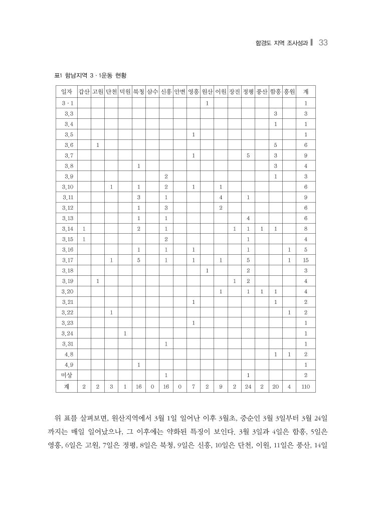 함경도 지역 조사성과❙ 33 표1 함남지역 3·1운동 현황 일자 갑산 고원 단천 덕원 북청 삼수 신흥 안변 영흥 원산 이원 장진 정평 풍산 함흥 흥원 계 3·1 1 1 3.3 3 3 3.4 1 1 3.5 1 1 3.6 1 5 6 3.7 1 5 3 9 3.8 1 3 4 3.9 2 1 3 3.10 1 1 2 1 1 6 3.11 3 1 4 1 9 3.12 1 3 2 6 3.13 1 1 4 6 3.14 1 2 1 1 1 1 1 8 3.15 1 2 1 4 3.16 1 1 1 1 1 5 3.17 1 5 1 1 1 5 1 15 3.18 1 2 3 3.19 1 1 2 4 3.20 1 1 1 1 4 3.21 1 1 2 3.22 1 1 2 3.23 1 1 3.24 1 1 3.31 1 1 4.8 1 1 2 4.9 1 1 미상 1 1 2 계 2 2 3 1 16 0 16 0 7 2 9 2 24 2 20 4 110 위 표를 살펴보면, 원산지역에서 3월 1일 일어난 이후 3월초, 중순인 3월 3일부터 3월 24일 까지는 매일 일어났으나, 그 이후에는 약화된 특징이 보인다. 3월 3일과 4일은 함흥, 5일은 영흥, 6일은 고원, 7일은 정평, 8일은 북청, 9일은 신흥, 10일은 단천, 이원, 11일은 풍산, 14일