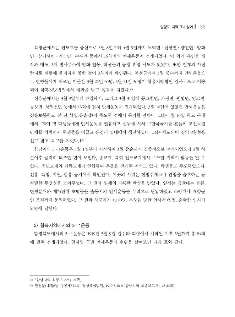 함경도 지역 조사성과❙ 35 북청군에서는 천도교를 중심으로 3월 8일부터 4월 9일까지 노덕면·신창면·양천면·양화 면·상거서면·거산면·속후면 등에서 16차례의 만세운동이 전개되었다. 이 외에 유인물 제 작과 배포, 2개 면사무소에 방화 활동, 학생들의 동맹 휴업 시도가 있었다. 또한 일제의 사전 탐지로 실행에 옮겨지지 못한 것이 3차례가 확인된다. 북청군에서 3월 중순까지 만세운동으 로 헌병들에게 체포된 이들은 3월 25일 60명, 3월 31일 36명이 함흥지방법원 검사국으로 이송 되어 함흥지방법원에서 재판을 받고 옥고를 치렀다.8) 신흥군에서는 3월 9일부터 17일까지, 그리고 3월 31일에 동고천면, 가평면, 원평면, 영고면, 동상면, 상원천면 등에서 16회에 걸쳐 만세운동이 전개되었다. 3월 10일에 있었던 만세운동은 신흥보통학교 4학년 학생(유춘갑)이 주도한 점에서 특기할 만하다. 그는 3월 10일 학교 구내 에서 170여 명 학생들에게 만세운동을 권유하고 선두에 서서 구한국국기를 흔들며 조선독립 만세를 외치면서 학생들을 이끌고 흥경리 일대에서 행진하였다. 그는 체포되어 징역 8월형을 선고 받고 옥고를 치렀다.19) 함남지역 3·1운동은 3월 1일부터 시작하여 3월 중순까지 집중적으로 전개되었으나 3월 하 순이후 급격히 퇴조한 면이 보인다. 종교계, 특히 천도교계에서 주도한 지역이 많음을 알 수 있다. 천도교계와 기독교계가 연합하여 운동을 전개한 지역도 있다. 학생들도 주도하였으니, 신흥, 북청, 이원, 함흥 등지에서 확인된다. 이곳의 시위는 헌병주재소나 관청을 습격하는 등 격렬한 투쟁성을 보여주었다. 그 결과 일제의 가혹한 탄압을 받았다. 일제는 경찰대는 물론, 헌병분대와 제74연대 보병들을 출동시켜 만세운동을 무력으로 탄압하였고 소방대나 재향군 인 조직까지 동원하였다. 그 결과 체포자가 1,140명, 부상을 당한 인사가 69명, 순국한 인사가 61명에 달한다. 2) 함북지역에서의 3·1운동 함경북도에서의 3·1운동은 1919년 3월 9일 길주와 회령에서 시작된 이후 5월까지 총 84회 에 걸쳐 전개되었다. 일자별 군별 만세운동의 현황을 살펴보면 다음 표와 같다. 8) 「함남지역 최종보고서」 24쪽. 9) 판결문(대정8년 형공제344호, 경성복심법원, 1919.5.28.)(「함남지역 최종보고서」 25-26쪽).