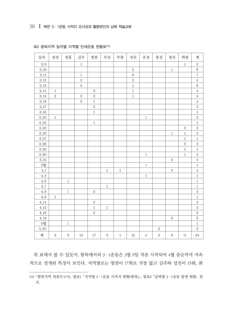 36 ❙ 북한 3·1운동 사적지 조사성과 활용방안과 남북 학술교류 표2 함북지역 일자별 지역별 만세운동 현황표10) 일자 경성 경흥 길주 명천 무산 부령 성진 온성 종성 청진 회령 계 3.9 1 1 2 3.10 5 1 6 3.11 1 6 7 3.12 2 2 4 3.13 5 1 6 3.14 1 2 1 4 3.15 2 3 3 1 9 3.16 3 1 4 3.17 2 2 3.18 1 1 3.20 1 1 2 3.22 1 1 3.25 3 3 3.26 1 1 2 3.27 1 1 3.28 3 3 3.29 1 1 3.30 1 1 2 3.31 2 2 3월 1 1 4.1 1 1 2 4 4.4 1 1 4.6 1 1 4.7 1 1 4.8 1 2 3 4.9 1 1 4.14 2 2 4.15 1 1 2 4.18 2 2 4.19 2 2 4월 1 1 5.20 2 2 계 5 3 15 17 3 1 15 4 2 8 11 84 위 표에서 볼 수 있듯이, 함북에서의 3·1운동은 3월 9일 처음 시작되어 4월 중순까지 지속 적으로 전개된 특징이 보인다. 지역별로는 명천이 17회로 가장 많고 길주와 성진이 15회, 회 10) 「함북지역 최종보고서」 별표1 「지역별 3·1운동 사적지 현황(함북)」, 별표2 「날짜별 3·1운동 발생 현황」 참 조.