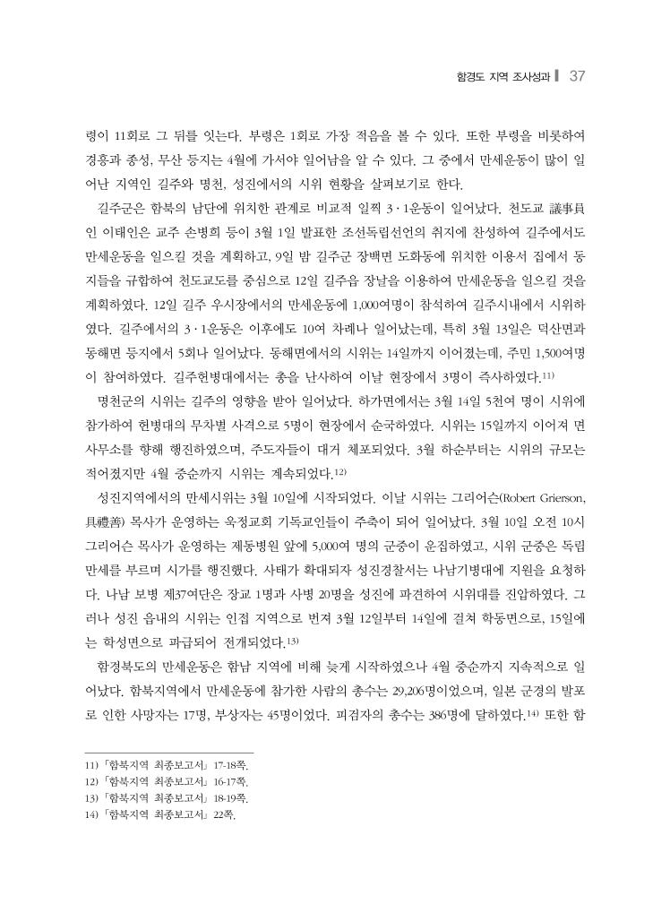 함경도 지역 조사성과❙ 37 령이 11회로 그 뒤를 잇는다. 부령은 1회로 가장 적음을 볼 수 있다. 또한 부령을 비롯하여 경흥과 종성, 무산 등지는 4월에 가서야 일어남을 알 수 있다. 그 중에서 만세운동이 많이 일 어난 지역인 길주와 명천, 성진에서의 시위 현황을 살펴보기로 한다. 길주군은 함북의 남단에 위치한 관계로 비교적 일찍 3·1운동이 일어났다. 천도교 議事員 인 이태인은 교주 손병희 등이 3월 1일 발표한 조선독립선언의 취지에 찬성하여 길주에서도 만세운동을 일으킬 것을 계획하고, 9일 밤 길주군 장백면 도화동에 위치한 이용서 집에서 동 지들을 규합하여 천도교도를 중심으로 12일 길주읍 장날을 이용하여 만세운동을 일으킬 것을 계획하였다. 12일 길주 우시장에서의 만세운동에 1,000여명이 참석하여 길주시내에서 시위하 였다. 길주에서의 3·1운동은 이후에도 10여 차례나 일어났는데, 특히 3월 13일은 덕산면과 동해면 등지에서 5회나 일어났다. 동해면에서의 시위는 14일까지 이어졌는데, 주민 1,500여명 이 참여하였다. 길주헌병대에서는 총을 난사하여 이날 현장에서 3명이 즉사하였다.11) 명천군의 시위는 길주의 영향을 받아 일어났다. 하가면에서는 3월 14일 5천여 명이 시위에 참가하여 헌병대의 무차별 사격으로 5명이 현장에서 순국하였다. 시위는 15일까지 이어져 면 사무소를 향해 행진하였으며, 주도자들이 대거 체포되었다. 3월 하순부터는 시위의 규모는 적어졌지만 4월 중순까지 시위는 계속되었다.12) 성진지역에서의 만세시위는 3월 10일에 시작되었다. 이날 시위는 그리어슨(Robert Grierson, 具禮善) 목사가 운영하는 욱정교회 기독교인들이 주축이 되어 일어났다. 3월 10일 오전 10시 그리어슨 목사가 운영하는 제동병원 앞에 5,000여 명의 군중이 운집하였고, 시위 군중은 독립 만세를 부르며 시가를 행진했다. 사태가 확대되자 성진경찰서는 나남기병대에 지원을 요청하 다. 나남 보병 제37여단은 장교 1명과 사병 20명을 성진에 파견하여 시위대를 진압하였다. 그 러나 성진 읍내의 시위는 인접 지역으로 번져 3월 12일부터 14일에 걸쳐 학동면으로, 15일에 는 학성면으로 파급되어 전개되었다.13) 함경북도의 만세운동은 함남 지역에 비해 늦게 시작하였으나 4월 중순까지 지속적으로 일 어났다. 함북지역에서 만세운동에 참가한 사람의 총수는 29,206명이었으며, 일본 군경의 발포 로 인한 사망자는 17명, 부상자는 45명이었다. 피검자의 총수는 386명에 달하였다.14) 또한 함 11) 「함북지역 최종보고서」 17-18쪽. 12) 「함북지역 최종보고서」 16-17쪽. 13) 「함북지역 최종보고서」 18-19쪽. 14) 「함북지역 최종보고서」 22쪽.