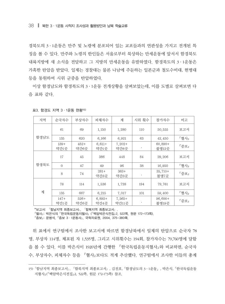 38 ❙ 북한 3·1운동 사적지 조사성과 활용방안과 남북 학술교류 경북도의 3·1운동은 만주 및 노령에 분포되어 있는 교포들과의 연관성을 가지고 전개된 특 징을 볼 수 있다. 만주와 노령의 한인들은 서울로부터 북상하는 만세운동에 앞서서 함경북도 내륙지방에 새 소식을 전달하고 그 지방의 만세운동을 유발하였다. 함경북도의 3·1운동은 가혹한 탄압을 받았다. 일제는 경찰대는 물론 나남에 주둔하는 일본군과 철도수비대, 헌병대 등을 동원하여 시위 군중을 탄압하였다. 이상 함경남도와 함경북도의 3·1운동 전개상황을 살펴보았는데, 이를 도별로 살펴보면 다 음 표와 같다. 표3. 함경도 지역 3·1운동 현황15) 지역 순국자수 부상자수 피체자수 계 시위 횟수 참가자수 비고 함경남도 61 69 1,150 1,280 110 50,555 보고서 135 620 6,166 6,921 63 42,450 혈사 139+ 약간1곳 452+ 약간6곳 6,611+ 약간1곳 7,202+ 약간8곳 . 60,890+ 불명12곳 증보 함경북도 17 45 386 448 84 29,206 보고서 0 47 49 96 38 16,950 혈사 8 74 281+ 약간3곳 363+ 약간3곳 . 35,710+ 불명7곳 증보 계 78 114 1,536 1,728 194 79,761 보고서 135 667 6,215 7,017 101 59,400 혈사 147+ 약간1곳 526+ 약간6곳 6,892+ 약간4곳 7,565+ 약간11곳 . 96,600+ 불명19곳 증보 *보고서: 「함남지역 최종보고서」, 「함북지역 최종보고서」 . 혈사: 박은식의 한국독립운동지혈사 (백암박은식전집2, 522쪽, 원문 172-173쪽). 증보: 윤병석, 증보 3·1운동사, 국학자료원, 2004, 375-380쪽. 위 표에서 연구팀에서 조사한 보고서에 따르면 함경남북에서 일제의 탄압으로 순국자 78 명, 부상자 114명, 체포된 자 1,535명, 그리고 시위횟수는 194회, 참가자수는 79,760명에 달함 을 볼 수 있다. 이를 박은식이 1920년에 간행한 한국독립운동지혈사와 비교하면, 순국자 수, 부상자수, 피체자수 등을 혈사보다도 적게 추산했다. 연구팀에서 조사한 이들의 총계 15) 「함남지역 최종보고서」, 「함북지역 최종보고서」 , 김진호, 「함경남도의 3·1운동」, 박은식, 한국독립운동 지혈사(백암박은식전집2, 522쪽, 원문 172-173쪽) 참조.
