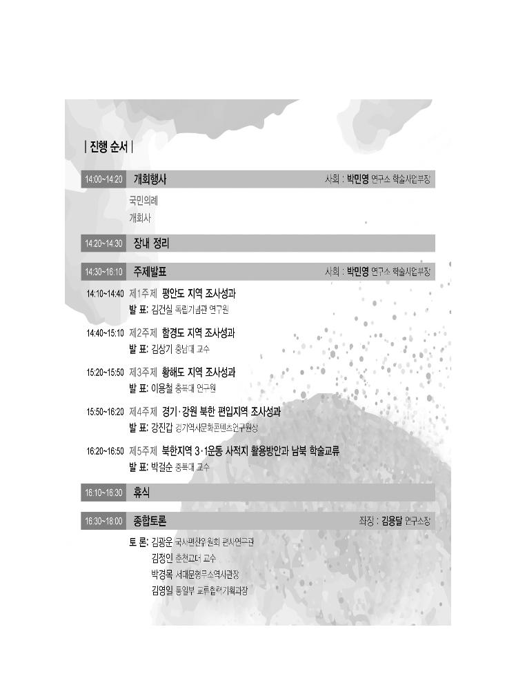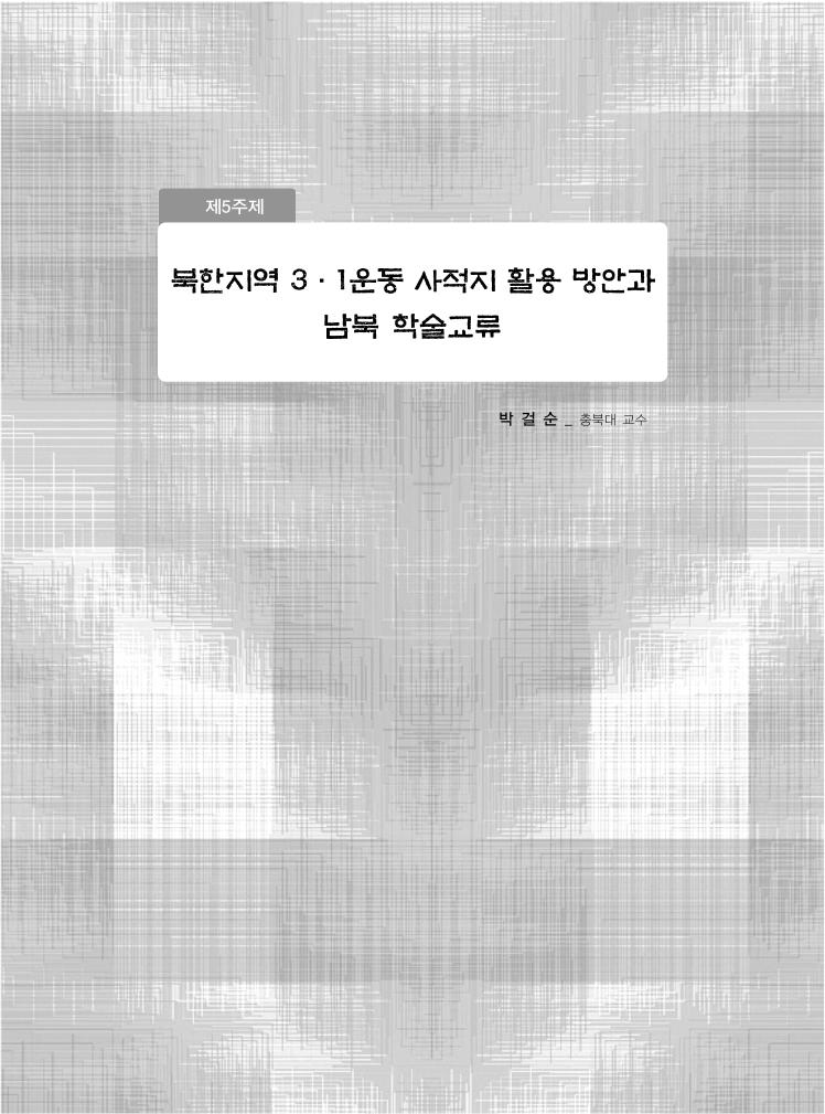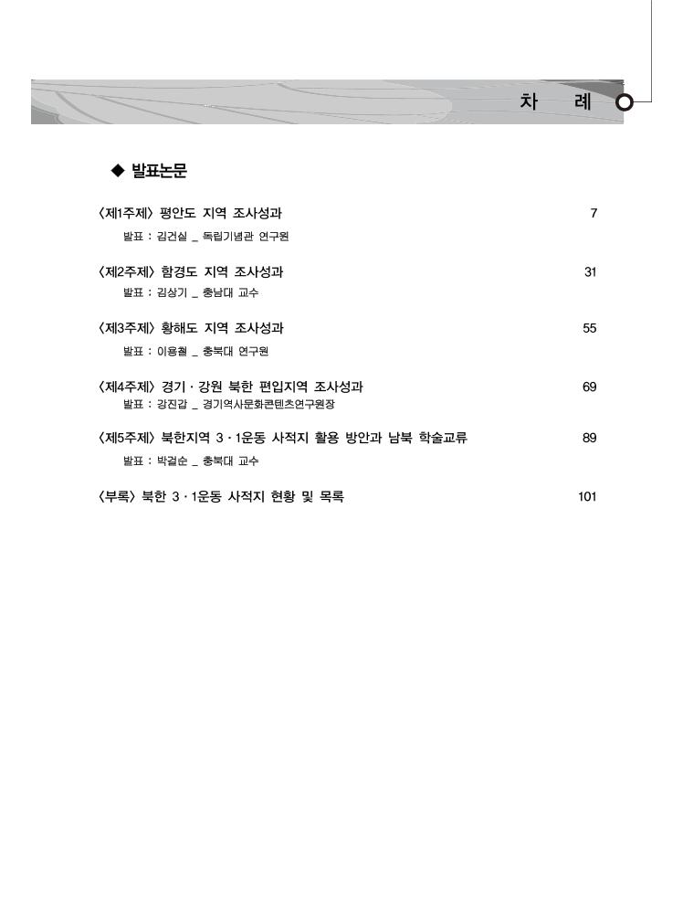 ◆ 발표논문 <제1주제> 평안도 지역 조사성과 7 발표 : 김건실 _ 독립기념관 연구원 <제2주제> 함경도 지역 조사성과 31 발표 : 김상기 _ 충남대 교수 <제3주제> 황해도 지역 조사성과 55 발표 : 이용철 _ 충북대 연구원 <제4주제> 경기·강원 북한 편입지역 조사성과 69 발표 : 강진갑 _ 경기역사문화콘텐츠연구원장 <제5주제> 북한지역 3·1운동 사적지 활용 방안과 남북 학술교류 89 발표 : 박걸순 _ 충북대 교수 <부록> 북한 3·1운동 사적지 현황 및 목록 101 차 례