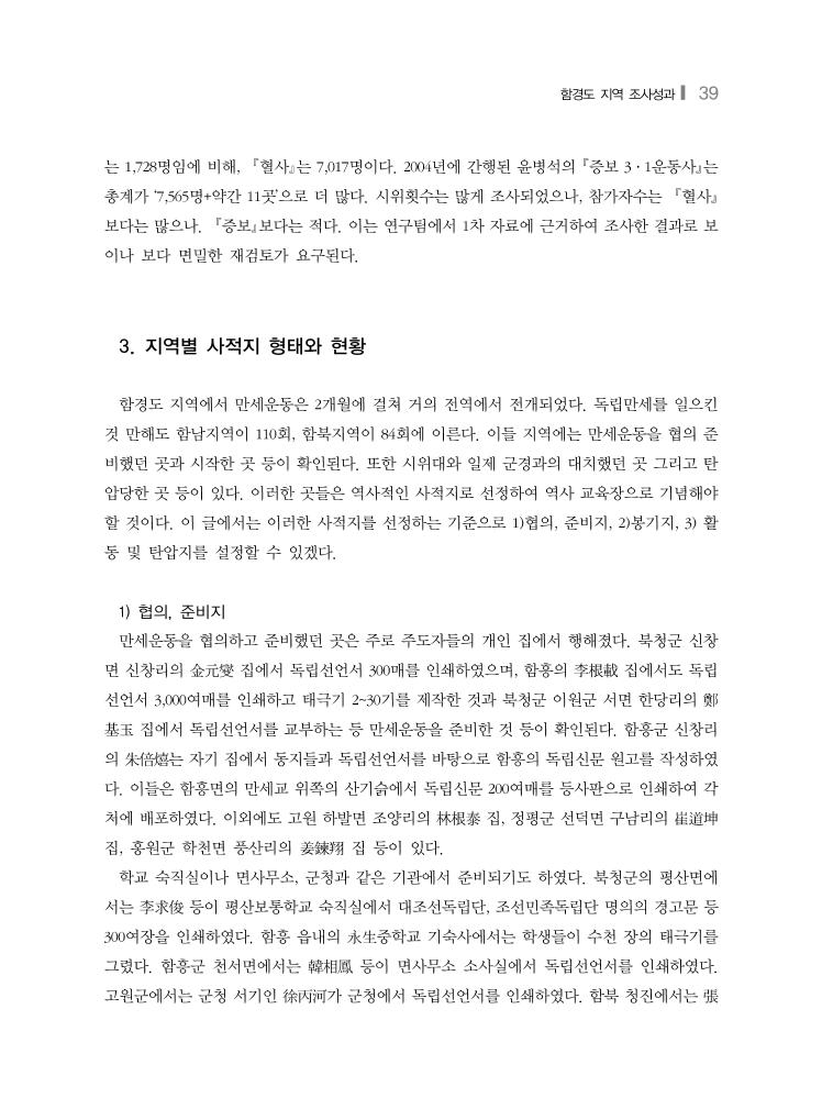 함경도 지역 조사성과❙ 39 는 1,728명임에 비해, 혈사는 7,017명이다. 2004년에 간행된 윤병석의 증보 3·1운동사는 총계가 ‘7,565명+약간 11곳’으로 더 많다. 시위횟수는 많게 조사되었으나, 참가자수는 혈사 보다는 많으나. 증보보다는 적다. 이는 연구팀에서 1차 자료에 근거하여 조사한 결과로 보 이나 보다 면밀한 재검토가 요구된다. 3. 지역별 사적지 형태와 현황 함경도 지역에서 만세운동은 2개월에 걸쳐 거의 전역에서 전개되었다. 독립만세를 일으킨 것 만해도 함남지역이 110회, 함북지역이 84회에 이른다. 이들 지역에는 만세운동을 협의 준 비했던 곳과 시작한 곳 등이 확인된다. 또한 시위대와 일제 군경과의 대치했던 곳 그리고 탄 압당한 곳 등이 있다. 이러한 곳들은 역사적인 사적지로 선정하여 역사 교육장으로 기념해야 할 것이다. 이 글에서는 이러한 사적지를 선정하는 기준으로 1)협의, 준비지, 2)봉기지, 3) 활 동 및 탄압지를 설정할 수 있겠다. 1) 협의, 준비지 만세운동을 협의하고 준비했던 곳은 주로 주도자들의 개인 집에서 행해졌다. 북청군 신창 면 신창리의 金元燮 집에서 독립선언서 300매를 인쇄하였으며, 함흥의 李根載 집에서도 독립 선언서 3,000여매를 인쇄하고 태극기 2~30기를 제작한 것과 북청군 이원군 서면 한당리의 鄭 基玉 집에서 독립선언서를 교부하는 등 만세운동을 준비한 것 등이 확인된다. 함흥군 신창리 의 朱倍熺는 자기 집에서 동지들과 독립선언서를 바탕으로 함흥의 독립신문 원고를 작성하였 다. 이들은 함흥면의 만세교 위쪽의 산기슭에서 독립신문 200여매를 등사판으로 인쇄하여 각 처에 배포하였다. 이외에도 고원 하발면 조양리의 林根泰 집, 정평군 선덕면 구남리의 崔道坤 집, 홍원군 학천면 풍산리의 姜鍊翔 집 등이 있다. 학교 숙직실이나 면사무소, 군청과 같은 기관에서 준비되기도 하였다. 북청군의 평산면에 서는 李求俊 등이 평산보통학교 숙직실에서 대조선독립단, 조선민족독립단 명의의 경고문 등 300여장을 인쇄하였다. 함흥 읍내의 永生중학교 기숙사에서는 학생들이 수천 장의 태극기를 그렸다. 함흥군 천서면에서는 韓相鳳 등이 면사무소 소사실에서 독립선언서를 인쇄하였다. 고원군에서는 군청 서기인 徐丙河가 군청에서 독립선언서를 인쇄하였다. 함북 청진에서는 張