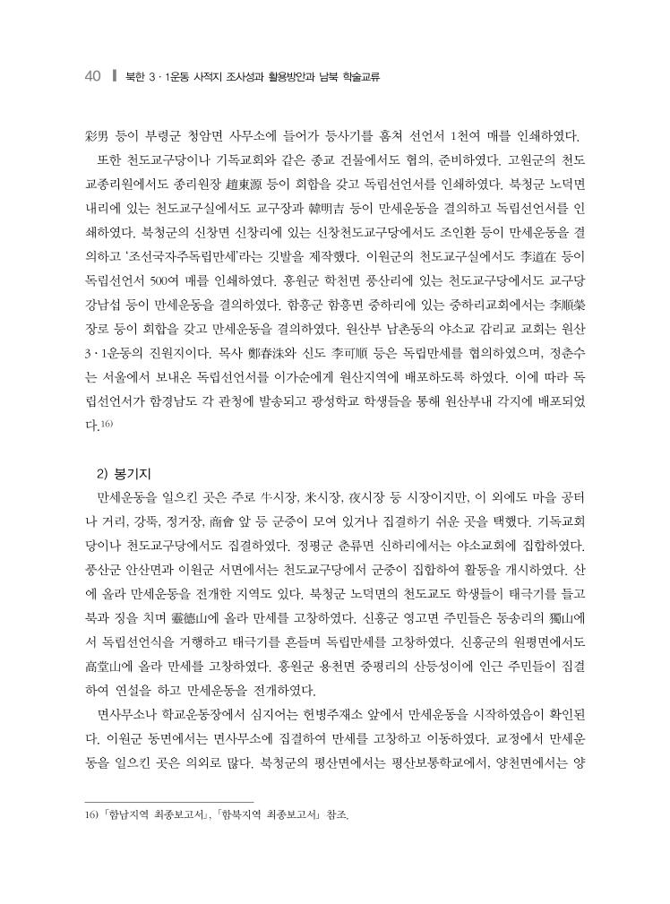 40 ❙ 북한 3·1운동 사적지 조사성과 활용방안과 남북 학술교류 彩男 등이 부령군 청암면 사무소에 들어가 등사기를 훔쳐 선언서 1천여 매를 인쇄하였다. 또한 천도교구당이나 기독교회와 같은 종교 건물에서도 협의, 준비하였다. 고원군의 천도 교종리원에서도 종리원장 趙東源 등이 회합을 갖고 독립선언서를 인쇄하였다. 북청군 노덕면 내리에 있는 천도교구실에서도 교구장과 韓明吉 등이 만세운동을 결의하고 독립선언서를 인 쇄하였다. 북청군의 신창면 신창리에 있는 신창천도교구당에서도 조인환 등이 만세운동을 결 의하고 ‘조선국자주독립만세’라는 깃발을 제작했다. 이원군의 천도교구실에서도 李道在 등이 독립선언서 500여 매를 인쇄하였다. 홍원군 학천면 풍산리에 있는 천도교구당에서도 교구당 강남섭 등이 만세운동을 결의하였다. 함흥군 함흥면 중하리에 있는 중하리교회에서는 李順榮 장로 등이 회합을 갖고 만세운동을 결의하였다. 원산부 남촌동의 야소교 감리교 교회는 원산 3·1운동의 진원지이다. 목사 鄭春洙와 신도 李可順 등은 독립만세를 협의하였으며, 정춘수 는 서울에서 보내온 독립선언서를 이가순에게 원산지역에 배포하도록 하였다. 이에 따라 독 립선언서가 함경남도 각 관청에 발송되고 광성학교 학생들을 통해 원산부내 각지에 배포되었 다.16) 2) 봉기지 만세운동을 일으킨 곳은 주로 牛시장, 米시장, 夜시장 등 시장이지만, 이 외에도 마을 공터 나 거리, 강뚝, 정거장, 商會 앞 등 군중이 모여 있거나 집결하기 쉬운 곳을 택했다. 기독교회 당이나 천도교구당에서도 집결하였다. 정평군 춘류면 신하리에서는 야소교회에 집합하였다. 풍산군 안산면과 이원군 서면에서는 천도교구당에서 군중이 집합하여 활동을 개시하였다. 산 에 올라 만세운동을 전개한 지역도 있다. 북청군 노덕면의 천도교도 학생들이 태극기를 들고 북과 징을 치며 靈德山에 올라 만세를 고창하였다. 신흥군 영고면 주민들은 동송리의 獨山에 서 독립선언식을 거행하고 태극기를 흔들며 독립만세를 고창하였다. 신흥군의 원평면에서도 高堂山에 올라 만세를 고창하였다. 홍원군 용천면 중평리의 산등성이에 인근 주민들이 집결 하여 연설을 하고 만세운동을 전개하였다. 면사무소나 학교운동장에서 심지어는 헌병주재소 앞에서 만세운동을 시작하였음이 확인된 다. 이원군 동면에서는 면사무소에 집결하여 만세를 고창하고 이동하였다. 교정에서 만세운 동을 일으킨 곳은 의외로 많다. 북청군의 평산면에서는 평산보통학교에서, 양천면에서는 양 16) 「함남지역 최종보고서」, 「함북지역 최종보고서」 참조.