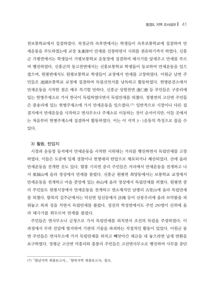 함경도 지역 조사성과❙ 41 천보통학교에서 집결하였다. 북청군의 속후면에서는 학생들이 속후보통학교에 집결하여 만 세운동을 주도하였는데 교장 朱東律이 만세를 선창하면서 시위를 권유하기까지 하였다. 신흥 군 가평면에서는 학생들이 가평보통학교 운동장에 집결하여 태극기를 앞세우고 만세를 부르 며 행진하였다. 신흥군의 동고천면에서는 신흥보통학교 학생들이 등교하여 만세운동을 일으 켰으며, 원평면에서도 원평보통학교 학생들이 교정에서 만세를 고창하였다. 이원군 남면 주 민들은 遮湖보통학교 교정에 집결하여 독립선언서를 낭독하고 활동하였다. 헌병분견소에서 만세운동을 시작한 점은 매우 특기할 만하다. 신흥군 상원천면 邊仁德 등 주민들은 구중리에 있는 헌병주재소로 가서 한국이 독립하였다면서 독립만세를 외쳤다. 정평면의 고산면 주민들 은 풍송리에 있는 헌병주재소에 가서 만세운동을 일으켰다.17) 일반적으로 시장이나 다른 집 결지에서 만세운동을 시작하고 면사무소나 주재소로 이동하는 것이 순서이지만, 이들 곳에서 는 처음부터 헌병주재소에 집결하여 활동하였다. 이는 이 지역 3·1운동의 특징으로 꼽을 수 있다. 3) 활동, 탄압지 시장과 운동장 등지에서 만세운동을 시작한 시위대는 거리를 행진하면서 독립만세를 고창 하였다. 이들은 도중에 일제 경찰이나 헌병대의 탄압으로 체포되거나 해산되었다. 산에 올라 만세운동을 전개한 곳도 있다. 함흥 기곡면 중리 주민들은 거리에서 만세운동을 전개하고 나 서 栗洞山에 올라 정상에서 만세를 불렀다. 신흥군 원평면 최양동에서는 보통학교 교정에서 만세운동을 전개하고 마을 중앙에 있는 朴山에 올라 정상에서 독립만세를 외쳤다. 원평면 중 리 주민들도 원평시장에서 만세운동을 전개하고 면소재지인 남평리 古堂山에 올라 독립만세 를 외쳤다. 함북의 길주군에서는 덕산면 일신동에서 許鴻 등이 산봉우리에 올라 모닥불을 피 워놓고 북과 징을 치면서 독립만세를 불렀다. 성진의 학성면에서도 주민 250명이 산위에 올 라 태극기를 휘두르며 만세를 불렀다. 주민들은 면사무소나 군청으로 가서 독립만세를 외치면서 조선의 독립을 주장하였다. 이 과정에서 무력 진압에 항거하여 기관의 기물을 파괴하는 직접적인 활동이 있었다. 이원군 동 면 주민들은 면사무소에 가서 독립만세를 외치고 빼앗아간 세금을 내 놓으라면 납세 반환을 요구하였다. 정평군 고산면 덕흥리와 흥봉리 주민들은 고산면사무소로 행진하여 사무를 중단 17) 「함남지역 최종보고서」, 「함북지역 최종보고서」 참조.