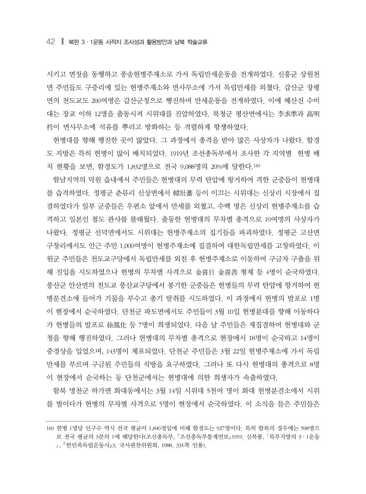 42 ❙ 북한 3·1운동 사적지 조사성과 활용방안과 남북 학술교류 시키고 면장을 동행하고 풍송헌병주재소로 가서 독립만세운동을 전개하였다. 신흥군 상원천 면 주민들도 구중리에 있는 헌병주재소와 면사무소에 가서 독립만세를 외쳤다. 갑산군 장평 면의 천도교도 200여명은 갑산군청으로 행진하며 만세운동을 전개하였다. 이에 혜산진 수비 대는 장교 이하 12명을 출동시켜 시위대를 진압하였다. 북청군 평산면에서는 李求準과 高明 哲이 면사무소에 석유를 뿌리고 방화하는 등 격렬하게 항쟁하였다. 헌병대를 향해 행진한 곳이 많았다. 그 과정에서 총격을 받아 많은 사상자가 나왔다. 함경 도 지방은 특히 헌병이 많이 배치되었다. 1919년 조선총독부에서 조사한 각 지역별 헌병 배 치 현황을 보면, 함경도가 1,832명으로 전국 9,088명의 20%에 달한다.18) 함남지역의 덕원 읍내에서 주민들은 헌병대의 무력 탄압에 항거하여 격한 군중들이 헌병대 를 습격하였다. 정평군 춘류리 신상면에서 韓壯蕃 등이 이끄는 시위대는 신상리 시장에서 집 결하였다가 일부 군중들은 우편소 앞에서 만세를 외쳤고, 수백 명은 신상리 헌병주재소를 습 격하고 일본인 철도 관사를 불태웠다. 출동한 헌병대의 무차별 총격으로 10여명의 사상자가 나왔다. 정평군 선덕면에서도 시위대는 헌병주재소의 집기들을 파괴하였다. 정평군 고산면 구창리에서도 인근 주민 1,000여명이 헌병주재소에 집결하여 대한독립만세를 고창하였다. 이 원군 주민들은 천도교구당에서 독립만세를 외친 후 헌병주재소로 이동하여 구금자 구출을 위 해 진입을 시도하였으나 헌병의 무차별 사격으로 金喜日 金喜善 형제 등 4명이 순국하였다. 풍산군 안산면의 천도교 풍산교구당에서 봉기한 군중들은 헌병들의 무력 탄압에 항거하여 헌 병분견소에 들어가 기물을 부수고 총기 탈취를 시도하였다. 이 과정에서 헌병의 발포로 1명 이 현장에서 순국하였다. 단천군 파도면에서도 주민들이 3월 10일 헌병분대를 향해 이동하다 가 헌병들의 발포로 徐鳳化 등 7명이 희생되었다. 다음 날 주민들은 재집결하여 헌병대와 군 청을 향해 행진하였다. 그러나 헌병대의 무차별 총격으로 현장에서 18명이 순국하고 14명이 중경상을 입었으며, 143명이 체포되었다. 단천군 주민들은 3월 22일 헌병주재소에 가서 독립 만세를 부르며 구금된 주민들의 석방을 요구하였다. 그러나 또 다시 헌병대의 총격으로 8명 이 현장에서 순국하는 등 단천군에서는 헌병대에 의한 희생자가 속출하였다. 함북 명천군 하가면 화대동에서는 3월 14일 시위대 5천여 명이 화대 헌병분견소에서 시위 를 벌이다가 헌병의 무차별 사격으로 5명이 현장에서 순국하였다. 이 소식을 들은 주민들은 18) 헌병 1명당 인구수 역시 전국 평균이 1,846명임에 비해 함경도는 927명이다. 특히 함북의 경우에는 598명으 로 전국 평균의 3분의 1에 해당한다(조선총독부, 조선총독부통계연보1919. 신복룡, 「북부지방의 3·1운동 」, 한민족독립운동사3, 국사편찬위원회, 1988, 331쪽 인용).