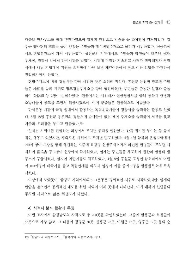 함경도 지역 조사성과❙ 43 다음날 면사무소를 향해 행진하였으며 일제의 탄압으로 박승룡 등 10여명이 검거되었다. 길 주군 양사면의 李龍圭 등은 양흥동 주민들과 합수헌병주재소로 몰려가 시위하였다. 신풍리에 서도 헌병분견소에 가서 시위하였다. 성진군의 시위에서도 주민들과 학생들이 일본인 상가, 우체국, 경찰서 앞에서 만세시위를 벌였다. 시위에 며칠간 지속되고 사태가 험악해지자 경찰 서에서 나남 기병대에 지원을 요청함에 나남 보병 제37여단에서 장교 이하 21명을 파견하여 진압하기까지 하였다. 헌병주재소에 비해 경찰서를 향해 시위한 곳은 오히려 적었다. 홍원군 용천면 평포면 주민 들은 池相鳳 등의 지휘로 평포경찰주재소를 향해 행진하였다. 주민들은 출동한 일경과 충돌 하여 朱洛祖 등 2명이 순국하였다. 원산에서는 시위대가 원산경찰서를 향해 향하자 헌병과 소방대들이 공포를 쏘면서 해산시켰으며, 이에 군중들은 원산역으로 이동했다. 만세운동 기간에 국경 일대에서 활동하는 독립운동가들이 경찰서를 습격하는 활동도 있었 다. 3월 18일 홍원군 용운면의 경찰서에 순사들이 없는 때에 주재소를 습격하여 서류를 찢고 기물과 유리창을 부수고 탈출했다.19) 일제는 시위대를 진압하는 과정에서 무차별 총격을 일삼았다. 간혹 집기를 부수는 등 공세 적인 행동도 있었지만, 평화로운 시위에도 무차별 발포하였다. 4월 4일 함북의 온성지역에서 250여 명이 시장을 향해 행진하는 도중에 북창평 헌병주재소에서 파견된 헌병들이 무차별 사 격하여 崔禹吉 등 2명이 현장에서 즉사하였다. 일제는 주민들을 체포하여 원산과 함흥의 형 무소에 구금시켰다. 심지어 어린이들도 체포하였다. 4월 8일 홍원군 포청면 삼호리에서 어린 이 100여명이 태극기를 들고 독립만세를 외치자 일경이 이들 중에 9명을 함흥형무소에 투옥 시켰다. 이상에서 보았듯이, 함경도 지역에서의 3·1운동은 평화적인 시위로 시작하였지만, 일제의 탄압을 받으면서 공세적인 태도를 취한 지역이 여러 곳에서 나타난다. 이에 대하여 헌병들의 무차별 사격으로 많은 희생자가 나왔다. 4) 사적지 분포 현황과 특징 이번 조사에서 함경남도의 사적지로 총 200곳을 확인하였는데, 그중에 함흥군과 북청군이 37곳으로 가장 많고, 그 다음이 정평군 30곳, 신흥군 22곳, 이원군 15곳, 영흥군 12곳 등의 순 19) 「함남지역 최종보고서」, 「함북지역 최종보고서」 참조.