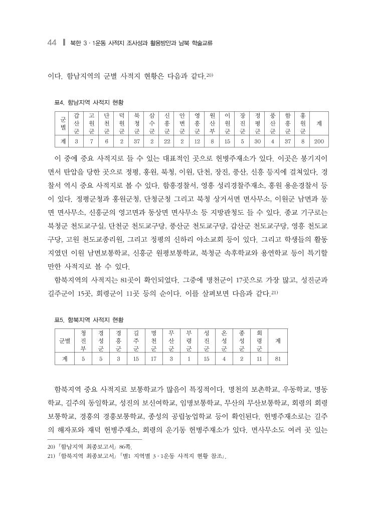 44 ❙ 북한 3·1운동 사적지 조사성과 활용방안과 남북 학술교류 이다. 함남지역의 군별 사적지 현황은 다음과 같다.20) 표4. 함남지역 사적지 현황 군 별 갑 산 군 고 원 군 단 천 군 덕 원 군 북 청 군 삼 수 군 신 흥 군 안 변 군 영 흥 군 원 산 부 이 원 군 장 진 군 정 평 군 풍 산 군 함 흥 군 홍 원 군 계 계 3 7 6 2 37 2 22 2 12 8 15 5 30 4 37 8 200 이 중에 중요 사적지로 들 수 있는 대표적인 곳으로 헌병주재소가 있다. 이곳은 봉기지이 면서 탄압을 당한 곳으로 정평, 홍원, 북청, 이원, 단천, 장진, 풍산, 신흥 등지에 걸쳐있다. 경 찰서 역시 중요 사적지로 볼 수 있다. 함흥경찰서, 영흥 성리경찰주재소, 홍원 용운경찰서 등 이 있다. 정평군청과 홍원군청, 단청군청 그리고 북청 상거서면 면사무소, 이원군 남면과 동 면 면사무소, 신흥군의 영고면과 동상면 면사무소 등 지방관청도 들 수 있다. 종교 기구로는 북청군 천도교구실, 단천군 천도교구당, 풍산군 천도교구당, 갑산군 천도교구당, 영흥 천도교 구당, 고원 천도교종리원, 그리고 정평의 신하리 야소교회 등이 있다. 그리고 학생들의 활동 지였던 이원 남면보통학교, 신흥군 원평보통학교, 북청군 속후학교와 용연학교 등이 특기할 만한 사적지로 볼 수 있다. 함북지역의 사적지는 81곳이 확인되었다. 그중에 명천군이 17곳으로 가장 많고, 성진군과 길주군이 15곳, 회령군이 11곳 등의 순이다. 이를 살펴보면 다음과 같다.21) 표5. 함북지역 사적지 현황 군별 청 진 부 경 성 군 경 흥 군 길 주 군 명 천 군 무 산 군 부 령 군 성 진 군 온 성 군 종 성 군 회 령 군 계 계 5 5 3 15 17 3 1 15 4 2 11 81 함북지역 중요 사적지로 보통학교가 많음이 특징적이다. 명천의 보촌학교, 우동학교, 명동 학교, 길주의 동일학교, 성진의 보신여학교, 임명보통학교, 무산의 무산보통학교, 회령의 회령 보통학교, 경흥의 경흥보통학교, 종성의 공립농업학교 등이 확인된다. 헌병주재소로는 길주 의 해자포와 재덕 헌병주재소, 회령의 운기동 헌병주재소가 있다. 면사무소도 여러 곳 있는 20) 「함남지역 최종보고서」 86쪽. 21) 「함북지역 최종보고서」 「별1 지역별 3·1운동 사적지 현황 참조」.