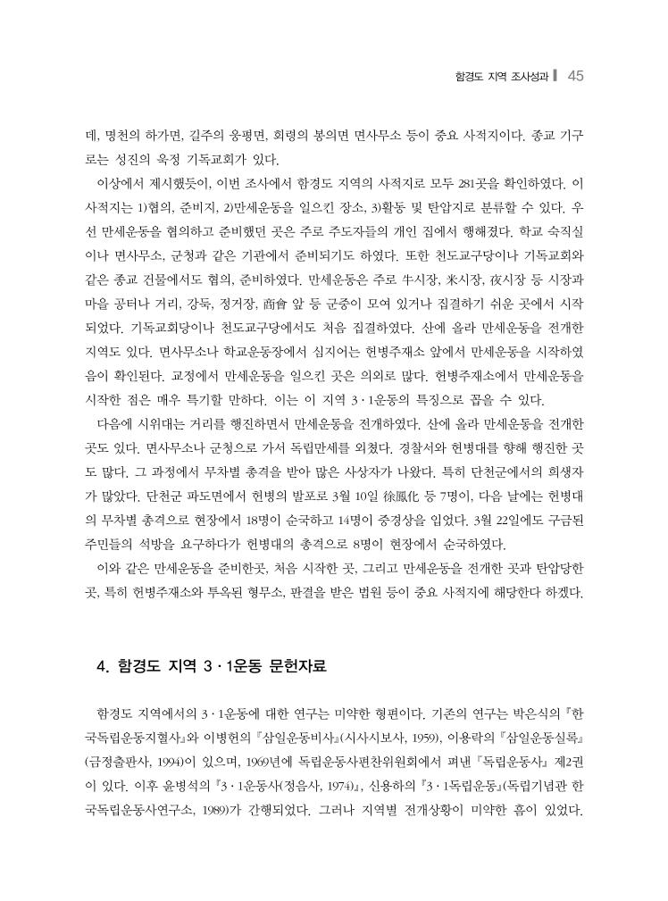 함경도 지역 조사성과❙ 45 데, 명천의 하가면, 길주의 웅평면, 회령의 봉의면 면사무소 등이 중요 사적지이다. 종교 기구 로는 성진의 욱정 기독교회가 있다. 이상에서 제시했듯이, 이번 조사에서 함경도 지역의 사적지로 모두 281곳을 확인하였다. 이 사적지는 1)협의, 준비지, 2)만세운동을 일으킨 장소, 3)활동 및 탄압지로 분류할 수 있다. 우 선 만세운동을 협의하고 준비했던 곳은 주로 주도자들의 개인 집에서 행해졌다. 학교 숙직실 이나 면사무소, 군청과 같은 기관에서 준비되기도 하였다. 또한 천도교구당이나 기독교회와 같은 종교 건물에서도 협의, 준비하였다. 만세운동은 주로 牛시장, 米시장, 夜시장 등 시장과 마을 공터나 거리, 강둑, 정거장, 商會 앞 등 군중이 모여 있거나 집결하기 쉬운 곳에서 시작 되었다. 기독교회당이나 천도교구당에서도 처음 집결하였다. 산에 올라 만세운동을 전개한 지역도 있다. 면사무소나 학교운동장에서 심지어는 헌병주재소 앞에서 만세운동을 시작하였 음이 확인된다. 교정에서 만세운동을 일으킨 곳은 의외로 많다. 헌병주재소에서 만세운동을 시작한 점은 매우 특기할 만하다. 이는 이 지역 3·1운동의 특징으로 꼽을 수 있다. 다음에 시위대는 거리를 행진하면서 만세운동을 전개하였다. 산에 올라 만세운동을 전개한 곳도 있다. 면사무소나 군청으로 가서 독립만세를 외쳤다. 경찰서와 헌병대를 향해 행진한 곳 도 많다. 그 과정에서 무차별 총격을 받아 많은 사상자가 나왔다. 특히 단천군에서의 희생자 가 많았다. 단천군 파도면에서 헌병의 발포로 3월 10일 徐鳳化 등 7명이, 다음 날에는 헌병대 의 무차별 총격으로 현장에서 18명이 순국하고 14명이 중경상을 입었다. 3월 22일에도 구금된 주민들의 석방을 요구하다가 헌병대의 총격으로 8명이 현장에서 순국하였다. 이와 같은 만세운동을 준비한곳, 처음 시작한 곳, 그리고 만세운동을 전개한 곳과 탄압당한 곳, 특히 헌병주재소와 투옥된 형무소, 판결을 받은 법원 등이 중요 사적지에 해당한다 하겠다. 4. 함경도 지역 3·1운동 문헌자료 함경도 지역에서의 3·1운동에 대한 연구는 미약한 형편이다. 기존의 연구는 박은식의 한 국독립운동지혈사와 이병헌의 삼일운동비사(시사시보사, 1959), 이용락의 삼일운동실록 (금정출판사, 1994)이 있으며, 1969년에 독립운동사편찬위원회에서 펴낸 독립운동사 제2권 이 있다. 이후 윤병석의 3·1운동사(정음사, 1974), 신용하의 3·1독립운동(독립기념관 한 국독립운동사연구소, 1989)가 간행되었다. 그러나 지역별 전개상황이 미약한 흠이 있었다.