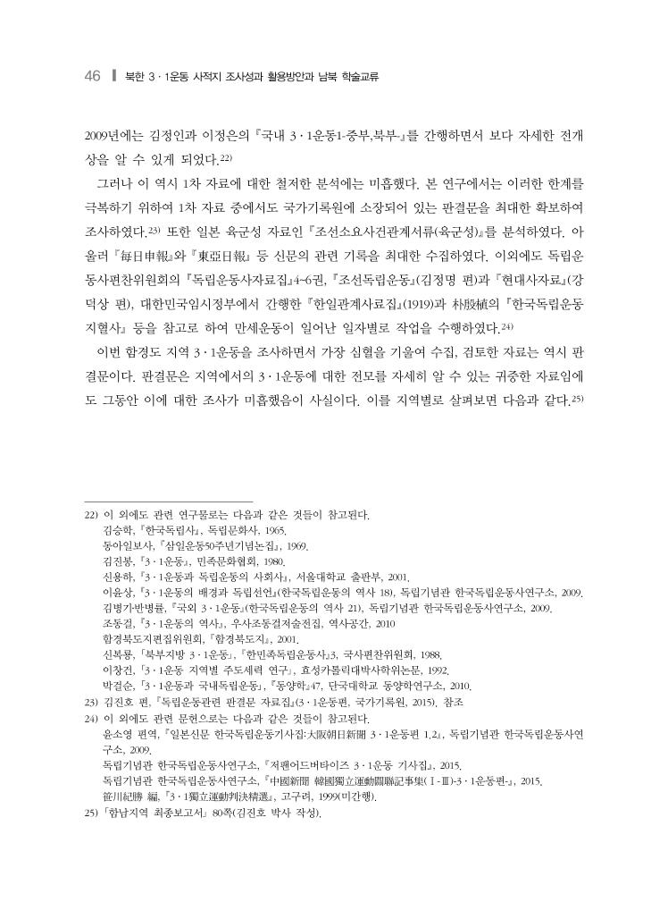 46 ❙ 북한 3·1운동 사적지 조사성과 활용방안과 남북 학술교류 2009년에는 김정인과 이정은의 국내 3·1운동1-중부,북부-를 간행하면서 보다 자세한 전개 상을 알 수 있게 되었다.22) 그러나 이 역시 1차 자료에 대한 철저한 분석에는 미흡했다. 본 연구에서는 이러한 한계를 극복하기 위하여 1차 자료 중에서도 국가기록원에 소장되어 있는 판결문을 최대한 확보하여 조사하였다.23) 또한 일본 육군성 자료인 조선소요사건관계서류(육군성)를 분석하였다. 아 울러 每日申報와 東亞日報 등 신문의 관련 기록을 최대한 수집하였다. 이외에도 독립운 동사편찬위원회의 독립운동사자료집4~6권, 조선독립운동(김정명 편)과 현대사자료(강 덕상 편), 대한민국임시정부에서 간행한 한일관계사료집(1919)과 朴殷植의 한국독립운동 지혈사 등을 참고로 하여 만세운동이 일어난 일자별로 작업을 수행하였다.24) 이번 함경도 지역 3·1운동을 조사하면서 가장 심혈을 기울여 수집, 검토한 자료는 역시 판 결문이다. 판결문은 지역에서의 3·1운동에 대한 전모를 자세히 알 수 있는 귀중한 자료임에 도 그동안 이에 대한 조사가 미흡했음이 사실이다. 이를 지역별로 살펴보면 다음과 같다.25) 22) 이 외에도 관련 연구물로는 다음과 같은 것들이 참고된다. 김승학, 한국독립사, 독립문화사, 1965. 동아일보사, 삼일운동50주년기념논집, 1969. 김진봉, 3·1운동, 민족문화협회, 1980. 신용하, 3·1운동과 독립운동의 사회사, 서울대학교 출판부, 2001. 이윤상, 3·1운동의 배경과 독립선언(한국독립운동의 역사 18), 독립기념관 한국독립운동사연구소, 2009. 김병기․반병률, 국외 3·1운동(한국독립운동의 역사 21), 독립기념관 한국독립운동사연구소, 2009. 조동걸, 3·1운동의 역사, 우사조동걸저술전집, 역사공간, 2010 함경북도지편집위원회, 함경북도지, 2001. 신복룡, 「북부지방 3·1운동」, 한민족독립운동사3, 국사편찬위원회, 1988. 이창건, 「3·1운동 지역별 주도세력 연구」, 효성카톨릭대박사학위논문, 1992. 박걸순, 「3·1운동과 국내독립운동」, 동양학47, 단국대학교 동양학연구소, 2010. 23) 김진호 편, 독립운동관련 판결문 자료집(3·1운동편, 국가기록원, 2015). 참조 24) 이 외에도 관련 문헌으로는 다음과 같은 것들이 참고된다. 윤소영 편역, 일본신문 한국독립운동기사집:大阪朝日新聞 3·1운동편 1.2, 독립기념관 한국독립운동사연 구소, 2009. 독립기념관 한국독립운동사연구소, 저팬어드버타이즈 3·1운동 기사집, 2015. 독립기념관 한국독립운동사연구소, 中國新聞 韓國獨立運動關聯記事集(Ⅰ-Ⅲ)-3·1운동편-, 2015. 笹川紀勝 編, 3·1獨立運動判決精選, 고구려, 1999(미간행). 25) 「함남지역 최종보고서」 80쪽(김진호 박사 작성).