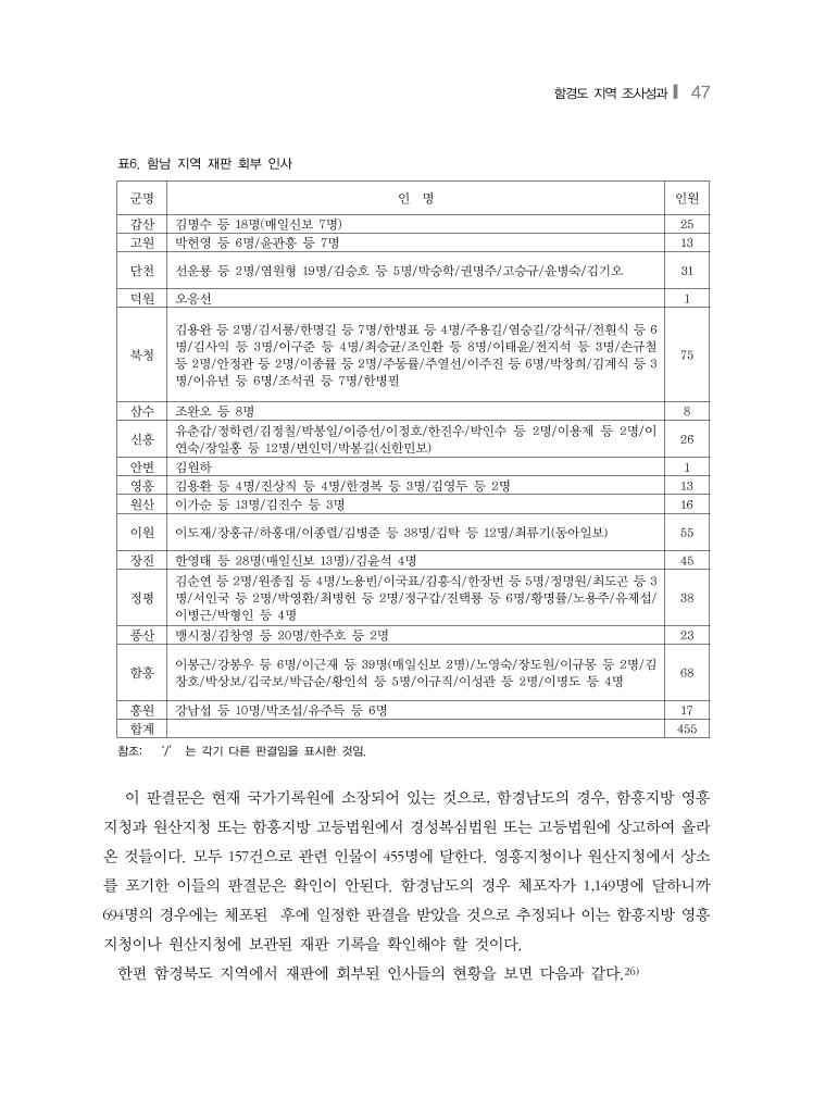 함경도 지역 조사성과❙ 47 표6. 함남 지역 재판 회부 인사 군명 인 명 인원 갑산 김명수 등 18명(매일신보 7명) 25 고원 박헌영 등 6명/윤관흥 등 7명 13 단천 선운룡 등 2명/염원형 19명/김승호 등 5명/박승학/권명주/고승규/윤병숙/김기오 31 덕원 오응선 1 북청 김용완 등 2명/김서룡/한명길 등 7명/한병표 등 4명/주용길/염승길/강석규/전훤식 등 6 명/김사익 등 3명/이구준 등 4명/최승균/조인환 등 8명/이태윤/전지석 등 3명/손규철 등 2명/안정관 등 2명/이종률 등 2명/주동률/주열선/이주진 등 6명/박창희/김계식 등 3 명/이유년 등 6명/조석권 등 7명/한병필 75 삼수 조완오 등 8명 8 신흥 유춘갑/정학련/김정칠/박봉일/이증선/이정호/한진우/박인수 등 2명/이용제 등 2명/이 연숙/장일홍 등 12명/변인덕/박봉길(신한민보) 26 안변 김원하 1 영흥 김용환 등 4명/진상직 등 4명/한경복 등 3명/김영두 등 2명 13 원산 이가순 등 13명/김진수 등 3명 16 이원 이도재/장홍규/하홍대/이종렬/김병준 등 38명/김탁 등 12명/최류기(동아일보) 55 장진 한영태 등 28명(매일신보 13명)/김윤석 4명 45 정평 김순연 등 2명/원종집 등 4명/노용빈/이국표/김흥식/한장번 등 5명/정명원/최도곤 등 3 명/서인국 등 2명/박영환/최병헌 등 2명/정구갑/진택룡 등 6명/황명률/노용주/유제섭/ 이병근/박형인 등 4명 38 풍산 맹시정/김창영 등 20명/한주호 등 2명 23 함흥 이봉근/강봉우 등 6명/이근재 등 39명(매일신보 2명)/노영숙/장도원/이규몽 등 2명/김 창호/박상보/김국보/박금순/황인석 등 5명/이규직/이성관 등 2명/이명도 등 4명 68 홍원 강남섭 등 10명/박조섭/유주득 등 6명 17 합계 455 참조: ‘/’ 는 각기 다른 판결임을 표시한 것임. 이 판결문은 현재 국가기록원에 소장되어 있는 것으로, 함경남도의 경우, 함흥지방 영흥 지청과 원산지청 또는 함흥지방 고등법원에서 경성복심법원 또는 고등법원에 상고하여 올라 온 것들이다. 모두 157건으로 관련 인물이 455명에 달한다. 영흥지청이나 원산지청에서 상소 를 포기한 이들의 판결문은 확인이 안된다. 함경남도의 경우 체포자가 1,149명에 달하니까 694명의 경우에는 체포된 후에 일정한 판결을 받았을 것으로 추정되나 이는 함흥지방 영흥 지청이나 원산지청에 보관된 재판 기록을 확인해야 할 것이다. 한편 함경북도 지역에서 재판에 회부된 인사들의 현황을 보면 다음과 같다.26)