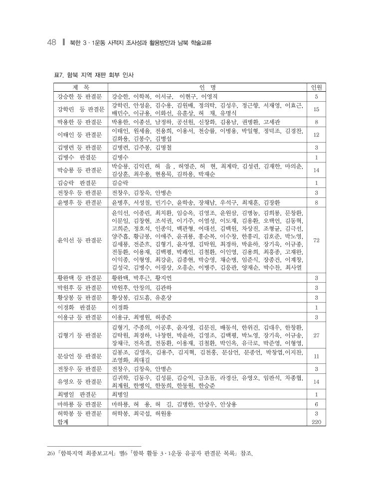 48 ❙ 북한 3·1운동 사적지 조사성과 활용방안과 남북 학술교류 표7. 함북 지역 재판 회부 인사 제 목 인 명 인원 강승한 등 판결문 강승한, 이학복, 이서규, 이현구, 이영직 5 강학린 등 판결문 강학린, 안성윤, 김수용, 김원배, 정의탁, 김성우, 정근향, 서재영, 이효근, 배민수, 이규용, 이화선, 유훈상, 허 채, 유명식 15 박용한 등 판결문 박용한, 이종선, 남정하, 공선원, 신창화, 김용남, 권병환, 고세관 8 이태인 등 판결문 이태인, 원세율, 전용희, 이용서, 천승률, 이병용, 박일형, 정덕조, 김경찬, 김화용, 김봉수, 김병섭 12 김병련 등 판결문 김병련, 김주봉, 김명철 3 김병수 판결문 김병수 1 박승룡 등 판결문 박승룡, 김익련, 허 을 , 허영준, 허 현, 최계락, 김성련, 김재한, 마의춘, 김상훈, 최우용, 현용묵, 김하용, 박재순 14 김승락 판결문 김승락 1 전창우 등 판결문 전창우, 김창욱, 안병손 3 윤병후 등 판결문 윤병후, 서성칠, 민기수, 윤학송, 장채남, 우석구, 최재훈, 김장환 8 윤익선 등 판결문 윤익선, 이종린, 최치환, 임승옥, 김영조, 윤원삼, 김병농, 김희룡, 문창환, 이문일, 김창현, 조석권, 이기주, 이열성, 이도재, 김용환, 오택언, 김동혁, 고희준, 정호석, 인종익, 백관형, 어대선, 김백원, 차상진, 조형균, 김극선, 양주흡, 황금봉, 이애주, 윤귀룡, 홍순복, 이수창, 한흥리, 김호준, 박노영, 김세룡, 전준흐, 김형기, 윤자영, 김탁원, 최경하, 박윤하, 장기욱, 이규종, 전동환, 이용재, 김백평, 박쾌인, 김철환, 이인영, 김용희, 최흥종, 고재완, 이익종, 이형영, 최강윤, 김종현, 박승영, 채순병, 임준식, 장종건, 이계창, 김성국, 김병수, 이굉상, 오흥순, 이병주, 김응관, 양재순, 박수찬, 최사열 72 황완택 등 판결문 황완택, 박후근, 황지연 3 박원후 등 판결문 박원후, 안창의, 김관하 3 황상봉 등 판결문 황상봉, 김도흠, 유훈상 3 이경화 판결문 이경화 1 이용규 등 판결문 이용규, 최병원, 허종준 3 김형기 등 판결문 김형기, 주종의, 이공후, 윤자영, 김문진, 배동석, 한위건, 김대우, 한창환, 김탁원, 최경하, 나창헌, 박윤하, 김영조, 김백평, 박노영, 장기욱, 이규송, 장채극, 전옥결, 전동환, 이용재, 김철환, 박인옥, 유극로, 박준영, 이형영, 27 문삼언 등 판결문 김봉조, 김영옥, 김용주, 김지혁, 김천홍, 문삼언, 문종언, 박창엽,이지찬, 조영화, 최대길 11 전창우 등 판결문 전창우, 김창욱, 안병손 3 유영오 등 판결문 김귀학, 김동우, 김성륜, 김승익, 금초돌, 라경산, 유영오, 임판석, 차종협, 최계원, 한병익, 한동희, 한동원, 한승준 14 최병일 판결문 최병일 1 마하룡 등 판결문 마하룡, 허 용, 허 길, 김병한, 안상우, 안상용 6 허학봉 등 판결문 허학봉, 최국섭, 허원용 3 합계 220 26) 「함북지역 최종보고서」 별6 「함북 활동 3·1운동 유공자 판결문 목록」 참조.
