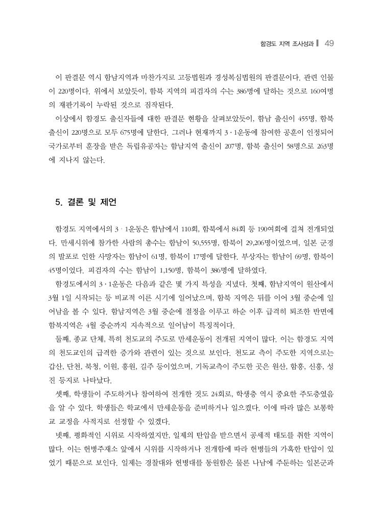 함경도 지역 조사성과❙ 49 이 판결문 역시 함남지역과 마찬가지로 고등법원과 경성복심법원의 판결문이다. 관련 인물 이 220명이다. 위에서 보았듯이, 함북 지역의 피검자의 수는 386명에 달하는 것으로 160여명 의 재판기록이 누락된 것으로 짐작된다. 이상에서 함경도 출신자들에 대한 판결문 현황을 살펴보았듯이, 함남 출신이 455명, 함북 출신이 220명으로 모두 675명에 달한다. 그러나 현재까지 3·1운동에 참여한 공훈이 인정되어 국가로부터 훈장을 받은 독립유공자는 함남지역 출신이 207명, 함북 출신이 58명으로 263명 에 지나지 않는다. 5. 결론 및 제언 함경도 지역에서의 3・1운동은 함남에서 110회, 함북에서 84회 등 190여회에 걸쳐 전개되었 다. 만세시위에 참가한 사람의 총수는 함남이 50,555명, 함북이 29,206명이었으며, 일본 군경 의 발포로 인한 사망자는 함남이 61명, 함북이 17명에 달한다. 부상자는 함남이 69명, 함북이 45명이었다. 피검자의 수는 함남이 1,150명, 함북이 386명에 달하였다. 함경도에서의 3·1운동은 다음과 같은 몇 가지 특성을 지녔다. 첫째, 함남지역이 원산에서 3월 1일 시작되는 등 비교적 이른 시기에 일어났으며, 함북 지역은 뒤를 이어 3월 중순에 일 어남을 볼 수 있다. 함남지역은 3월 중순에 절정을 이루고 하순 이후 급격히 퇴조한 반면에 함북지역은 4월 중순까지 지속적으로 일어남이 특징적이다. 둘째, 종교 단체, 특히 천도교의 주도로 만세운동이 전개된 지역이 많다. 이는 함경도 지역 의 천도교인의 급격한 증가와 관련이 있는 것으로 보인다. 천도교 측이 주도한 지역으로는 갑산, 단천, 북청, 이원, 흥원, 길주 등이었으며, 기독교측이 주도한 곳은 원산, 함흥, 신흥, 성 진 등지로 나타났다. 셋째, 학생들이 주도하거나 참여하여 전개한 것도 24회로, 학생층 역시 중요한 주도층였음 을 알 수 있다. 학생들은 학교에서 만세운동을 준비하거나 일으켰다. 이에 따라 많은 보통학 교 교정을 사적지로 선정할 수 있겠다. 넷째, 평화적인 시위로 시작하였지만, 일제의 탄압을 받으면서 공세적 태도를 취한 지역이 많다. 이는 헌병주재소 앞에서 시위를 시작하거나 전개함에 따라 헌병들의 가혹한 탄압이 있 었기 때문으로 보인다. 일제는 경찰대와 헌병대를 동원함은 물론 나남에 주둔하는 일본군과