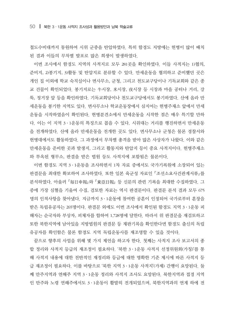 50 ❙ 북한 3·1운동 사적지 조사성과 활용방안과 남북 학술교류 철도수비대까지 동원하여 시위 군중을 탄압하였다. 특히 함경도 지방에는 헌병이 많이 배치 된 결과 이들의 무차별 발포로 많은 희생이 발생하였다. 이번 조사에서 함경도 지역의 사적지로 모두 281곳을 확인하였다. 이들 사적지는 1)협의, 준비지, 2)봉기지, 3)활동 및 탄압지로 분류할 수 있다. 만세운동을 협의하고 준비했던 곳은 개인 집 이외에 학교 숙직실이나 면사무소, 군청, 그리고 천도교구당이나 기독교회와 같은 종 교 건물이 확인되었다. 봉기지로는 牛시장, 米시장, 夜시장 등 시장과 마을 공터나 거리, 강 뚝, 정거장 앞 등을 확인하였다. 기독교회당이나 천도교구당에서도 봉기하였다. 산에 올라 만 세운동을 봉기한 지역도 있다. 면사무소나 학교운동장에서 심지어는 헌병주재소 앞에서 만세 운동을 시작하였음이 확인된다. 헌병분견소에서 만세운동을 시작한 점은 매우 특기할 만하 다. 이는 이 지역 3·1운동의 특징으로 꼽을 수 있다. 시위대는 거리를 행진하면서 만세운동 을 전개하였다. 산에 올라 만세운동을 전개한 곳도 있다. 면사무소나 군청은 물론 경찰서와 헌병대에서도 활동하였다. 그 과정에서 무차별 총격을 받아 많은 사상자가 나왔다. 이와 같은 만세운동을 준비한 곳과 발생지, 그리고 활동지와 탄압지 등이 중요 사적지이다. 헌병주재소 와 투옥된 형무소, 판결을 받은 법원 등도 사적지에 포함됨은 물론이다. 이번 함경도 지역 3·1운동을 조사하면서 1차 자료 중에서도 국가기록원에 소장되어 있는 판결문을 최대한 확보하여 조사하였다. 또한 일본 육군성 자료인 조선소요사건관계서류를 분석하였다. 아울러 每日申報와 東亞日報 등 신문의 관련 기록을 최대한 수집하였다. 그 중에 가장 심혈을 기울여 수집, 검토한 자료는 역시 판결문이다. 판결문 분석 결과 모두 675 명의 인적사항을 찾아냈다. 지금까지 3·1운동에 참여한 공훈이 인정되어 국가로부터 훈장을 받은 독립유공자는 265명이다. 판결문 외에도 이번 조사에서 확인된 함경도 지역 3·1운동 피 해자는 순국자와 부상자, 피체자를 합하여 1,728명에 달한다. 따라서 위 판결문을 재검토하고 또한 북한지역에 남아있을 지방법원의 판결문 등 재판기록을 확인한다면 함경도 출신의 독립 유공자를 확인함은 물론 함경도 지역 독립운동사를 재조명할 수 있을 것이다. 끝으로 향후의 사업을 위해 몇 가지 제언을 하고자 한다. 첫째는 사적지 조사 보고서의 종 합 정리와 사적지 등급의 재조정이 필요하다. ‘북한 3·1운동 사적지 선정위원회(가칭)’를 통 해 사적지 내용에 대한 전반적인 재정리와 등급에 대한 명확한 기준 제시에 따른 사적지 등 급 재조정이 필요하다. 이를 바탕으로 ‘북한 지역 3·1운동 사적지’(가제) 간행이 요망된다. 둘 째 만주지역과 연해주 지역 3·1운동 정리와 사적지 조사도 요망된다. 북한지역과 접경 지역 인 만주와 노령 연해주에서도 3·1운동이 활발히 전개되었으며, 북한지역과의 연계 하에 전