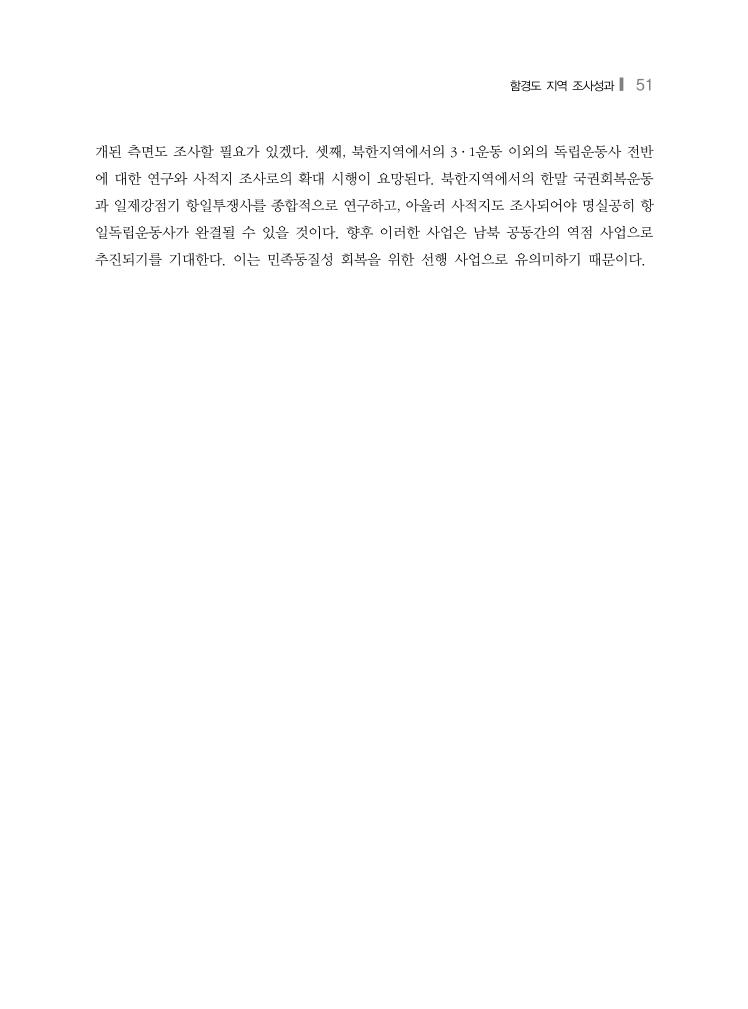 함경도 지역 조사성과❙ 51 개된 측면도 조사할 필요가 있겠다. 셋째, 북한지역에서의 3·1운동 이외의 독립운동사 전반 에 대한 연구와 사적지 조사로의 확대 시행이 요망된다. 북한지역에서의 한말 국권회복운동 과 일제강점기 항일투쟁사를 종합적으로 연구하고, 아울러 사적지도 조사되어야 명실공히 항 일독립운동사가 완결될 수 있을 것이다. 향후 이러한 사업은 남북 공동간의 역점 사업으로 추진되기를 기대한다. 이는 민족동질성 회복을 위한 선행 사업으로 유의미하기 때문이다.
