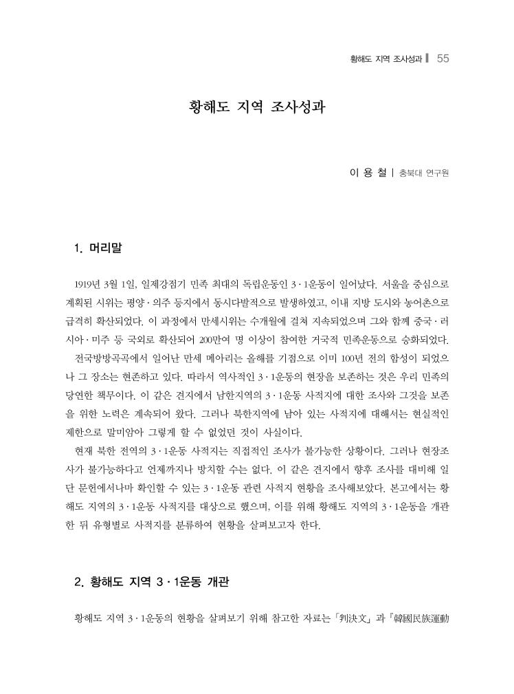 황해도 지역 조사성과❙ 55 황해도 지역 조사성과 이 용 철 | 충북대 연구원 1. 머리말 1919년 3월 1일, 일제강점기 민족 최대의 독립운동인 3·1운동이 일어났다. 서울을 중심으로 계획된 시위는 평양·의주 등지에서 동시다발적으로 발생하였고, 이내 지방 도시와 농어촌으로 급격히 확산되었다. 이 과정에서 만세시위는 수개월에 걸쳐 지속되었으며 그와 함께 중국·러 시아·미주 등 국외로 확산되어 200만여 명 이상이 참여한 거국적 민족운동으로 승화되었다. 전국방방곡곡에서 일어난 만세 메아리는 올해를 기점으로 이미 100년 전의 함성이 되었으 나 그 장소는 현존하고 있다. 따라서 역사적인 3·1운동의 현장을 보존하는 것은 우리 민족의 당연한 책무이다. 이 같은 견지에서 남한지역의 3·1운동 사적지에 대한 조사와 그것을 보존 을 위한 노력은 계속되어 왔다. 그러나 북한지역에 남아 있는 사적지에 대해서는 현실적인 제한으로 말미암아 그렇게 할 수 없었던 것이 사실이다. 현재 북한 전역의 3·1운동 사적지는 직접적인 조사가 불가능한 상황이다. 그러나 현장조 사가 불가능하다고 언제까지나 방치할 수는 없다. 이 같은 견지에서 향후 조사를 대비해 일 단 문헌에서나마 확인할 수 있는 3·1운동 관련 사적지 현황을 조사해보았다. 본고에서는 황 해도 지역의 3·1운동 사적지를 대상으로 했으며, 이를 위해 황해도 지역의 3·1운동을 개관 한 뒤 유형별로 사적지를 분류하여 현황을 살펴보고자 한다. 2. 황해도 지역 3·1운동 개관 황해도 지역 3·1운동의 현황을 살펴보기 위해 참고한 자료는 「判決文」과 韓國民族運動