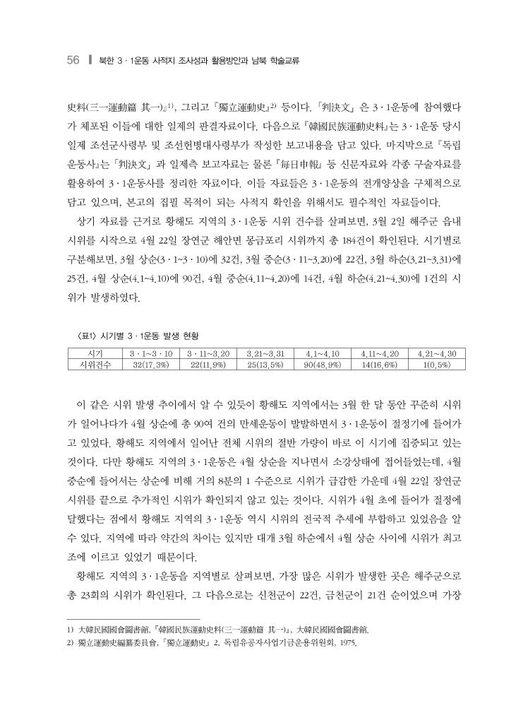 56 ❙ 북한 3·1운동 사적지 조사성과 활용방안과 남북 학술교류 시기 3·1~3·10 3·11~3.20 3.21~3.31 4.1~4.10 4.11~4.20 4.21~4.30 시위건수 32(17.3%) 22(11.9%) 25(13.5%) 90(48.9%) 14(16.6%) 1(0.5%) <표1> 시기별 3·1운동 발생 현황 史料(三一運動篇 其一)1), 그리고 獨立運動史2) 등이다. 「判決文」은 3·1운동에 참여했다 가 체포된 이들에 대한 일제의 판결자료이다. 다음으로 韓國民族運動史料는 3·1운동 당시 일제 조선군사령부 및 조선헌병대사령부가 작성한 보고내용을 담고 있다. 마지막으로 독립 운동사는 「判決文」과 일제측 보고자료는 물론 每日申報 등 신문자료와 각종 구술자료를 활용하여 3·1운동사를 정리한 자료이다. 이들 자료들은 3·1운동의 전개양상을 구체적으로 담고 있으며, 본고의 집필 목적이 되는 사적지 확인을 위해서도 필수적인 자료들이다. 상기 자료를 근거로 황해도 지역의 3·1운동 시위 건수를 살펴보면, 3월 2일 해주군 읍내 시위를 시작으로 4월 22일 장연군 해안면 몽금포리 시위까지 총 184건이 확인된다. 시기별로 구분해보면, 3월 상순(3·1~3·10)에 32건, 3월 중순(3·11~3.20)에 22건, 3월 하순(3.21~3.31)에 25건, 4월 상순(4.1~4.10)에 90건, 4월 중순(4.11~4.20)에 14건, 4월 하순(4.21~4.30)에 1건의 시 위가 발생하였다. 이 같은 시위 발생 추이에서 알 수 있듯이 황해도 지역에서는 3월 한 달 동안 꾸준히 시위 가 일어나다가 4월 상순에 총 90여 건의 만세운동이 발발하면서 3·1운동이 절정기에 들어가 고 있었다. 황해도 지역에서 일어난 전체 시위의 절반 가량이 바로 이 시기에 집중되고 있는 것이다. 다만 황해도 지역의 3·1운동은 4월 상순을 지나면서 소강상태에 접어들었는데, 4월 중순에 들어서는 상순에 비해 거의 8분의 1 수준으로 시위가 급감한 가운데 4월 22일 장연군 시위를 끝으로 추가적인 시위가 확인되지 않고 있는 것이다. 시위가 4월 초에 들어가 절정에 달했다는 점에서 황해도 지역의 3·1운동 역시 시위의 전국적 추세에 부합하고 있었음을 알 수 있다. 지역에 따라 약간의 차이는 있지만 대개 3월 하순에서 4월 상순 사이에 시위가 최고 조에 이르고 있었기 때문이다. 황해도 지역의 3·1운동을 지역별로 살펴보면, 가장 많은 시위가 발생한 곳은 해주군으로 총 23회의 시위가 확인된다. 그 다음으로는 신천군이 22건, 금천군이 21건 순이었으며 가장 1) 大韓民國國會圖書館, 韓國民族運動史料(三一運動篇 其一), 大韓民國國會圖書館. 2) 獨立運動史編纂委員會, 獨立運動史 2, 독립유공자사업기금운용위원회, 1975.