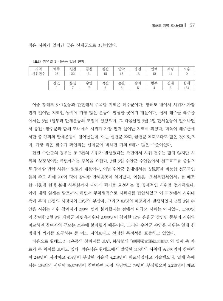 황해도 지역 조사성과❙ 57 지역 해주 신천 금천 평산 안악 옹진 연백 재령 서흥 시위건수 23 22 21 15 13 13 12 11 9 장연 봉산 수안 곡산 은율 송화 황주 신계 합계 9 7 7 5 5 5 4 3 184 <표2> 지역별 3·1운동 발생 현황 적은 시위가 일어난 곳은 신계군으로 3건이었다. 이중 황해도 3·1운동과 관련해서 주목할 지역은 해주군이다. 황해도 내에서 시위가 가장 먼저 일어난 지역인 동시에 가장 많은 운동이 발생한 곳이기 때문이다. 실제 해주군 해주읍 에서는 3월 1일부터 만세운동의 조짐이 있었으며, 그 다음날인 3월 2일 만세운동이 일어나면 서 옹진·황주군과 함께 도내에서 시위가 가장 먼저 일어난 지역이 되었다. 더욱이 해주군에 서만 총 23회의 만세운동이 일어났는데, 이는 신천군 22회, 금천군 21회보다도 많은 것이었으 며, 가장 적은 횟수가 확인되는 신계군에 비하면 거의 8배나 많은 수준이었다. 한편 수안군의 경우는 총 7건의 시위가 발생했다는 측면에서 시위 건수는 많지 않지만 시 위의 상징성이란 측면에서는 주목을 요한다. 3월 3일 수안군 수안읍에서 천도교도를 중심으 로 괄목할 만한 시위가 있었기 때문이다. 이날 수안군 읍내에서는 安鳳河를 비롯한 천도교인 들의 주도 하에 200여 명이 참여한 만세운동이 일어났다. 이들은 「조선독립선언서」를 배포 한 가운데 헌병 분대 사무실까지 나아가 퇴거를 요청하는 등 공세적인 시위를 전개하였다. 이에 대해 일제는 발포까지 하면서 무차별적으로 시위대를 탄압하였고 이 과정에서 시위대 측에 무려 13명의 사망자와 18명의 부상자, 그리고 83명의 체포자가 발생하였다. 3월 3일 수 안읍 시위는 시위 참여자가 200여 명에 불과했다는 점에서 대규모 시위는 아니었다. 1,500명 이 참여한 3월 9일 재령군 재령읍시위나 3,000명이 참여한 12일 은율군 장연면 동부리 시위와 비교하면 참여자의 규모는 소수에 불과했기 때문이다. 그러나 수안군 수안읍 시위는 일제 헌 병대의 퇴거를 요구하는 등 어느 지역보다도 선명한 목적성을 표출하고 있었다. 다음으로 황해도 3·1운동의 참여자를 보면, 朴殷植의 韓國獨立運動之血史와 일제 측 자 료가 큰 차이를 보이고 있다. 박은식은 황해도에서 발생한 115회의 시위에 92,670명이 참여하 여 238명이 사망하고 414명이 부상한 가운데 4,218명이 체포되었다고 기술했으나, 일제 측에 서는 104회의 시위에 38,073명이 참여하여 36명 사망하고 79명이 부상했으며 2,210명이 체포
