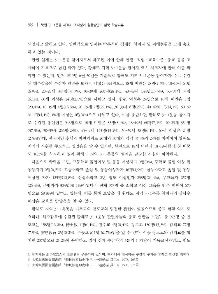58 ❙ 북한 3·1운동 사적지 조사성과 활용방안과 남북 학술교류 되었다고 밝히고 있다. 일반적으로 일제는 박은식이 집계한 참여자 및 피해현황을 크게 축소 하고 있는 것이다. 한편 일제는 3·1운동 참여자로서 체포된 이에 한해 연령·직업·교육수준·종교 등을 조 사하여 기록으로 남긴 바가 있다. 황해도 지역 3·1운동 참여자 역시 체포자에 한해 이를 파 악할 수 있는데, 먼저 1919년 6월 30일을 기준으로 황해도 지역 3·1운동 참여자가 주로 수감 된 해주감옥의 수감자 연령을 보자3). 남성은 924명으로 18세 미만은 28명(2.5%), 18~19세 64명 (6.9%), 20~29세 347명(37.5%), 30~39세 260명(28.1%), 40~49세 144명(15.5%), 50~59세 57명 (6.1%), 60세 이상은 24명(2.5%)으로 나뉘고 있다. 한편 여성은 24명으로 18세 미만은 5명 (20.8%), 18~19세 4명(16.6%), 20~29세 7명(29.1%), 30~39세 6명(25%), 40~49세 1명(4.1%), 50~59 세 1명(4.1%), 60세 이상은 0명(0%)으로 나뉘고 있다. 이를 종합하면 황해도 3·1운동 참여자 로 수감된 총인원은 948명으로 18세 미만은 33명(3.4%), 18~19세 68명(7.1%), 20~29세 354명 (37.3%), 30~39세 266명(28%), 40~49세 145명(15.2%), 50~59세 58명(6.1%), 60세 이상은 24명 (2.5%)인데, 전국적인 추세와 마찬가지로 20대와 30대가 각각 37.3%와 28%를 차지하여 황해도 지역의 시위를 주도하고 있었음을 알 수 있지만, 한편으로 18세 미만과 18~19세를 합친 비중 도 10.5%를 차지하고 있어 황해도 지역 3·1운동의 일익을 담당한 사실이 파악된다. 다음으로 학력을 보면, 고등학교 졸업이상 및 동등 이상자가 0명(0%), 중학교 졸업 이상 및 동등자가 2명(0.2%), 고등소학교 졸업 및 동등이상자가 48명(4.9%), 심상소학교 졸업 및 동등 이상인 자가 125명(12.8%), 심상소학교 2년 정도 이상인자 238명(24.4%), 무교육자 257명 (26.4%), 문맹자가 303명(31.1%)이었다.4) 전체 973명 중 소학교 이상 교육을 받은 인원이 670 명으로 68.8%에 달하고 있는데, 이를 통해 보았을 때 황해도 지역 3·1운동 참여자의 상당수 이상은 교육을 받았음을 알 수 있다. 황해도 지역 3·1운동은 기독교와 천도교와 밀접한 관련이 있었으므로 종교 현황 역시 중 요하다. 해주감옥에 수감된 황해도 3·1운동 관련자들의 종교 현황을 보면5), 총 973명 중 천 도교는 158명(16.2%), 侍土敎 1명(0.1%), 천주교 4명(0.4%), 장로교 130명(13.3%), 감리교 77명 (7.9%), 安息敎會 2명(0.2%), 무종교 611명(62.7%)임을 알 수 있다. 이중 장로교와 감리교를 합 치면 207명으로 21.2%에 육박하고 있어 전체 수감자의 5분의 1 가량이 기독교신자였고, 천도 3) 통계에는 刑事被告人과 受刑者로 구분되어 있으며, 여기에서 제시하는 수감자 수치는 양자를 합산한 것이다. 4) 大韓民國國會圖書館, 韓民族運動史料(三·一運動編 其二), 1978, 266쪽. 5) 大韓民國國會圖書館, 韓民族運動史料(三·一運動編 其二), 1978, 273쪽.