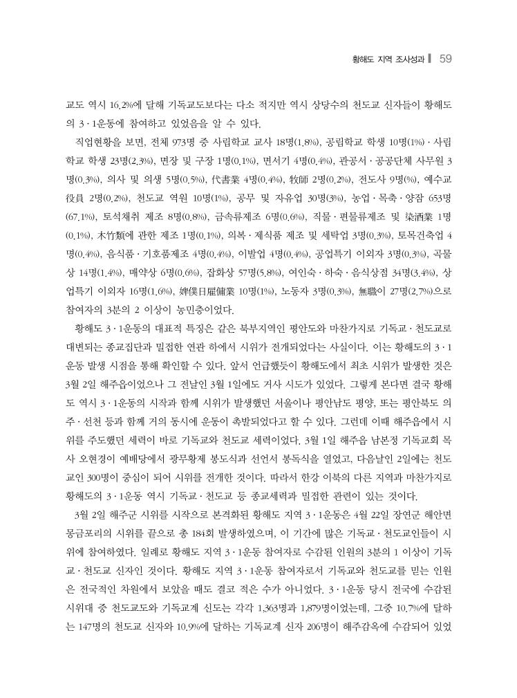황해도 지역 조사성과❙ 59 교도 역시 16.2%에 달해 기독교도보다는 다소 적지만 역시 상당수의 천도교 신자들이 황해도 의 3·1운동에 참여하고 있었음을 알 수 있다. 직업현황을 보면, 전체 973명 중 사립학교 교사 18명(1.8%), 공립학교 학생 10명(1%)·사립 학교 학생 23명(2.3%), 면장 및 구장 1명(0.1%), 면서기 4명(0.4%), 관공서·공공단체 사무원 3 명(0.3%), 의사 및 의생 5명(0.5%), 代書業 4명(0.4%), 牧師 2명(0.2%), 전도사 9명(%), 예수교 役員 2명(0.2%), 천도교 역원 10명(1%), 공무 및 자유업 30명(3%), 농업·목축·양잠 653명 (67.1%), 토석채취 제조 8명(0.8%), 금속류제조 6명(0.6%), 직물·편물류제조 및 染酒業 1명 (0.1%), 木竹類에 관한 제조 1명(0.1%), 의복·제식품 제조 및 세탁업 3명(0.3%), 토목건축업 4 명(0.4%), 음식품·기호품제조 4명(0.4%), 이발업 4명(0.4%), 공업특기 이외자 3명(0.3%), 곡물 상 14명(1.4%), 매약상 6명(0.6%), 잡화상 57명(5.8%), 여인숙·하숙·음식상점 34명(3.4%), 상 업특기 이외자 16명(1.6%), 婢僕日雇傭業 10명(1%), 노동자 3명(0.3%), 無職이 27명(2.7%)으로 참여자의 3분의 2 이상이 농민층이었다. 황해도 3·1운동의 대표적 특징은 같은 북부지역인 평안도와 마찬가지로 기독교·천도교로 대변되는 종교집단과 밀접한 연관 하에서 시위가 전개되었다는 사실이다. 이는 황해도의 3·1 운동 발생 시점을 통해 확인할 수 있다. 앞서 언급했듯이 황해도에서 최초 시위가 발생한 것은 3월 2일 해주읍이었으나 그 전날인 3월 1일에도 거사 시도가 있었다. 그렇게 본다면 결국 황해 도 역시 3·1운동의 시작과 함께 시위가 발생했던 서울이나 평안남도 평양, 또는 평안북도 의 주·선천 등과 함께 거의 동시에 운동이 촉발되었다고 할 수 있다. 그런데 이때 해주읍에서 시 위를 주도했던 세력이 바로 기독교와 천도교 세력이었다. 3월 1일 해주읍 남본정 기독교회 목 사 오현경이 예배당에서 광무황제 봉도식과 선언서 봉독식을 열었고, 다음날인 2일에는 천도 교인 300명이 중심이 되어 시위를 전개한 것이다. 따라서 한강 이북의 다른 지역과 마찬가지로 황해도의 3·1운동 역시 기독교·천도교 등 종교세력과 밀접한 관련이 있는 것이다. 3월 2일 해주군 시위를 시작으로 본격화된 황해도 지역 3·1운동은 4월 22일 장연군 해안면 몽금포리의 시위를 끝으로 총 184회 발생하였으며, 이 기간에 많은 기독교·천도교인들이 시 위에 참여하였다. 일례로 황해도 지역 3·1운동 참여자로 수감된 인원의 3분의 1 이상이 기독 교·천도교 신자인 것이다. 황해도 지역 3·1운동 참여자로서 기독교와 천도교를 믿는 인원 은 전국적인 차원에서 보았을 때도 결코 적은 수가 아니었다. 3·1운동 당시 전국에 수감된 시위대 중 천도교도와 기독교계 신도는 각각 1,363명과 1,879명이었는데, 그중 10.7%에 달하 는 147명의 천도교 신자와 10.9%에 달하는 기독교계 신자 206명이 해주감옥에 수감되어 있었