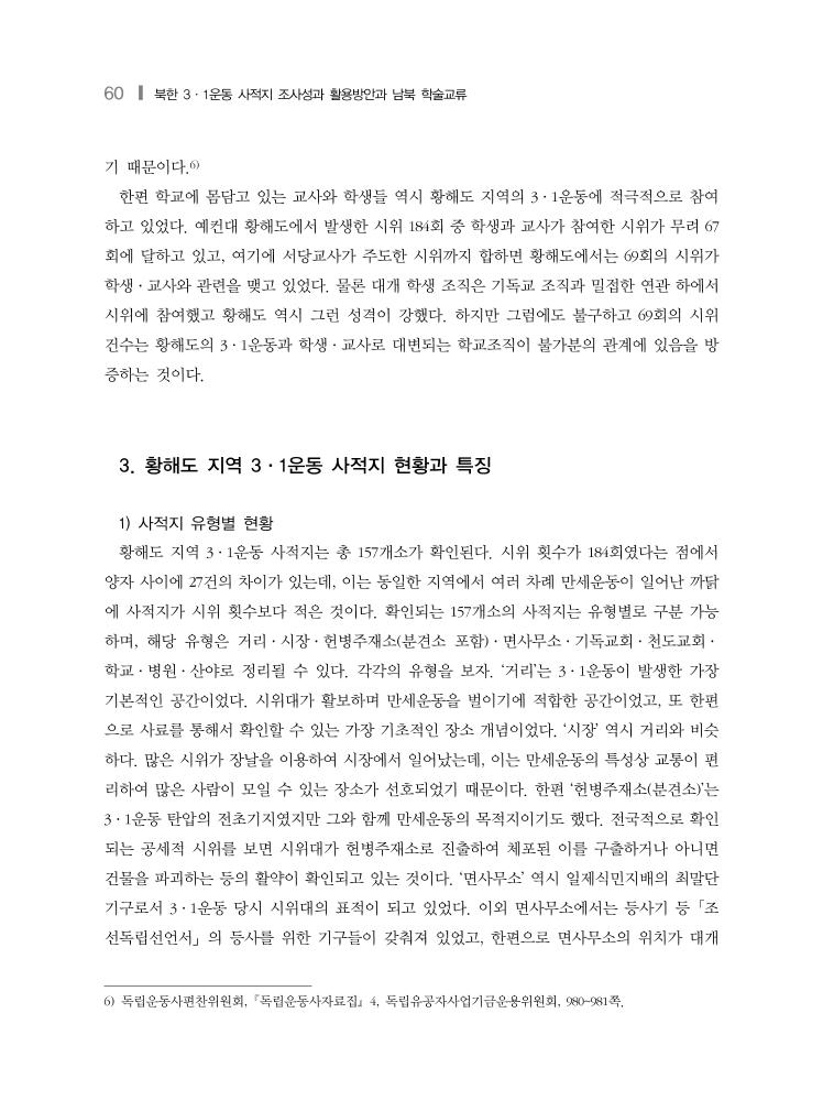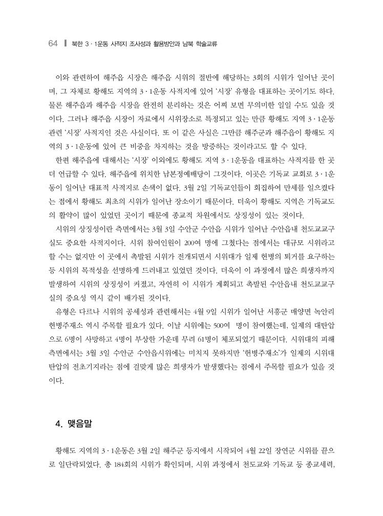 64 ❙ 북한 3·1운동 사적지 조사성과 활용방안과 남북 학술교류 이와 관련하여 해주읍 시장은 해주읍 시위의 절반에 해당하는 3회의 시위가 일어난 곳이 며, 그 자체로 황해도 지역의 3·1운동 사적지에 있어 ‘시장’ 유형을 대표하는 곳이기도 하다. 물론 해주읍과 해주읍 시장을 완전히 분리하는 것은 어찌 보면 무의미한 일일 수도 있을 것 이다. 그러나 해주읍 시장이 자료에서 시위장소로 특정되고 있는 만큼 황해도 지역 3·1운동 관련 ‘시장’ 사적지인 것은 사실이다. 또 이 같은 사실은 그만큼 해주군과 해주읍이 황해도 지 역의 3·1운동에 있어 큰 비중을 차지하는 것을 방증하는 것이라고도 할 수 있다. 한편 해주읍에 대해서는 ‘시장’ 이외에도 황해도 지역 3·1운동을 대표하는 사적지를 한 곳 더 언급할 수 있다. 해주읍에 위치한 남본정예배당이 그것이다. 이곳은 기독교 교회로 3·1운 동이 일어난 대표적 사적지로 손색이 없다. 3월 2일 기독교인들이 회집하여 만세를 일으켰다 는 점에서 황해도 최초의 시위가 일어난 장소이기 때문이다. 더욱이 황해도 지역은 기독교도 의 활약이 많이 있었던 곳이기 때문에 종교적 차원에서도 상징성이 있는 것이다. 시위의 상징성이란 측면에서는 3월 3일 수안군 수안읍 시위가 일어난 수안읍내 천도교교구 실도 중요한 사적지이다. 시위 참여인원이 200여 명에 그쳤다는 점에서는 대규모 시위라고 할 수는 없지만 이 곳에서 촉발된 시위가 전개되면서 시위대가 일제 헌병의 퇴거를 요구하는 등 시위의 목적성을 선명하게 드러내고 있었던 것이다. 더욱이 이 과정에서 많은 희생자까지 발생하여 시위의 상징성이 커졌고, 자연히 이 시위가 계획되고 촉발된 수안읍내 천도교교구 실의 중요성 역시 같이 배가된 것이다. 유형은 다르나 시위의 공세성과 관련해서는 4월 9일 시위가 일어난 서흥군 매양면 녹안리 헌병주재소 역시 주목할 필요가 있다. 이날 시위에는 500여 명이 참여했는데, 일제의 대탄압 으로 6명이 사망하고 4명이 부상한 가운데 무려 61명이 체포되었기 때문이다. 시위대의 피해 측면에서는 3월 3일 수안군 수안읍시위에는 미치지 못하지만 ‘헌병주재소’가 일제의 시위대 탄압의 전초기지라는 점에 걸맞게 많은 희생자가 발생했다는 점에서 주목할 필요가 있을 것 이다. 4. 맺음말 황해도 지역의 3·1운동은 3월 2일 해주군 등지에서 시작되어 4월 22일 장연군 시위를 끝으 로 일단락되었다. 총 184회의 시위가 확인되며, 시위 과정에서 천도교와 기독교 등 종교세력,