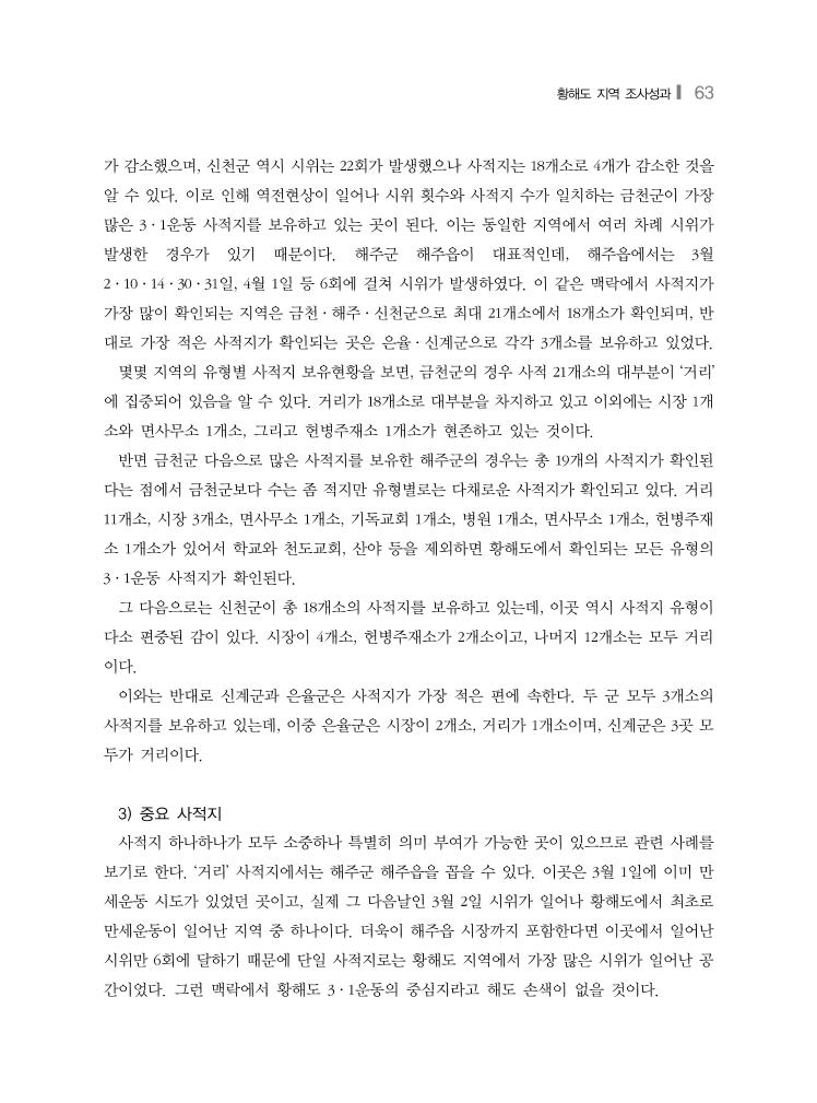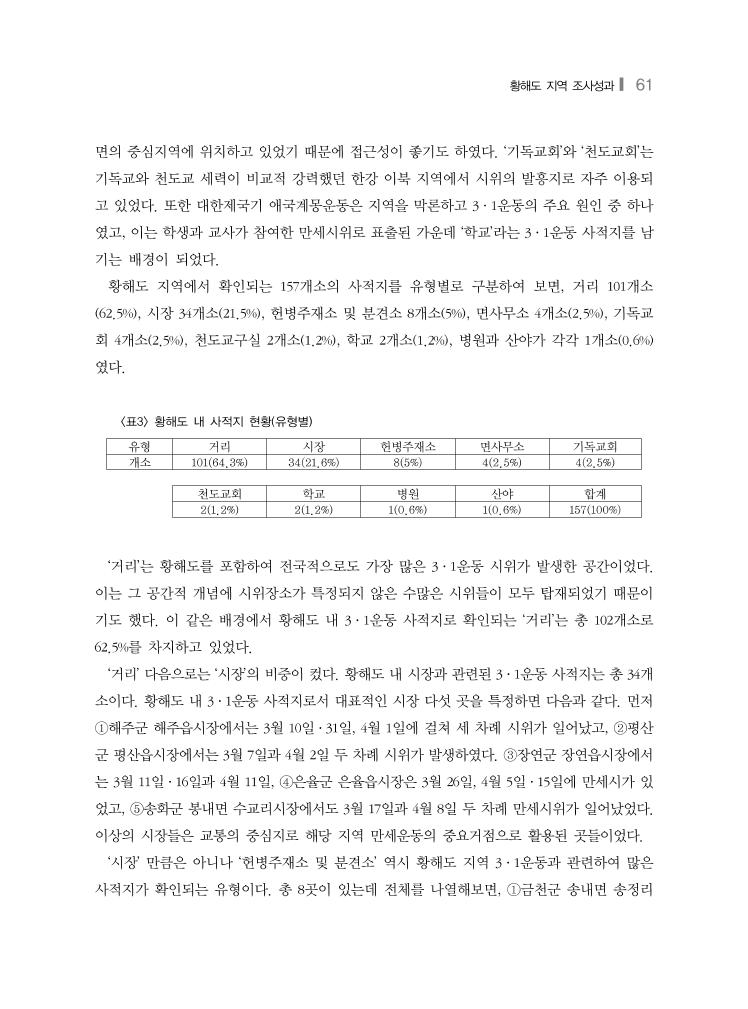 황해도 지역 조사성과❙ 61 유형 거리 시장 헌병주재소 면사무소 기독교회 개소 101(64.3%) 34(21.6%) 8(5%) 4(2.5%) 4(2.5%) 천도교회 학교 병원 산야 합계 2(1.2%) 2(1.2%) 1(0.6%) 1(0.6%) 157(100%) <표3> 황해도 내 사적지 현황(유형별) 면의 중심지역에 위치하고 있었기 때문에 접근성이 좋기도 하였다. ‘기독교회’와 ‘천도교회’는 기독교와 천도교 세력이 비교적 강력했던 한강 이북 지역에서 시위의 발흥지로 자주 이용되 고 있었다. 또한 대한제국기 애국계몽운동은 지역을 막론하고 3·1운동의 주요 원인 중 하나 였고, 이는 학생과 교사가 참여한 만세시위로 표출된 가운데 ‘학교’라는 3·1운동 사적지를 남 기는 배경이 되었다. 황해도 지역에서 확인되는 157개소의 사적지를 유형별로 구분하여 보면, 거리 101개소 (62.5%), 시장 34개소(21.5%), 헌병주재소 및 분견소 8개소(5%), 면사무소 4개소(2.5%), 기독교 회 4개소(2.5%), 천도교구실 2개소(1.2%), 학교 2개소(1.2%), 병원과 산야가 각각 1개소(0.6%) 였다. ‘거리’는 황해도를 포함하여 전국적으로도 가장 많은 3·1운동 시위가 발생한 공간이었다. 이는 그 공간적 개념에 시위장소가 특정되지 않은 수많은 시위들이 모두 탑재되었기 때문이 기도 했다. 이 같은 배경에서 황해도 내 3·1운동 사적지로 확인되는 ‘거리’는 총 102개소로 62.5%를 차지하고 있었다. ‘거리’ 다음으로는 ‘시장’의 비중이 컸다. 황해도 내 시장과 관련된 3·1운동 사적지는 총 34개 소이다. 황해도 내 3·1운동 사적지로서 대표적인 시장 다섯 곳을 특정하면 다음과 같다. 먼저 ①해주군 해주읍시장에서는 3월 10일·31일, 4월 1일에 걸쳐 세 차례 시위가 일어났고, ②평산 군 평산읍시장에서는 3월 7일과 4월 2일 두 차례 시위가 발생하였다. ③장연군 장연읍시장에서 는 3월 11일·16일과 4월 11일, ④은율군 은율읍시장은 3월 26일, 4월 5일·15일에 만세시가 있 었고, ⑤송화군 봉내면 수교리시장에서도 3월 17일과 4월 8일 두 차례 만세시위가 일어났었다. 이상의 시장들은 교통의 중심지로 해당 지역 만세운동의 중요거점으로 활용된 곳들이었다. ‘시장’ 만큼은 아니나 ‘헌병주재소 및 분견소’ 역시 황해도 지역 3·1운동과 관련하여 많은 사적지가 확인되는 유형이다. 총 8곳이 있는데 전체를 나열해보면, ①금천군 송내면 송정리