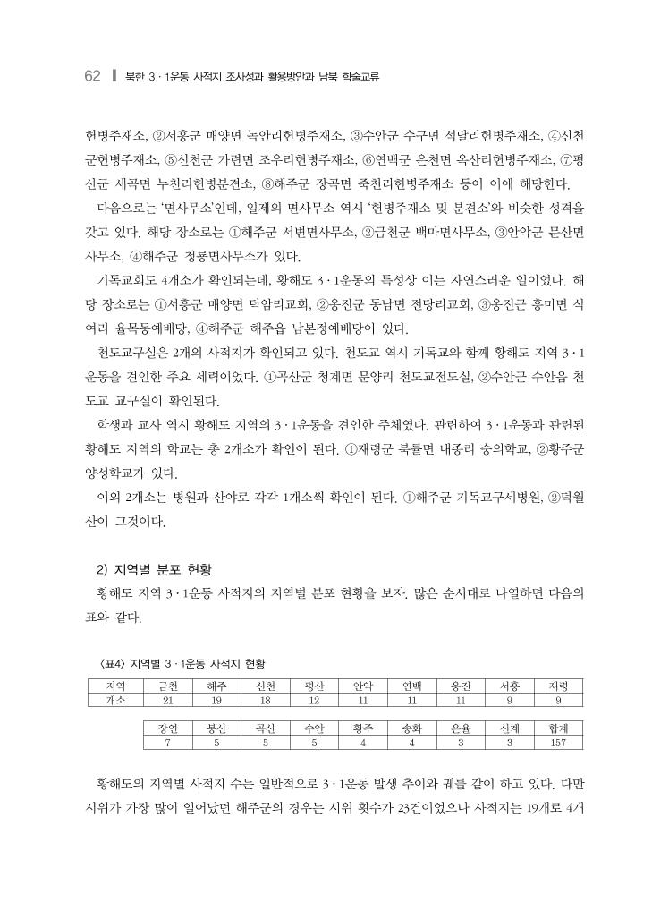 62 ❙ 북한 3·1운동 사적지 조사성과 활용방안과 남북 학술교류 지역 금천 해주 신천 평산 안악 연백 옹진 서흥 재령 개소 21 19 18 12 11 11 11 9 9 장연 봉산 곡산 수안 황주 송화 은율 신계 합계 7 5 5 5 4 4 3 3 157 <표4> 지역별 3·1운동 사적지 현황 헌병주재소, ②서흥군 매양면 녹안리헌병주재소, ③수안군 수구면 석달리헌병주재소, ④신천 군헌병주재소, ⑤신천군 가련면 조우리헌병주재소, ⑥연백군 은천면 옥산리헌병주재소, ⑦평 산군 세곡면 누천리헌병분견소, ⑧해주군 장곡면 죽천리헌병주재소 등이 이에 해당한다. 다음으로는 ‘면사무소’인데, 일제의 면사무소 역시 ‘헌병주재소 및 분견소’와 비슷한 성격을 갖고 있다. 해당 장소로는 ①해주군 서변면사무소, ②금천군 백마면사무소, ③안악군 문산면 사무소, ④해주군 청룡면사무소가 있다. 기독교회도 4개소가 확인되는데, 황해도 3·1운동의 특성상 이는 자연스러운 일이었다. 해 당 장소로는 ①서흥군 매양면 덕암리교회, ②옹진군 동남면 전당리교회, ③옹진군 흥미면 식 여리 율목동예배당, ④해주군 해주읍 남본정예배당이 있다. 천도교구실은 2개의 사적지가 확인되고 있다. 천도교 역시 기독교와 함께 황해도 지역 3·1 운동을 견인한 주요 세력이었다. ①곡산군 청계면 문양리 천도교전도실, ②수안군 수안읍 천 도교 교구실이 확인된다. 학생과 교사 역시 황해도 지역의 3·1운동을 견인한 주체였다. 관련하여 3·1운동과 관련된 황해도 지역의 학교는 총 2개소가 확인이 된다. ①재령군 북률면 내종리 숭의학교, ②황주군 양성학교가 있다. 이외 2개소는 병원과 산야로 각각 1개소씩 확인이 된다. ①해주군 기독교구세병원, ②덕월 산이 그것이다. 2) 지역별 분포 현황 황해도 지역 3·1운동 사적지의 지역별 분포 현황을 보자. 많은 순서대로 나열하면 다음의 표와 같다. 황해도의 지역별 사적지 수는 일반적으로 3·1운동 발생 추이와 궤를 같이 하고 있다. 다만 시위가 가장 많이 일어났던 해주군의 경우는 시위 횟수가 23건이었으나 사적지는 19개로 4개
