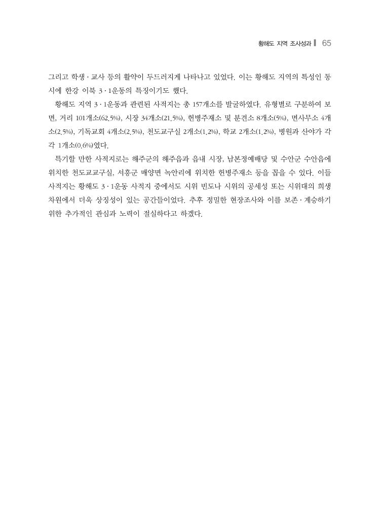 황해도 지역 조사성과❙ 65 그리고 학생·교사 등의 활약이 두드러지게 나타나고 있었다. 이는 황해도 지역의 특성인 동 시에 한강 이북 3·1운동의 특징이기도 했다. 황해도 지역 3·1운동과 관련된 사적지는 총 157개소를 발굴하였다. 유형별로 구분하여 보 면, 거리 101개소(62.5%), 시장 34개소(21.5%), 헌병주재소 및 분견소 8개소(5%), 면사무소 4개 소(2.5%), 기독교회 4개소(2.5%), 천도교구실 2개소(1.2%), 학교 2개소(1.2%), 병원과 산야가 각 각 1개소(0.6%)였다. 특기할 만한 사적지로는 해주군의 해주읍과 읍내 시장, 남본정예배당 및 수안군 수안읍에 위치한 천도교교구실, 서흥군 매양면 녹안리에 위치한 헌병주재소 등을 꼽을 수 있다. 이들 사적지는 황해도 3·1운동 사적지 중에서도 시위 빈도나 시위의 공세성 또는 시위대의 희생 차원에서 더욱 상징성이 있는 공간들이었다. 추후 정밀한 현장조사와 이를 보존·계승하기 위한 추가적인 관심과 노력이 절실하다고 하겠다.