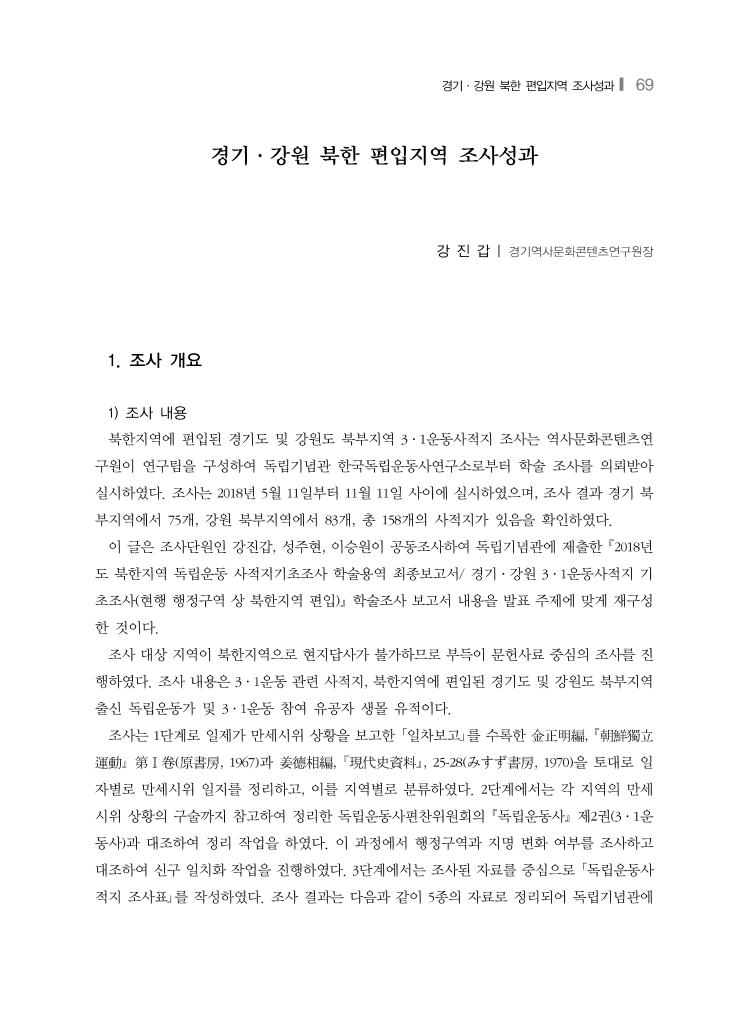 경기·강원 북한 편입지역 조사성과❙ 69 경기·강원 북한 편입지역 조사성과 강 진 갑 | 경기역사문화콘텐츠연구원장 1. 조사 개요 1) 조사 내용 북한지역에 편입된 경기도 및 강원도 북부지역 3·1운동사적지 조사는 역사문화콘텐츠연 구원이 연구팀을 구성하여 독립기념관 한국독립운동사연구소로부터 학술 조사를 의뢰받아 실시하였다. 조사는 2018년 5월 11일부터 11월 11일 사이에 실시하였으며, 조사 결과 경기 북 부지역에서 75개, 강원 북부지역에서 83개, 총 158개의 사적지가 있음을 확인하였다. 이 글은 조사단원인 강진갑, 성주현, 이승원이 공동조사하여 독립기념관에 제출한 2018년 도 북한지역 독립운동 사적지기초조사 학술용역 최종보고서/ 경기·강원 3·1운동사적지 기 초조사(현행 행정구역 상 북한지역 편입) 학술조사 보고서 내용을 발표 주제에 맞게 재구성 한 것이다. 조사 대상 지역이 북한지역으로 현지답사가 불가하므로 부득이 문헌사료 중심의 조사를 진 행하였다. 조사 내용은 3·1운동 관련 사적지, 북한지역에 편입된 경기도 및 강원도 북부지역 출신 독립운동가 및 3·1운동 참여 유공자 생몰 유적이다. 조사는 1단계로 일제가 만세시위 상황을 보고한 「일차보고」를 수록한 金正明編, 朝鮮獨立 運動 第Ⅰ卷(原書房, 1967)과 姜德相編, 現代史資料, 25-28(みすず書房, 1970)을 토대로 일 자별로 만세시위 일지를 정리하고, 이를 지역별로 분류하였다. 2단계에서는 각 지역의 만세 시위 상황의 구술까지 참고하여 정리한 독립운동사편찬위원회의 독립운동사 제2권(3·1운 동사)과 대조하여 정리 작업을 하였다. 이 과정에서 행정구역과 지명 변화 여부를 조사하고 대조하여 신구 일치화 작업을 진행하였다. 3단계에서는 조사된 자료를 중심으로 「독립운동사 적지 조사표」를 작성하였다. 조사 결과는 다음과 같이 5종의 자료로 정리되어 독립기념관에
