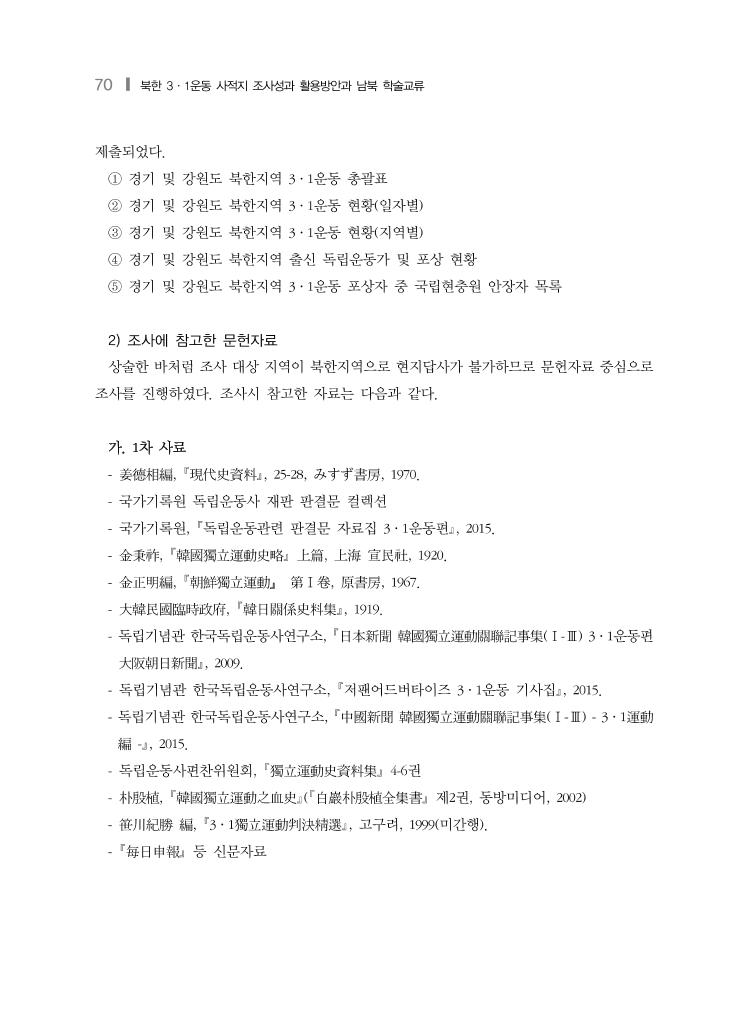 70 ❙ 북한 3·1운동 사적지 조사성과 활용방안과 남북 학술교류 제출되었다. ① 경기 및 강원도 북한지역 3·1운동 총괄표 ② 경기 및 강원도 북한지역 3·1운동 현황(일자별) ③ 경기 및 강원도 북한지역 3·1운동 현황(지역별) ④ 경기 및 강원도 북한지역 출신 독립운동가 및 포상 현황 ⑤ 경기 및 강원도 북한지역 3·1운동 포상자 중 국립현충원 안장자 목록 2) 조사에 참고한 문헌자료 상술한 바처럼 조사 대상 지역이 북한지역으로 현지답사가 불가하므로 문헌자료 중심으로 조사를 진행하였다. 조사시 참고한 자료는 다음과 같다. 가. 1차 사료 - 姜德相編, 現代史資料, 25-28, みすず書房, 1970. - 국가기록원 독립운동사 재판 판결문 컬렉션 - 국가기록원, 독립운동관련 판결문 자료집 3·1운동편, 2015. - 金秉祚, 韓國獨立運動史略 上篇, 上海 宣民社, 1920. - 金正明編, 朝鮮獨立運動』 第Ⅰ卷, 原書房, 1967. - 大韓民國臨時政府, 韓日關係史料集, 1919. - 독립기념관 한국독립운동사연구소, 日本新聞 韓國獨立運動關聯記事集(Ⅰ-Ⅲ) 3·1운동편 大阪朝日新聞, 2009. - 독립기념관 한국독립운동사연구소, 저팬어드버타이즈 3·1운동 기사집, 2015. - 독립기념관 한국독립운동사연구소, 中國新聞 韓國獨立運動關聯記事集(Ⅰ-Ⅲ) - 3·1運動 編 -, 2015. - 독립운동사편찬위원회, 獨立運動史資料集 4-6권 - 朴殷植, 韓國獨立運動之血史(白巖朴殷植全集書 제2권, 동방미디어, 2002) - 笹川紀勝 編, 3·1獨立運動判決精選, 고구려, 1999(미간행). - 每日申報 등 신문자료