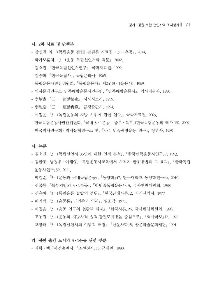 경기·강원 북한 편입지역 조사성과❙ 71 나. 2차 사료 및 단행본 - 강성천 외, (독립운동 관련) 판결문 자료집 : 3·1운동, 2014. - 국가보훈처, 3·1운동 독립선언서와 격문, 2002. - 김소진, 한국독립선언서연구, 국학자료원, 1999. - 김승학, 한국독립사, 독립문화사, 1965. - 독립운동사편찬위원회, 독립운동사 제2권(3·1운동사), 1969. - 역사문제연구소 민족해방운동사연구반, 민족해방운동사, 역사비평사, 1990. - 李炳憲, 三·一運動秘史, 시사시보사, 1959. - 李龍洛, 三·一運動實錄, 금정출판사, 1994. - 이정은, 3·1독립운동의 지방 시위에 관한 연구, 국학자료원, 2009. - 한국독립운동사편찬위원회, 국내 3·1운동 - 중부·북부(한국독립운동의 역사 19), 2009. - 한국역사연구회·역사문제연구소 편, 3·1 민족해방운동 연구, 청년사, 1989. 다. 논문 - 김소진, 「3·1독립선언서 33인에 대한 인적 분석」, 한국민족운동사연구7, 1993. - 김한종·남정우·이해영, 「독립운동사교육에서 사적지 활용방법과 그 효과」, 한국독립 운동사연구39, 2011. - 박걸순, 「3·1운동과 국내독립운동」, 동양학47, 단국대학교 동양학연구소, 2010. - 신복룡, 「북부지방의 3·1운동」, 한민족독립운동사3, 국사편찬위원회, 1988. - 신용하, 「3·1독립운동 발발의 경위」, 한국근대사론2, 지식산업사, 1977. - 이기백, 「3·1운동론」,민족과 역사, 일조각, 1971. - 이정은, 「3·1운동 연구의 현황과 과제」, 한국사론26, 국사편찬위원회, 1996. - 조동걸, 「3·1운동의 지방사적 성격-강원도지방을 중심으로」, 역사학보47, 1970. - 조항래, 「3·1독립선언서의 이념적 배경」, 산운사학5, 산운학술문화재단, 1991. 라. 북한 출간 도서의 3·1운동 관련 부분 - 과학·백과사전출판사, 조선전사15 근대편, 1980.