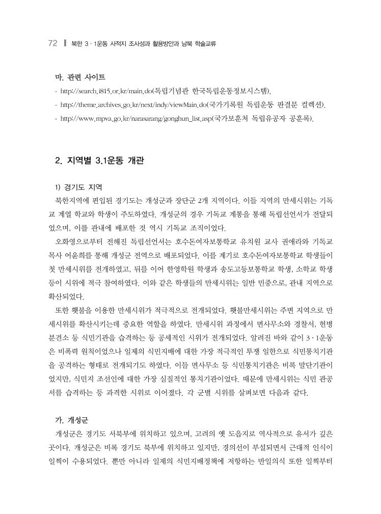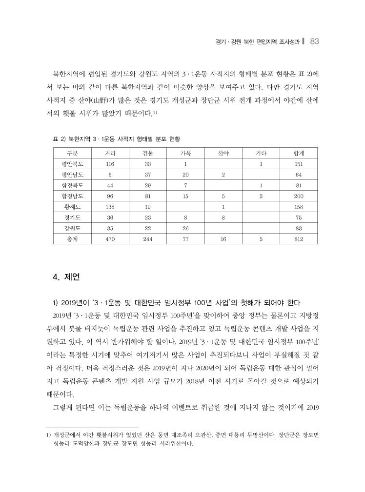 경기·강원 북한 편입지역 조사성과❙ 83 북한지역에 편입된 경기도와 강원도 지역의 3·1운동 사적지의 형태별 분포 현황은 표 2)에 서 보는 바와 같이 다른 북한지역과 같이 비슷한 양상을 보여주고 있다. 다만 경기도 지역 사적지 중 산야(山野)가 많은 것은 경기도 개성군과 장단군 시위 전개 과정에서 야간에 산에 서의 횃불 시위가 많았기 때문이다.1) 표 2) 북한지역 3·1운동 사적지 형태별 분포 현황 구분 거리 건물 가옥 산야 기타 합계 평안북도 116 33 1 1 151 평안남도 5 37 20 2 64 함경북도 44 29 7 1 81 함경남도 96 81 15 5 3 200 황해도 138 19 1 158 경기도 36 23 8 8 75 강원도 35 22 26 83 총계 470 244 77 16 5 812 4. 제언 1) 2019년이 ‘3·1운동 및 대한민국 임시정부 100년 사업’의 첫해가 되어야 한다 2019년 ‘3·1운동 및 대한민국 임시정부 100주년’을 맞이하여 중앙 정부는 물론이고 지방정 부에서 봇물 터지듯이 독립운동 관련 사업을 추진하고 있고 독립운동 콘텐츠 개발 사업을 지 원하고 있다. 이 역시 반가워해야 할 일이나, 2019년 ‘3·1운동 및 대한민국 임시정부 100주년’ 이라는 특정한 시기에 맞추어 여기저기서 많은 사업이 추진되다보니 사업이 부실해질 것 같 아 걱정이다. 더욱 걱정스러운 것은 2019년이 지나 2020년이 되어 독립운동 대한 관심이 멀어 지고 독립운동 콘텐츠 개발 지원 사업 규모가 2018년 이전 시기로 돌아갈 것으로 예상되기 때문이다. 그렇게 된다면 이는 독립운동을 하나의 이벤트로 취급한 것에 지나지 않는 것이기에 2019 1) 개성군에서 야간 횃불시위가 있었던 산은 동면 대조족리 오관산, 중면 대룡리 무명산이다. 장단군은 장도면 항동리 도덕암산과 장단군 장도면 항동리 시라위산이다.