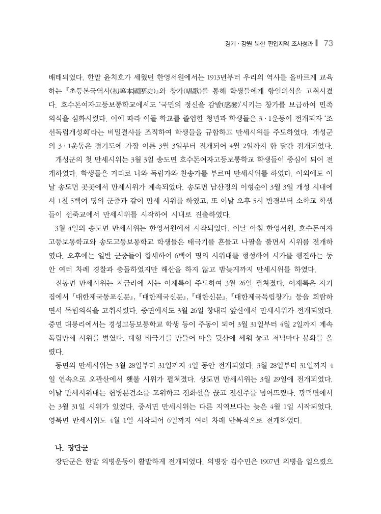 경기·강원 북한 편입지역 조사성과❙ 73 배태되었다. 한말 윤치호가 세웠던 한영서원에서는 1913년부터 우리의 역사를 올바르게 교육 하는 초등본국역사(初等本國歷史)와 창가(唱歌)를 통해 학생들에게 항일의식을 고취시켰 다. 호수돈여자고등보통학교에서도 ‘국민의 정신을 감발(感發)’시키는 창가를 보급하여 민족 의식을 심화시켰다. 이에 따라 이들 학교를 졸업한 청년과 학생들은 3·1운동이 전개되자 ‘조 선독립개성회’라는 비밀결사를 조직하여 학생들을 규합하고 만세시위를 주도하였다. 개성군 의 3·1운동은 경기도에 가장 이른 3월 3일부터 전개되어 4월 2일까지 한 달간 전개되었다. 개성군의 첫 만세시위는 3월 3일 송도면 호수돈여자고등보통학교 학생들이 중심이 되어 전 개하였다. 학생들은 거리로 나와 독립가와 찬송가를 부르며 만세시위를 하였다. 이외에도 이 날 송도면 곳곳에서 만세시위가 계속되었다. 송도면 남산정의 이형순이 3월 3일 개성 시내에 서 1천 5백여 명의 군중과 같이 만세 시위를 하였고, 또 이날 오후 5시 반경부터 소학교 학생 들이 선죽교에서 만세시위를 시작하여 시내로 진출하였다. 3월 4일의 송도면 만세시위는 한영서원에서 시작되었다. 이날 아침 한영서원, 호수돈여자 고등보통학교와 송도고등보통학교 학생들은 태극기를 흔들고 나팔을 불면서 시위를 전개하 였다. 오후에는 일반 군중들이 합세하여 6백여 명의 시위대를 형성하여 시가를 행진하는 동 안 여러 차례 경찰과 충돌하였지만 해산을 하지 않고 밤늦게까지 만세시위를 하였다. 진봉면 만세시위는 지금리에 사는 이재록이 주도하여 3월 26일 펼쳐졌다. 이재록은 자기 집에서 대한제국동포신문, 대한제국신문, 대한신문, 대한제국독립창가 등을 회람하 면서 독립의식을 고취시켰다. 중면에서도 3월 26일 창내리 앞산에서 만세시위가 전개되었다. 중면 대룡리에서는 경성고등보통학교 학생 등이 주동이 되어 3월 31일부터 4월 2일까지 계속 독립만세 시위를 벌였다. 대형 태극기를 만들어 마을 뒷산에 세워 놓고 저녁마다 봉화를 올 렸다. 동면의 만세시위는 3월 28일부터 31일까지 4일 동안 전개되었다. 3월 28일부터 31일까지 4 일 연속으로 오관산에서 횃불 시위가 펼쳐졌다. 상도면 만세시위는 3월 29일에 전개되었다. 이날 만세시위대는 헌병분견소를 포위하고 전화선을 끊고 전신주를 넘어뜨렸다. 광덕면에서 는 3월 31일 시위가 있었다. 중서면 만세시위는 다른 지역보다는 늦은 4월 1일 시작되었다. 영북면 만세시위도 4월 1일 시작되어 6일까지 여러 차례 반복적으로 전개하였다. 나. 장단군 장단군은 한말 의병운동이 활발하게 전개되었다. 의병장 김수민은 1907년 의병을 일으켰으